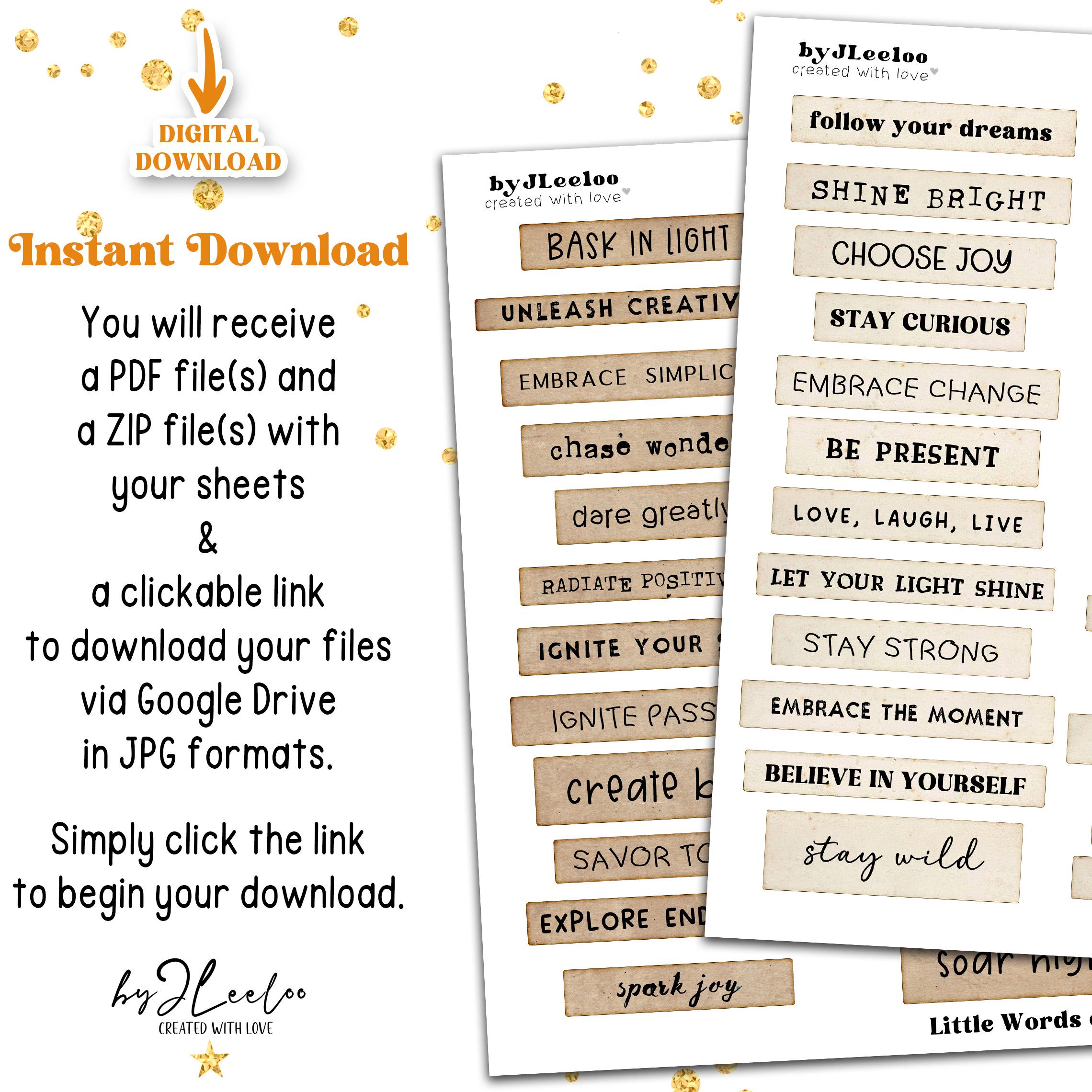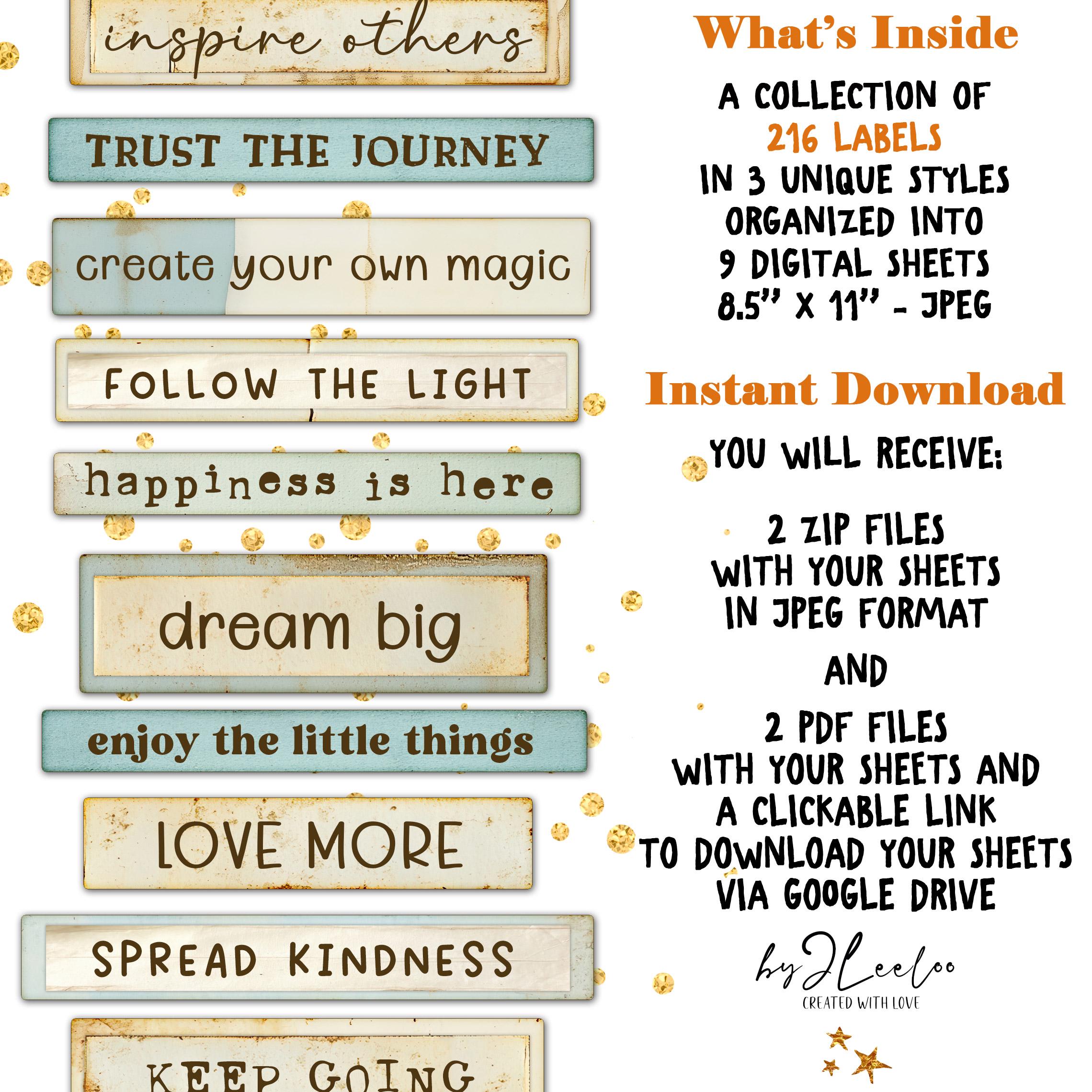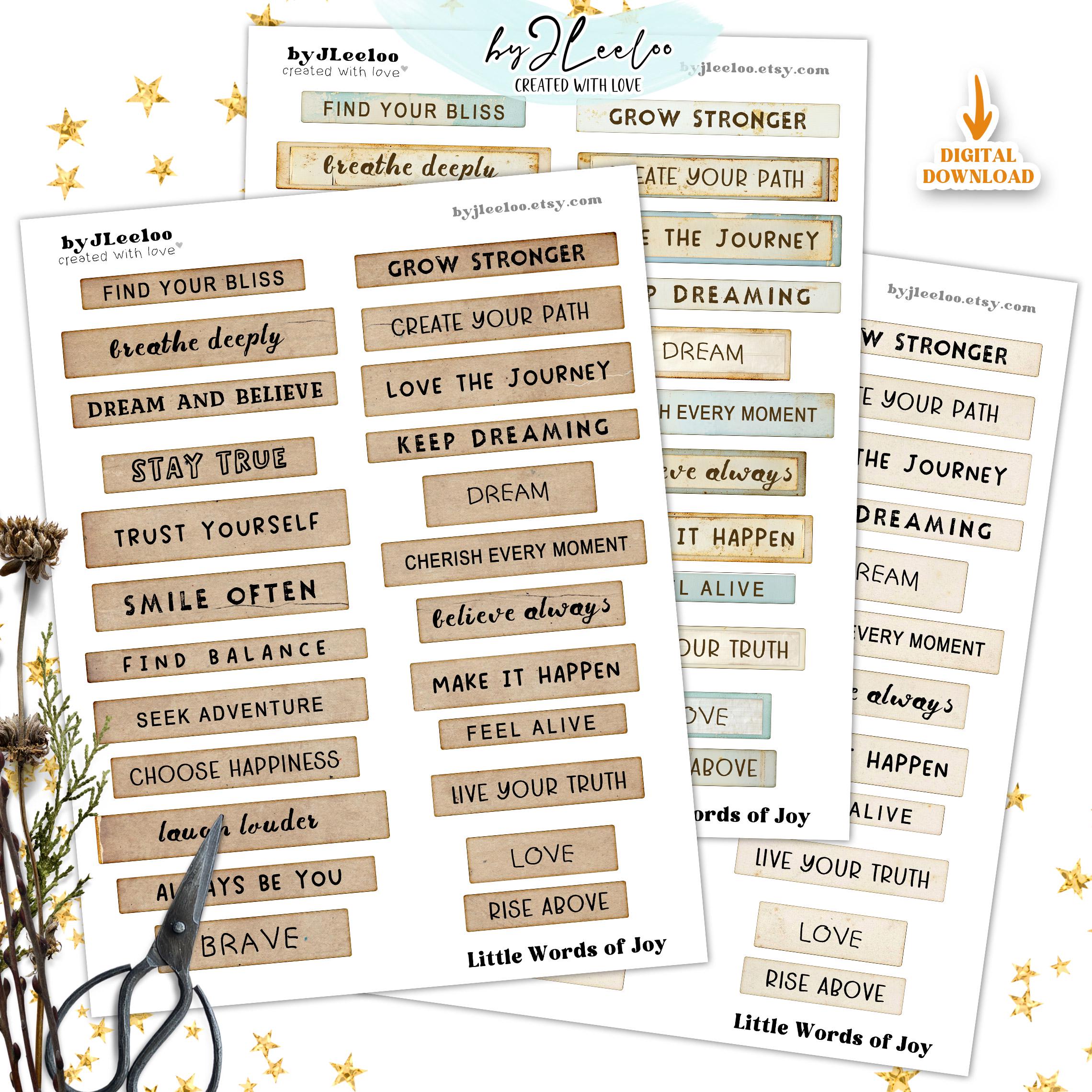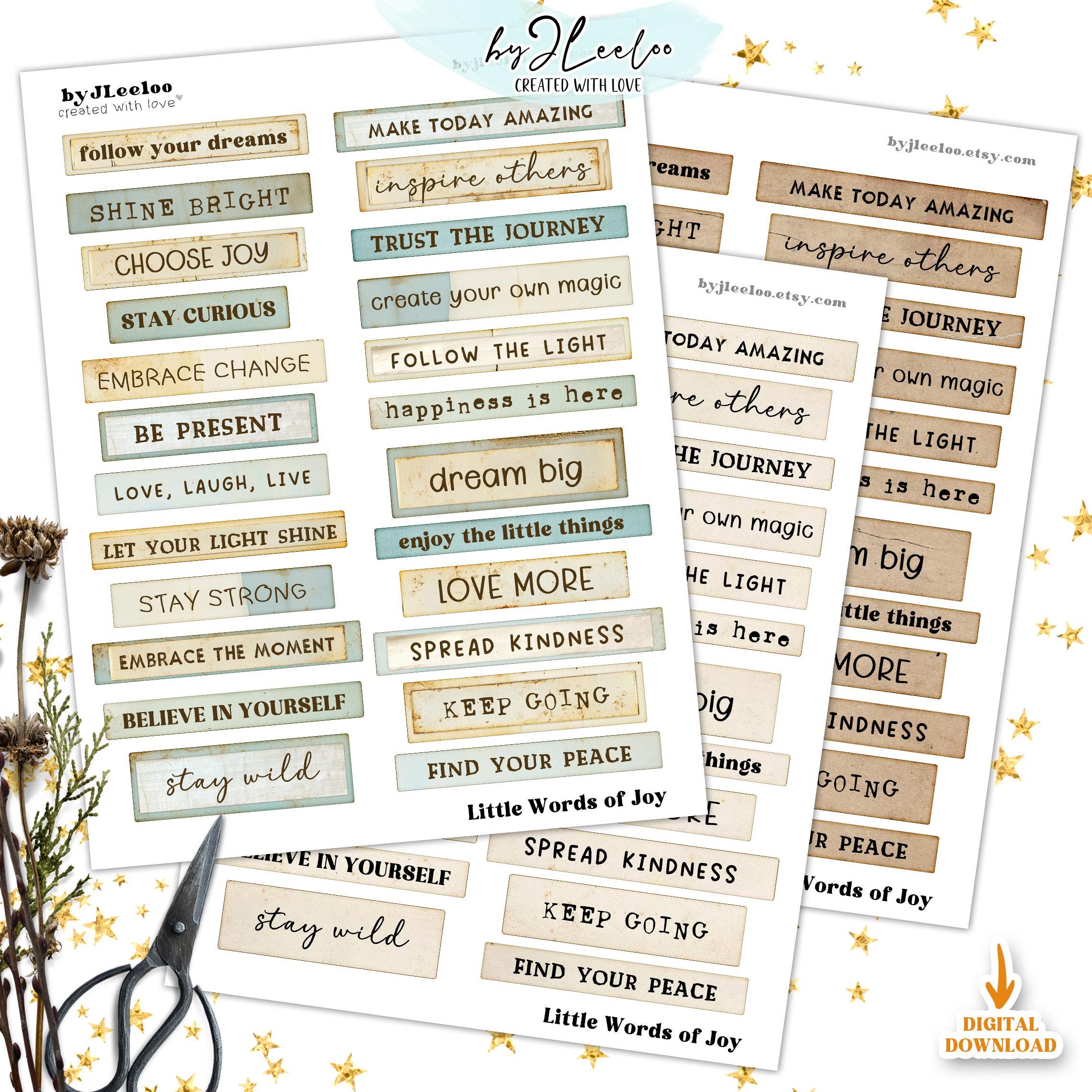 Sprinkle a little joy into your creative projects with LITTLE WORDS OF JOY! This collection features 216 beautifully crafted labels in 3 unique styles, packed with uplifting words and inspiring phrases. Whether you're working on junk journals, scrapbooks, card-making, or mixed media art, these labels are the perfect touch to bring warmth and positivity to your creations. Let your creativity flow and add a little magic to your craftsโbecause every project deserves a happy word! ๐