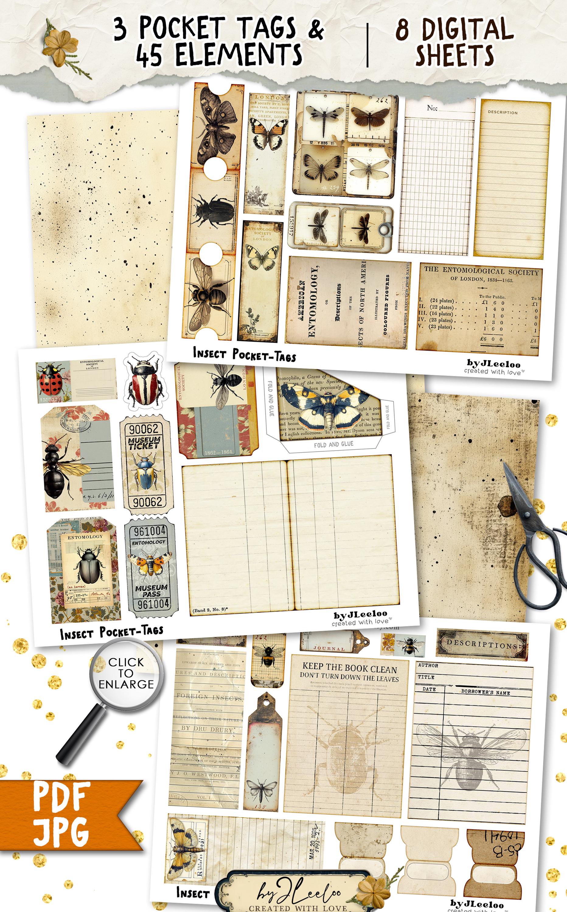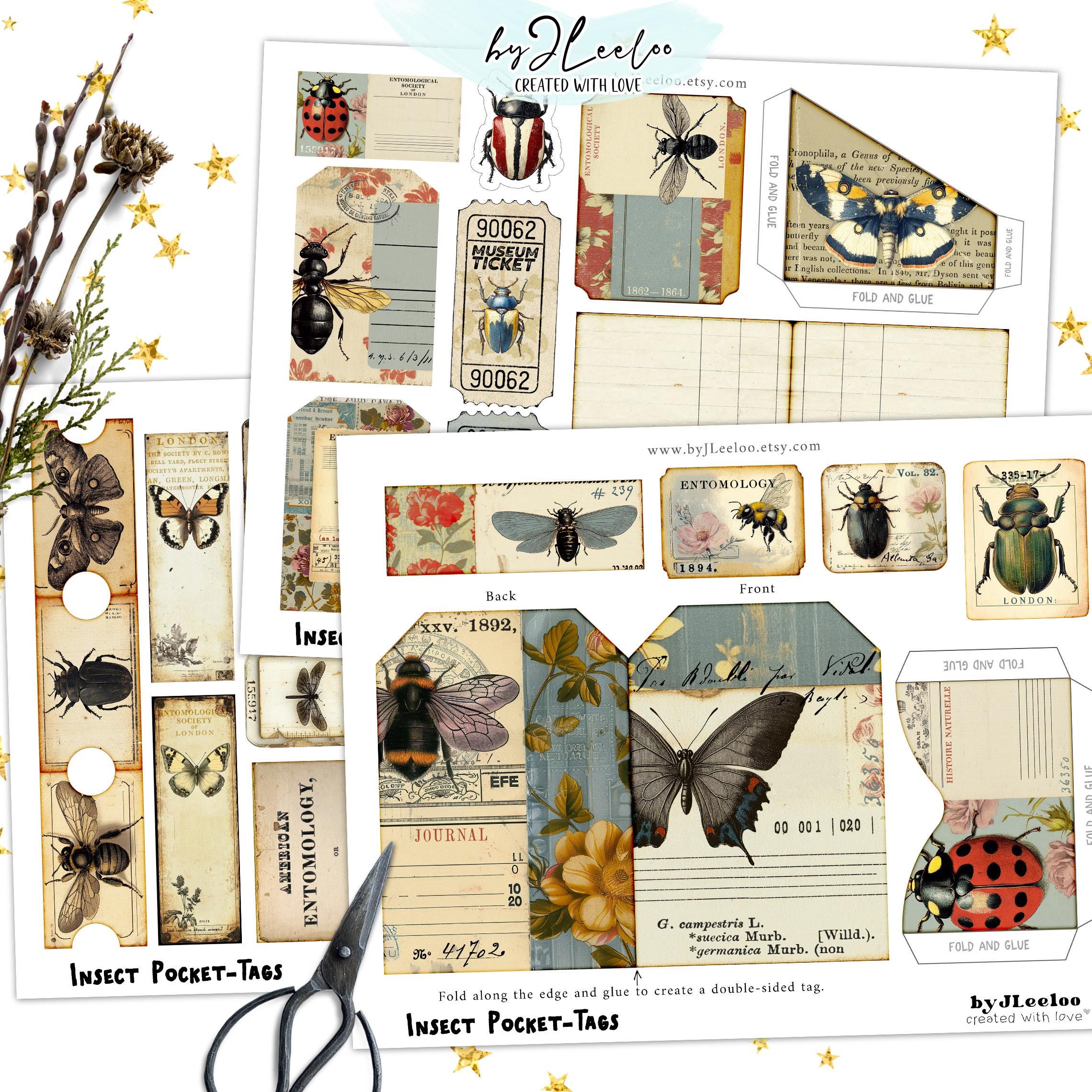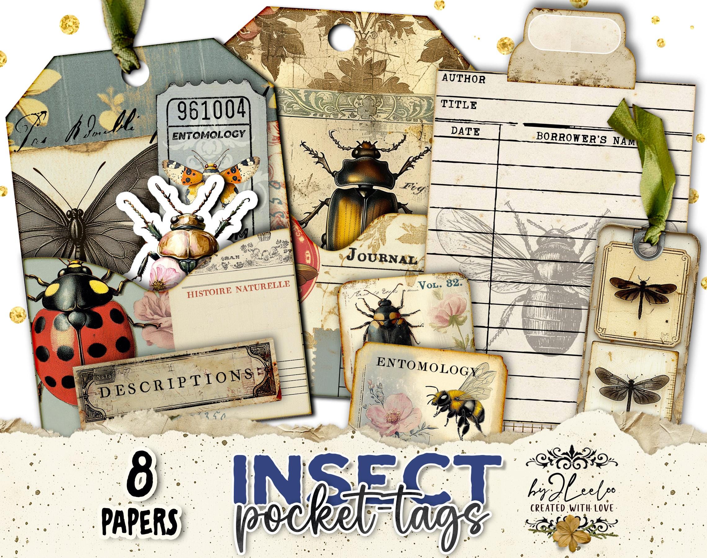 INSECT POCKET TAGS Kit with Backgrounds โ Vintage Entomology Ephemera for Junk Journals and Scrapbooking | Printable Pocket labels | tl321
