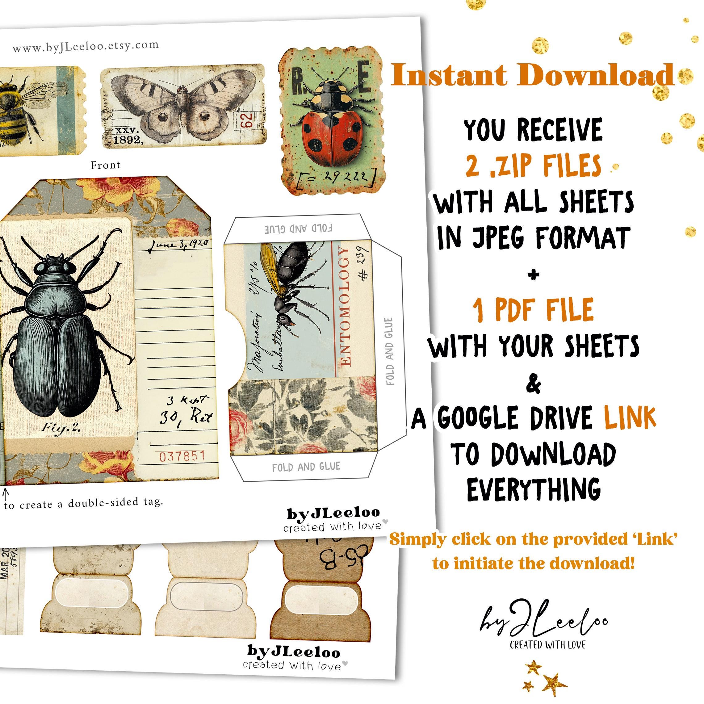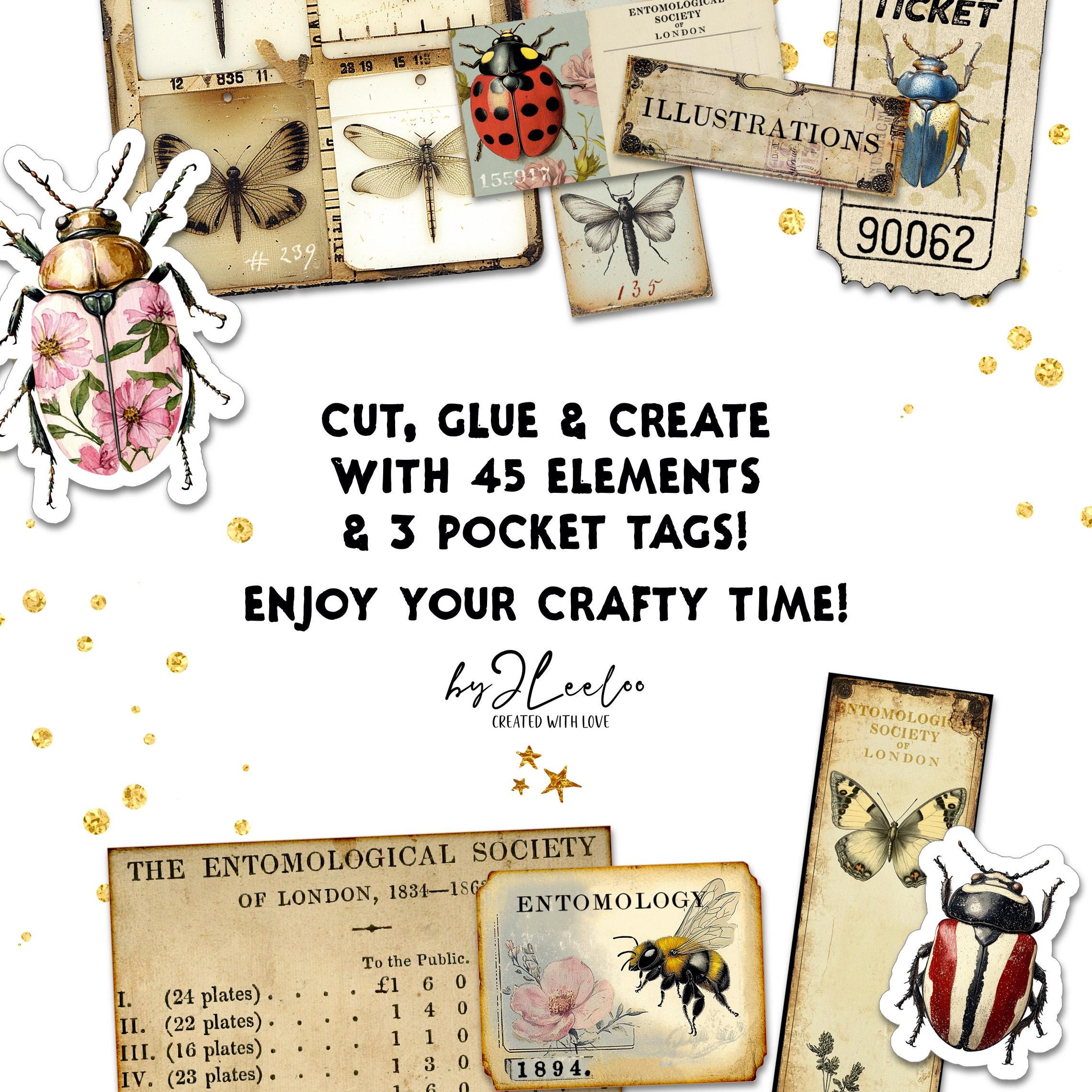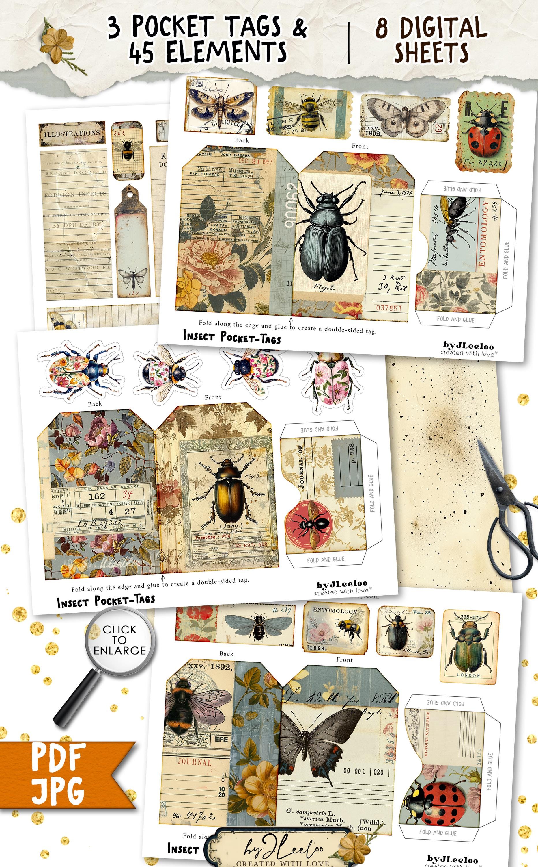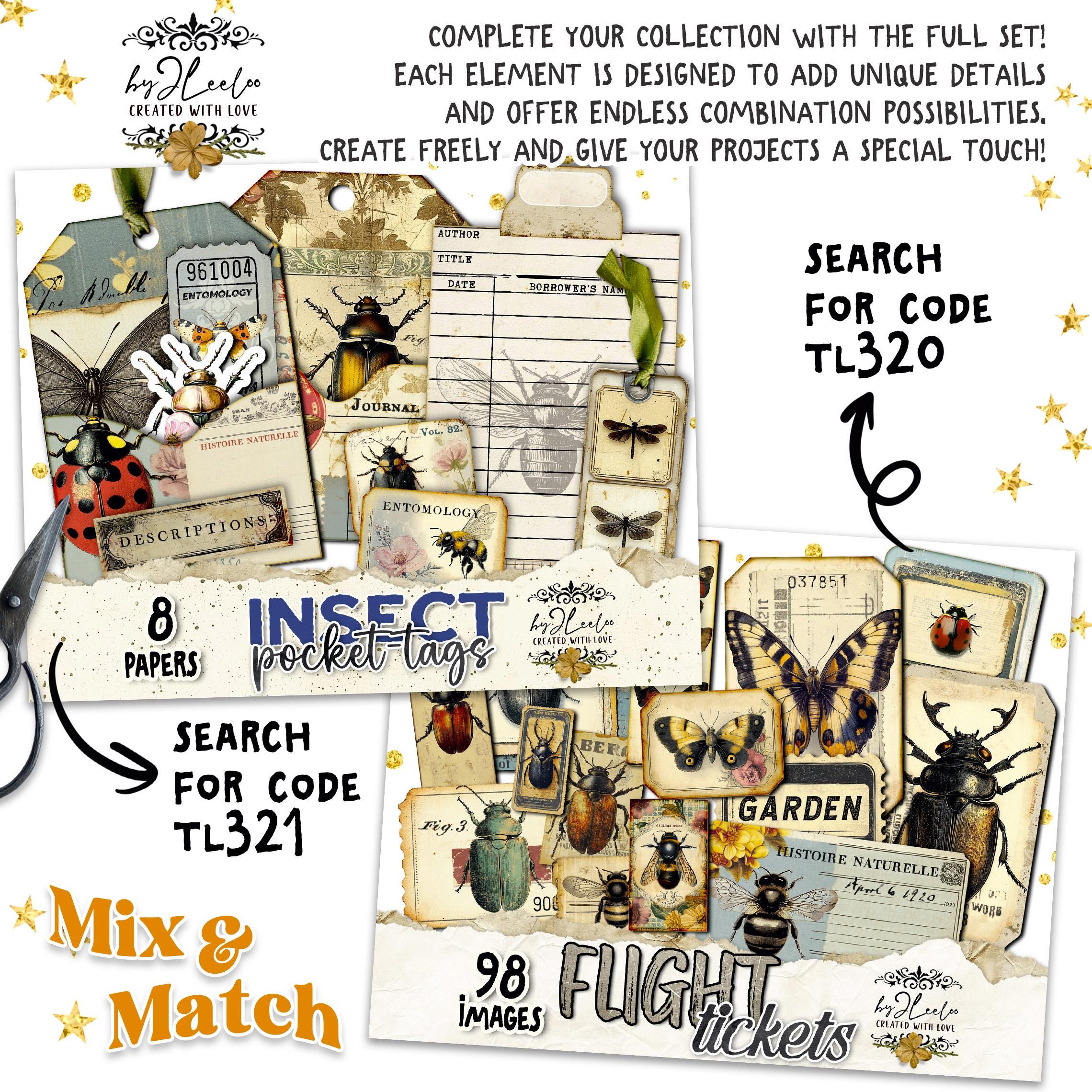 INSECT POCKET TAGS Kit with Backgrounds โ Vintage Entomology Ephemera for Junk Journals and Scrapbooking | Printable Pocket labels | tl321