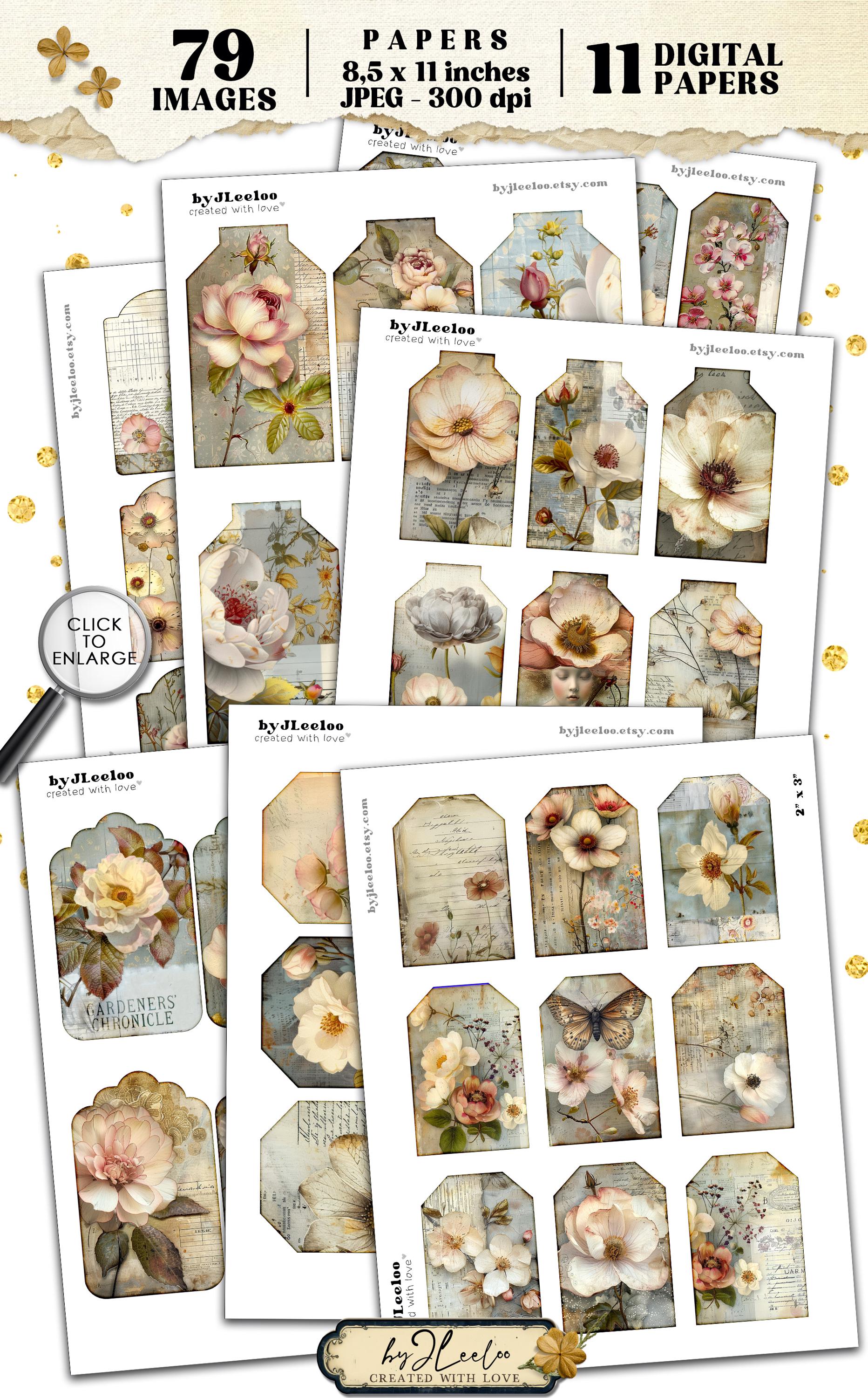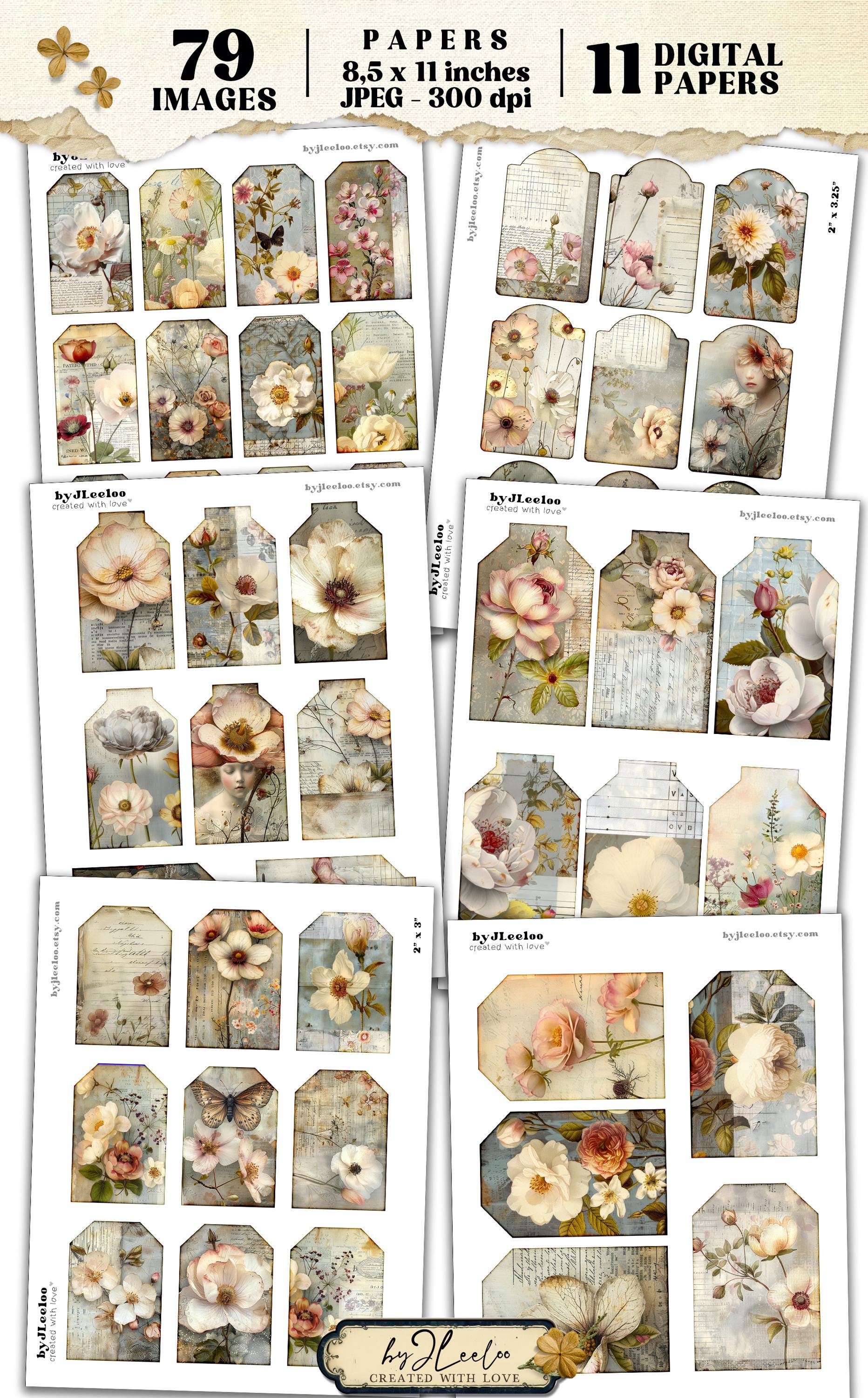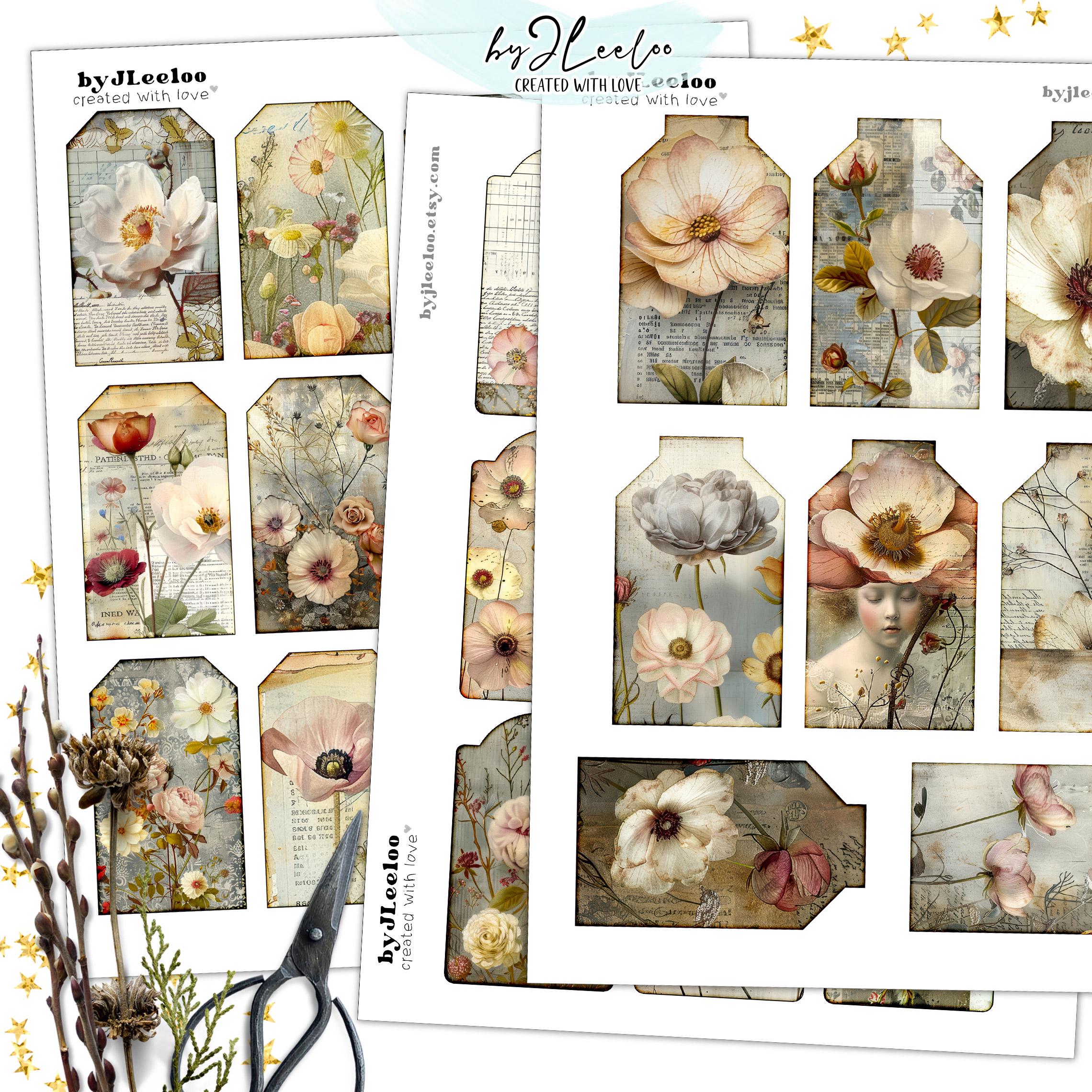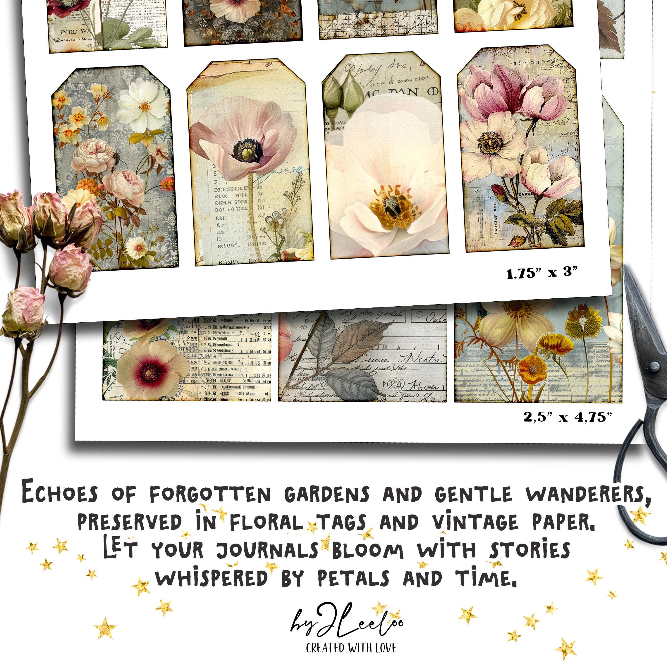 Each tag is a delicate fragment of the past, featuring aged paper textures, soft stains, and layered images of flowers, nature, and handwritten text.