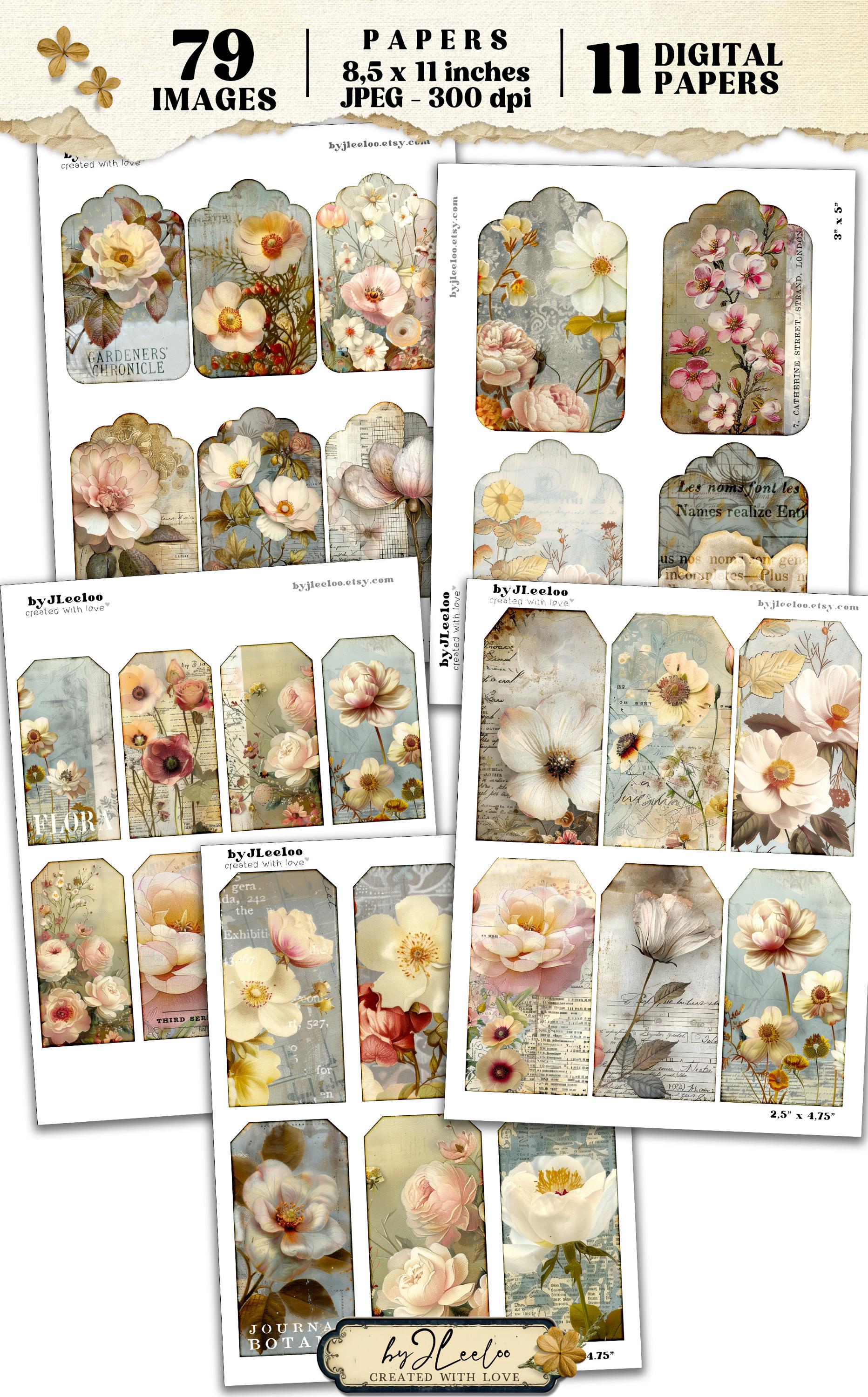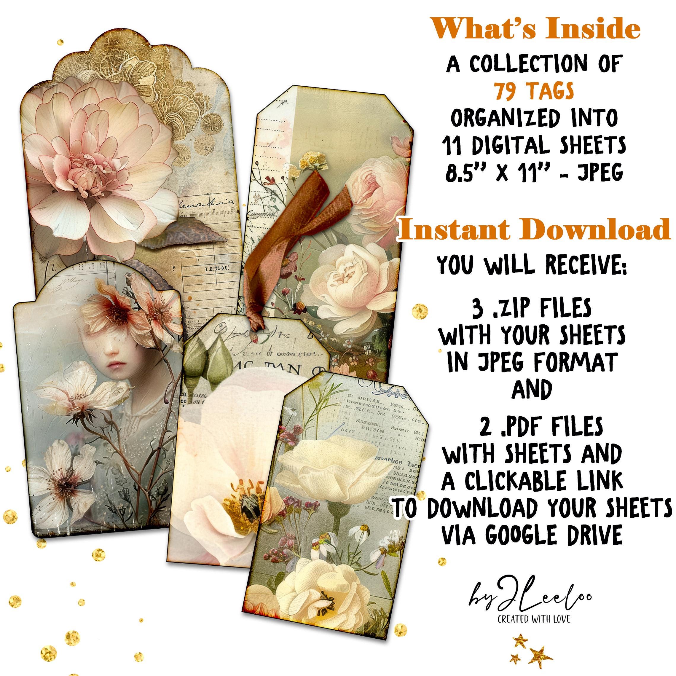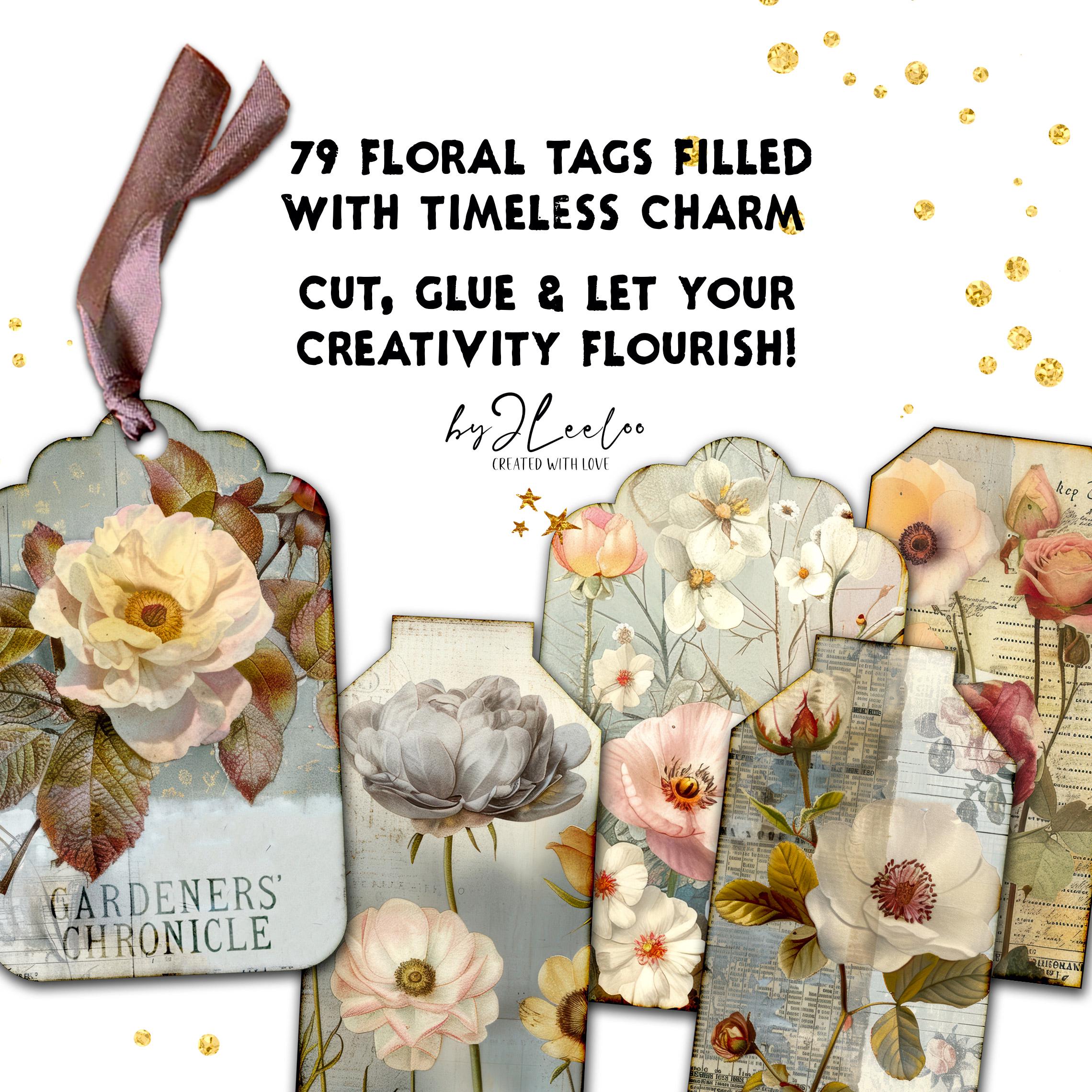 If you love romantic vintage aesthetics and botanical ephemera, this collection of 79 floral tags is just what you need!