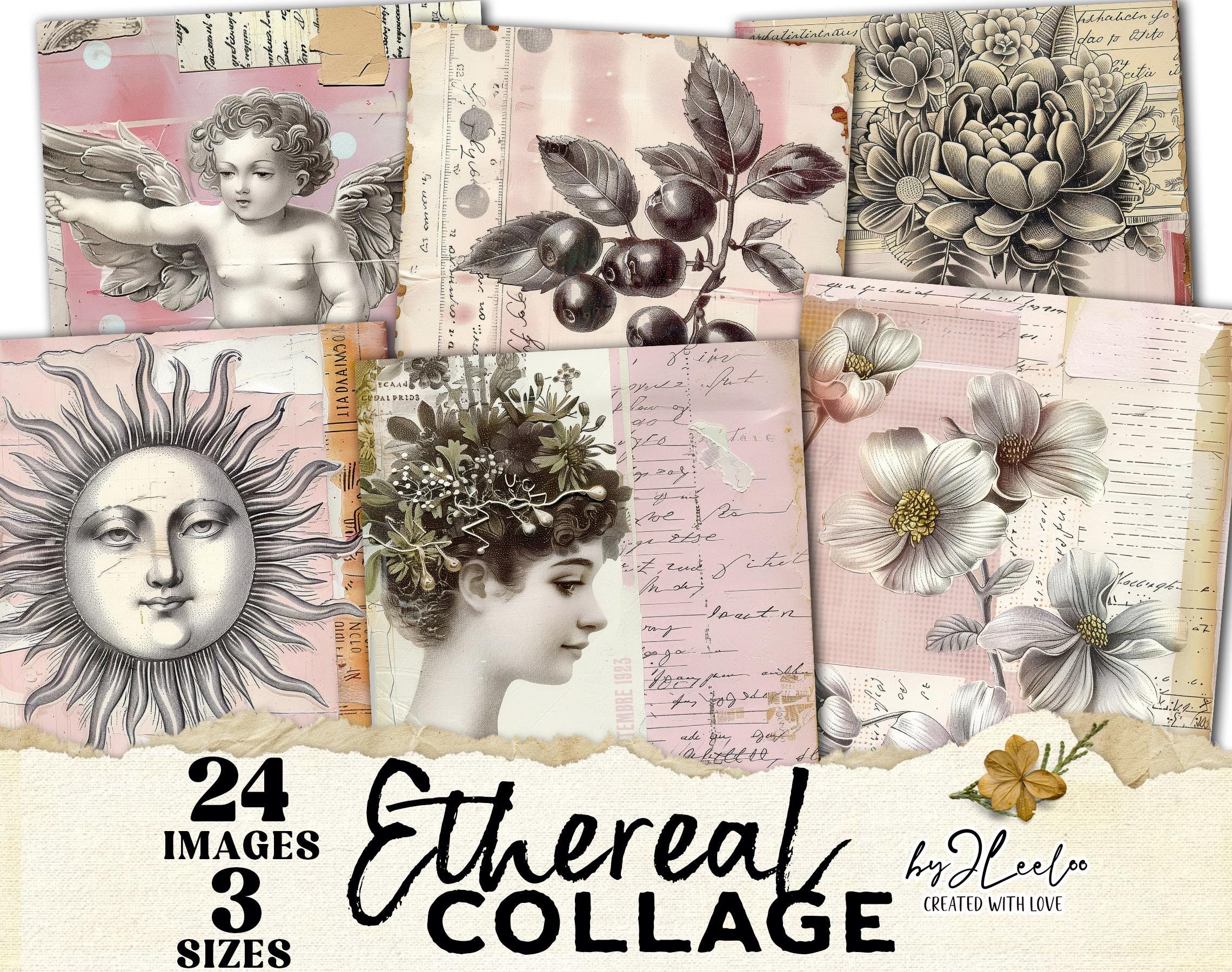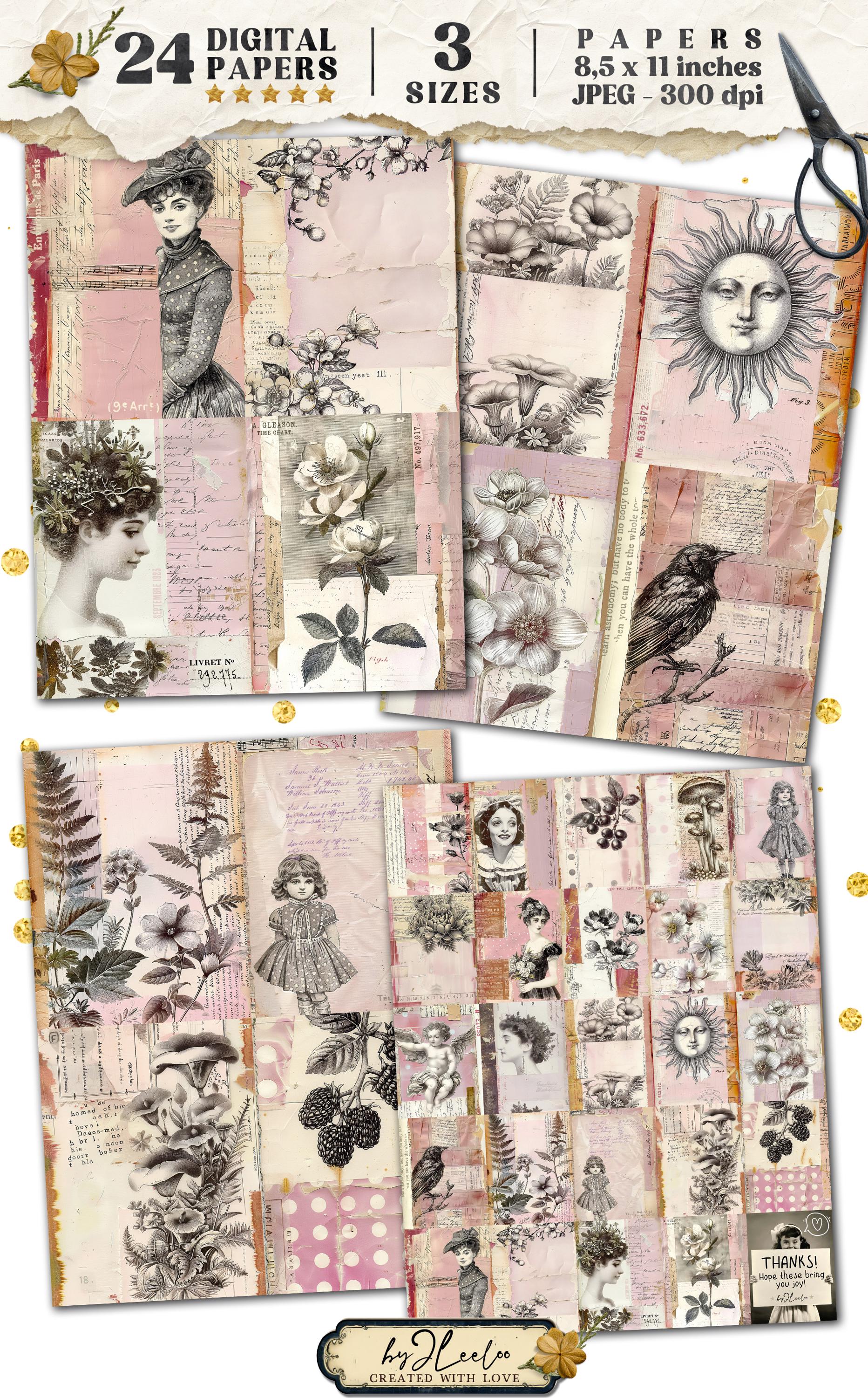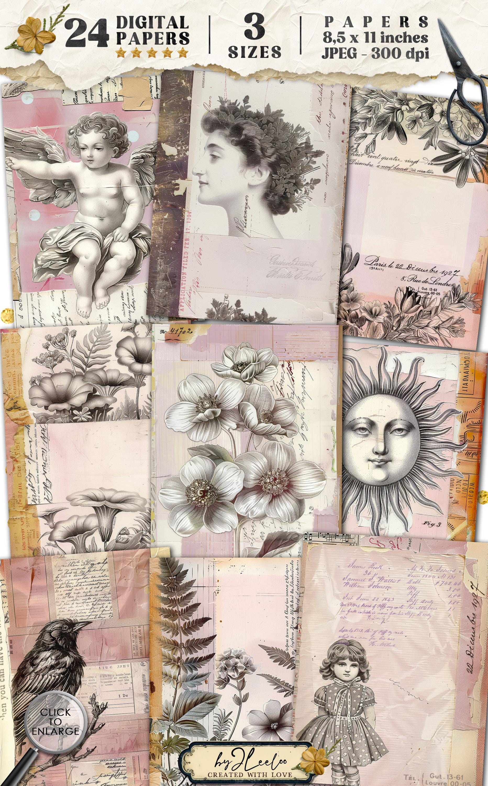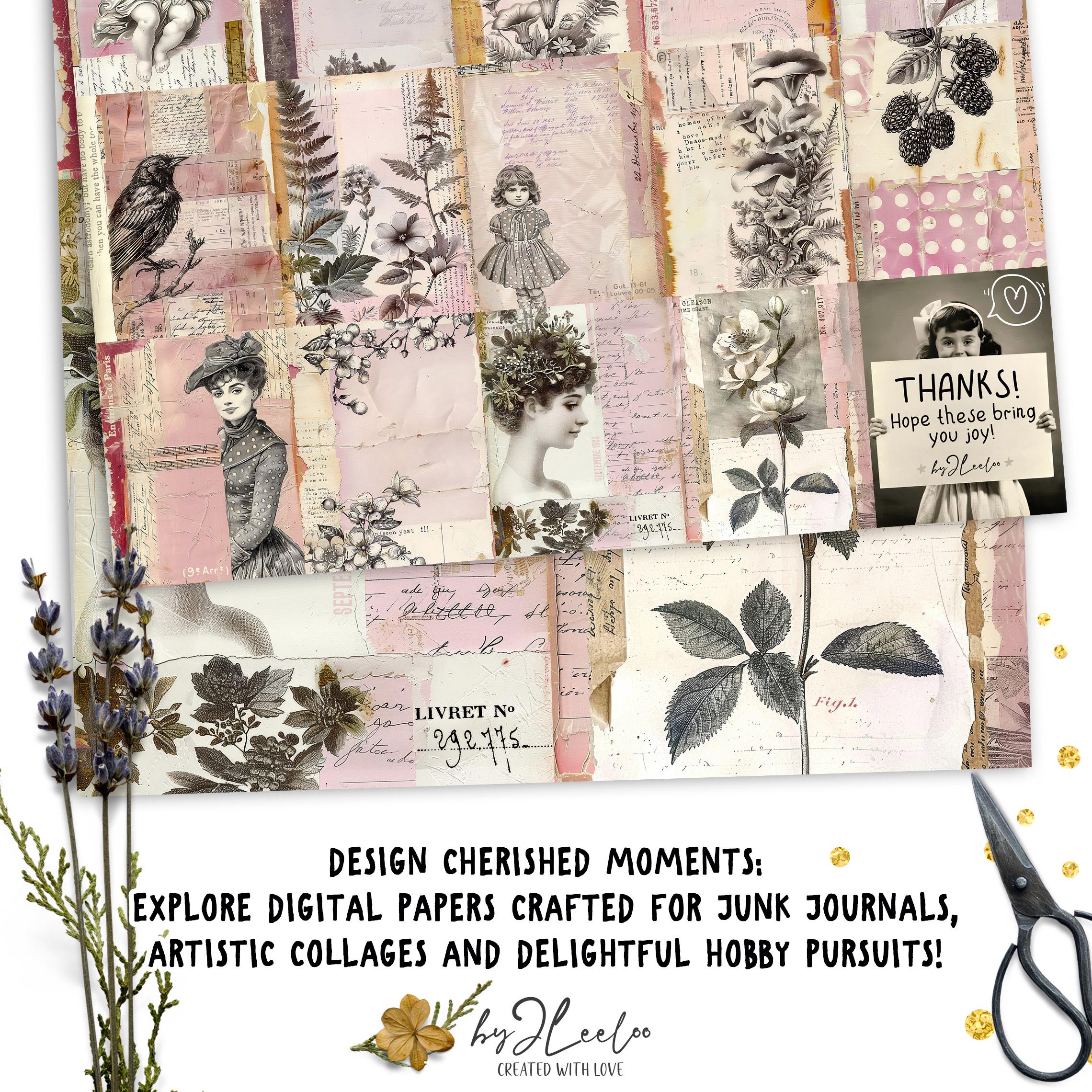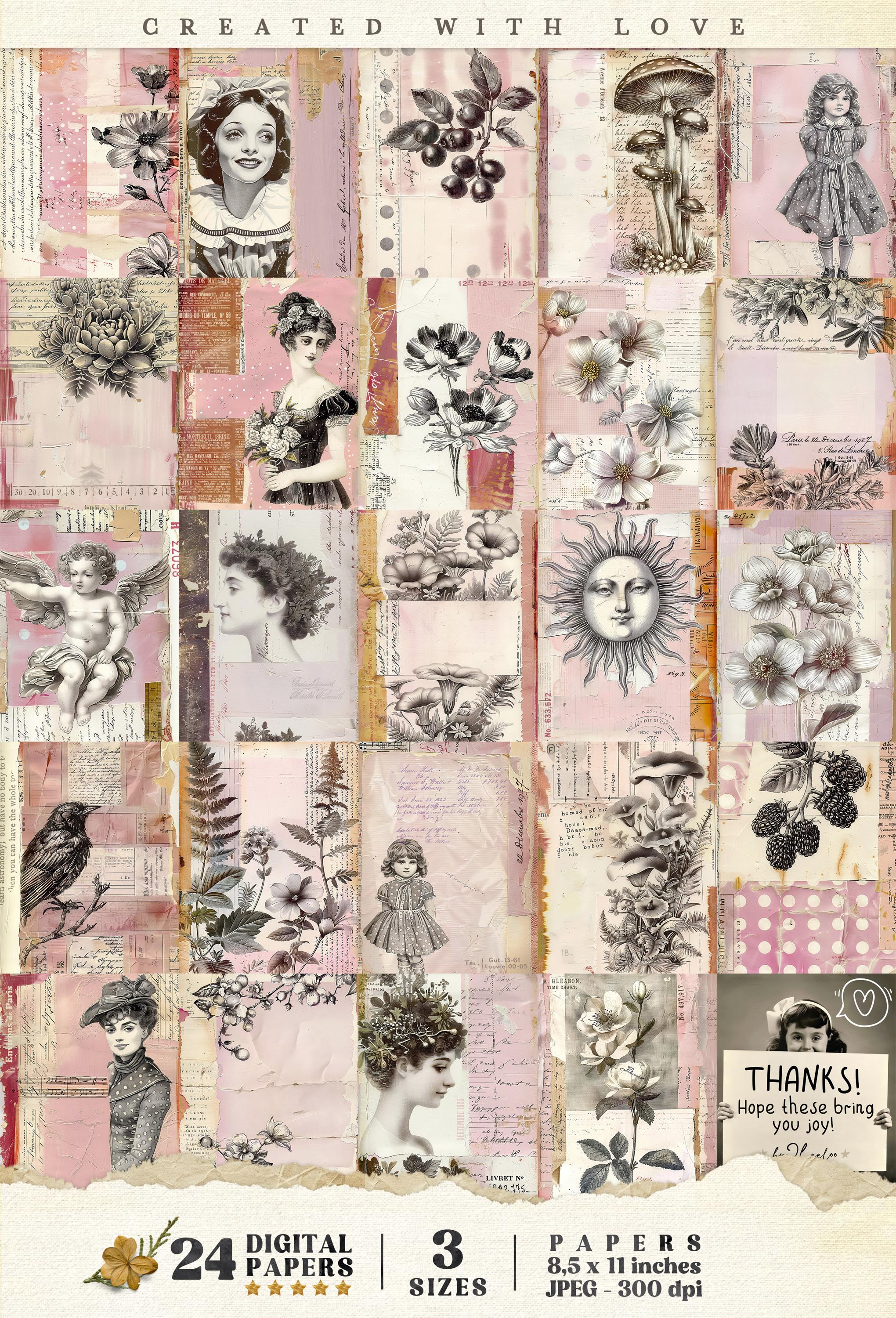Ethereal Collage is a set of 24 digital papers in 3 sizes, perfect for junk journals, scrapbooking, card making, and more! ๐ฟโจ Featuring soft pastel tones, blush pink, cream, and vintage black-and-white details, each page adds a dreamy, nostalgic touch to your creative projects. Ideal for crafters and ephemera lovers, this shabby chic set is great for layering, collages, and unique decorations. Printable & reusable, ready to bring your ideas to life! ๐