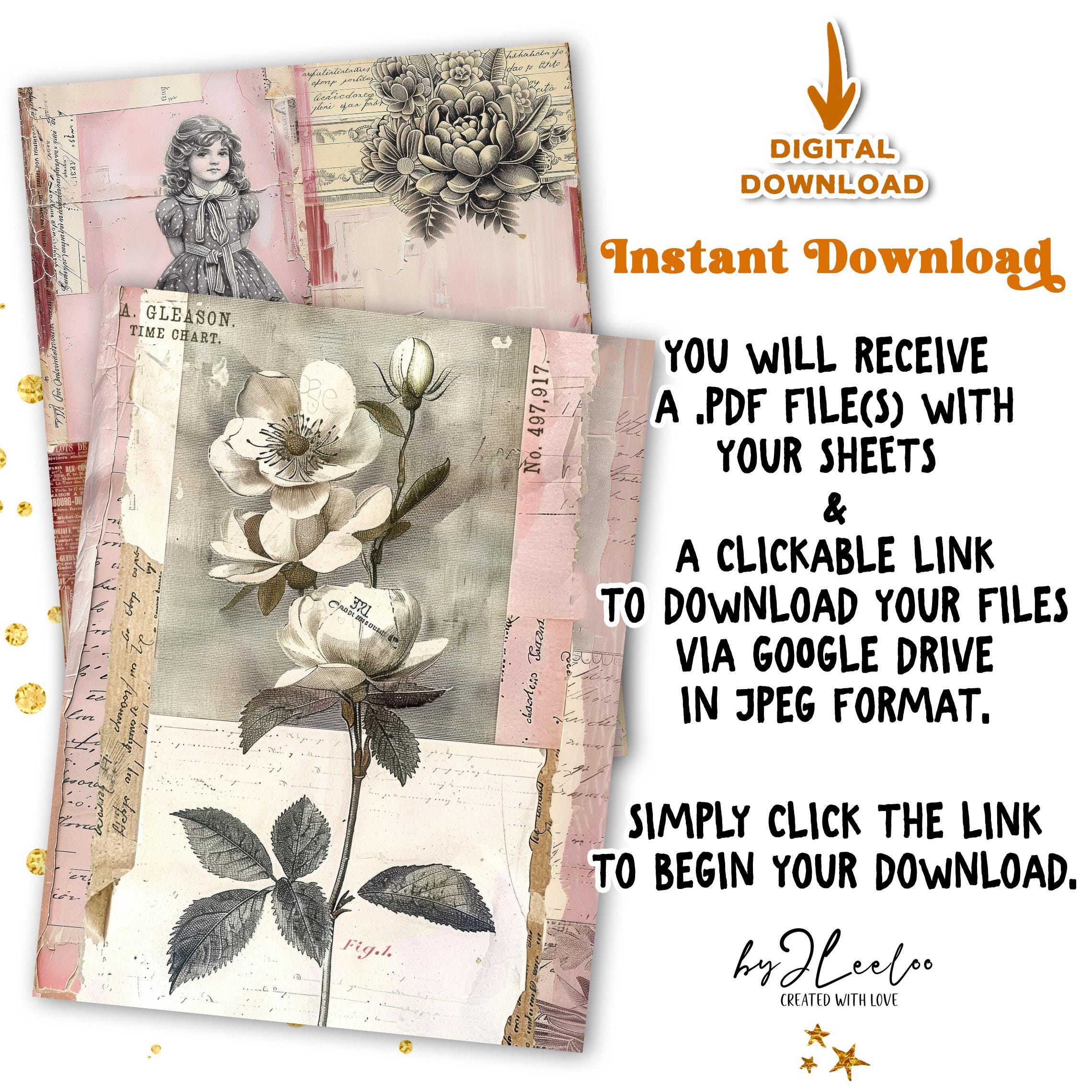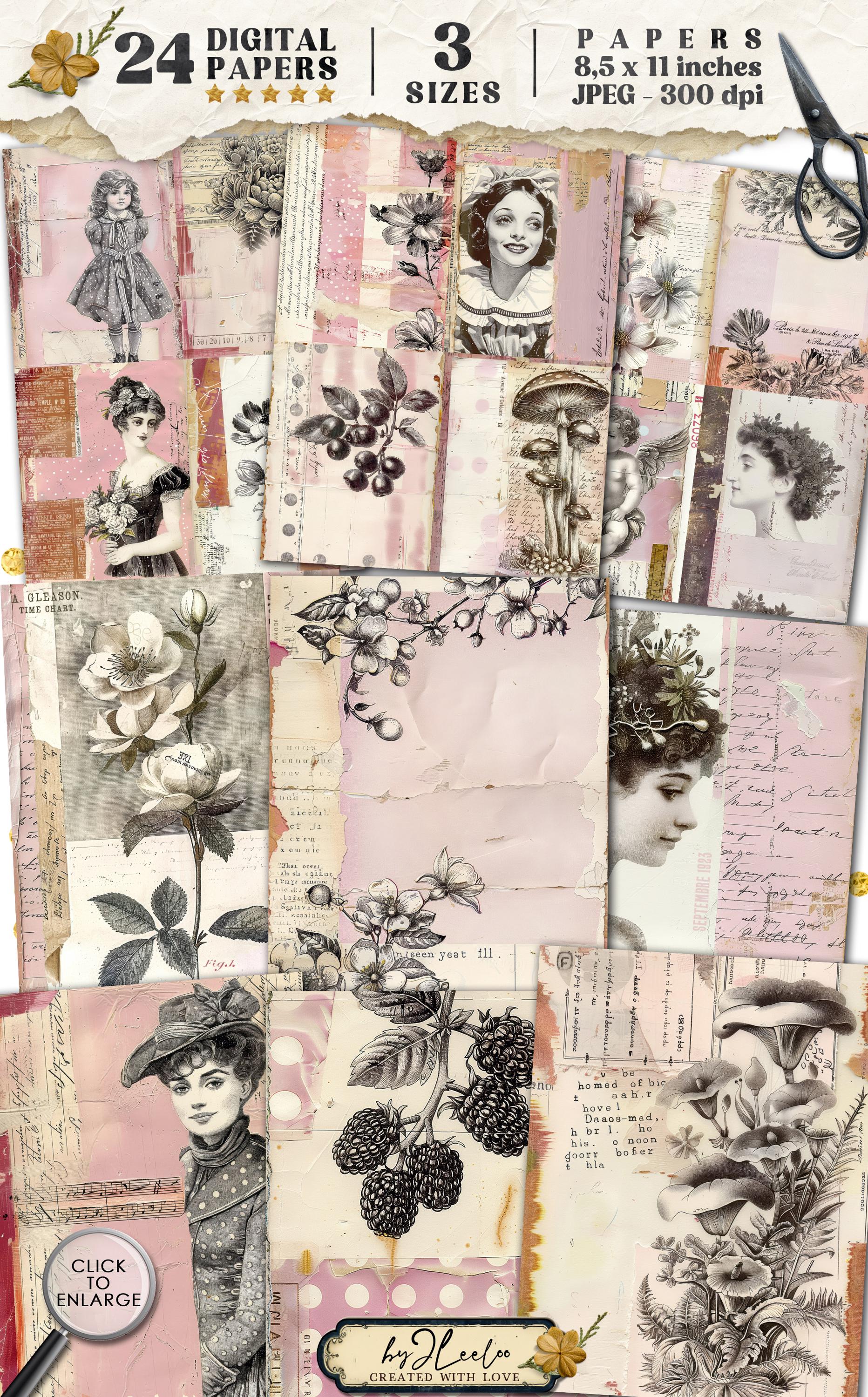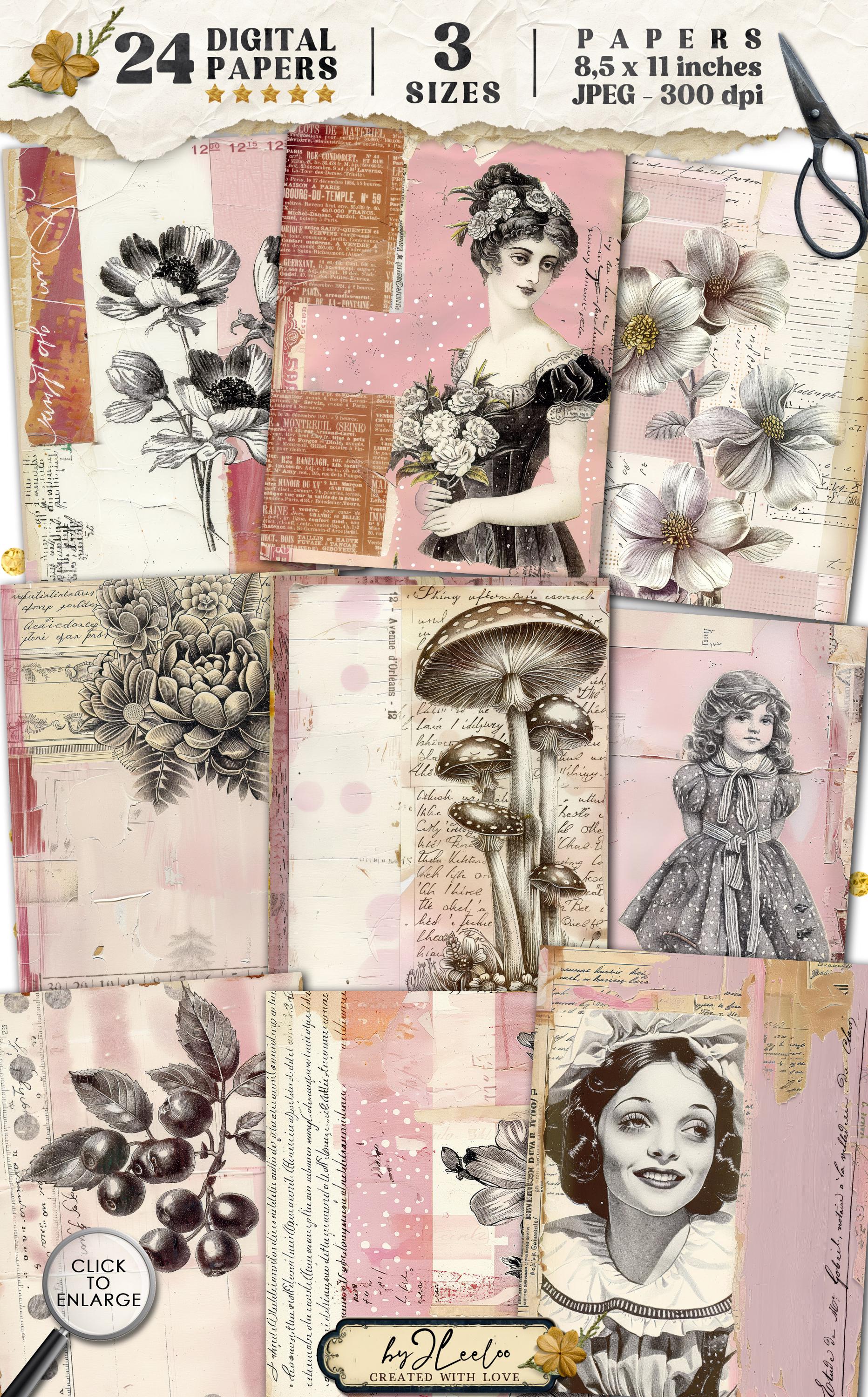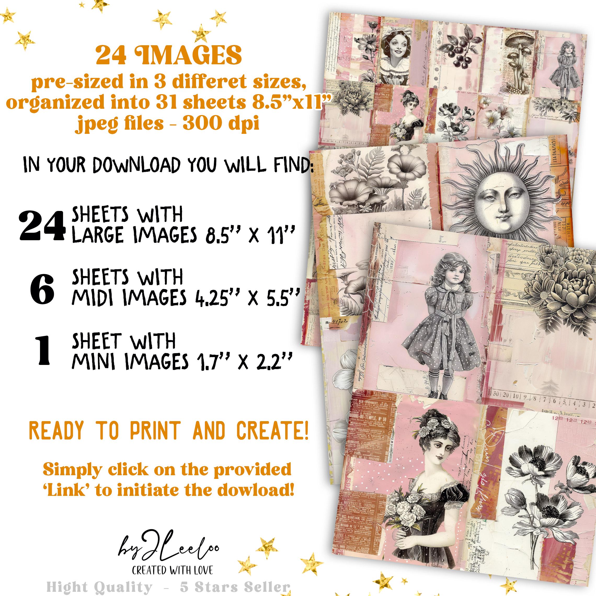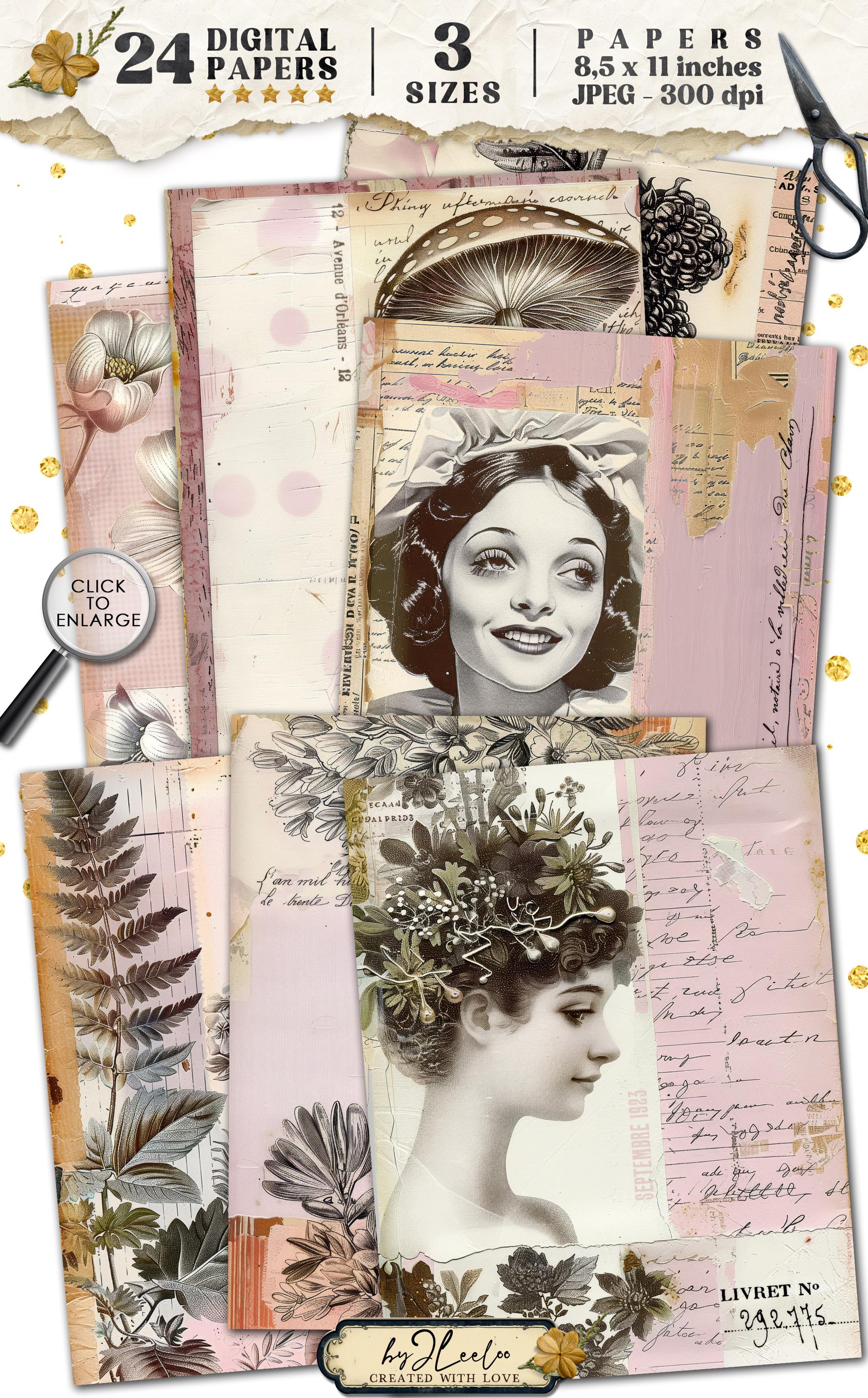 Ethereal Collage is a set of 24 digital papers in 3 sizes, perfect for junk journals, scrapbooking, card making, and more! ๐ฟโจ Featuring soft pastel tones, blush pink, cream, and vintage black-and-white details, each page adds a dreamy, nostalgic touch to your creative projects. Ideal for crafters and ephemera lovers, this shabby chic set is great for layering, collages, and unique decorations. Printable & reusable, ready to bring your ideas to life! ๐