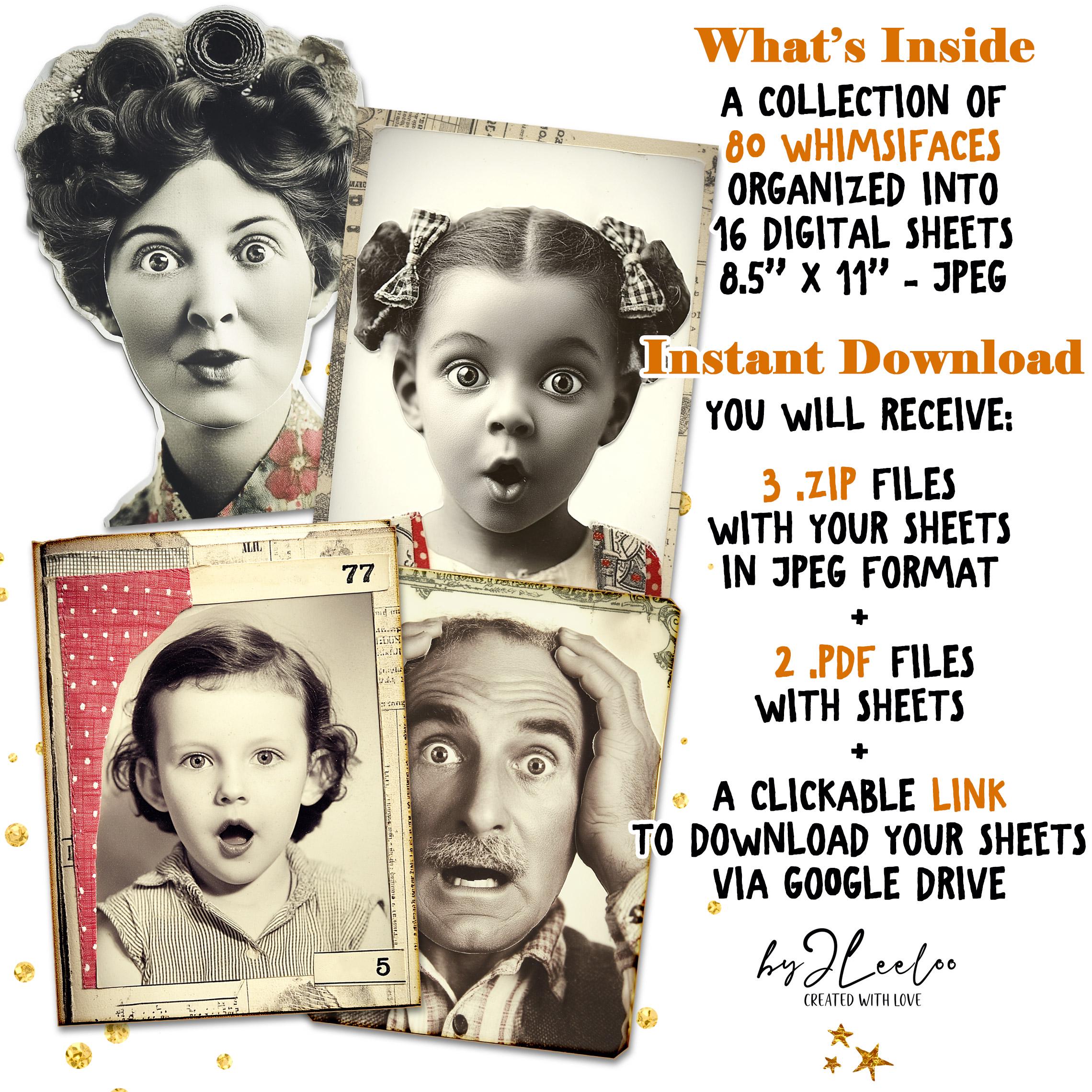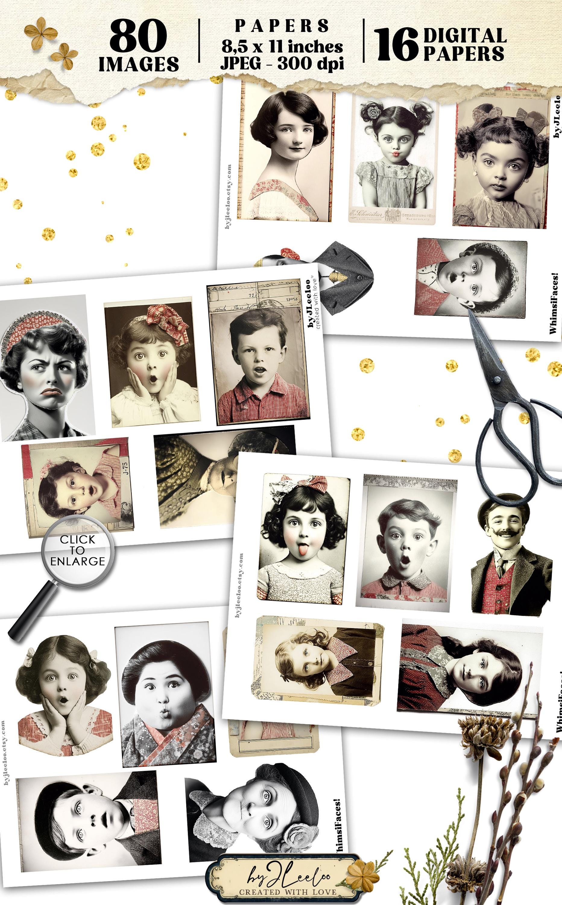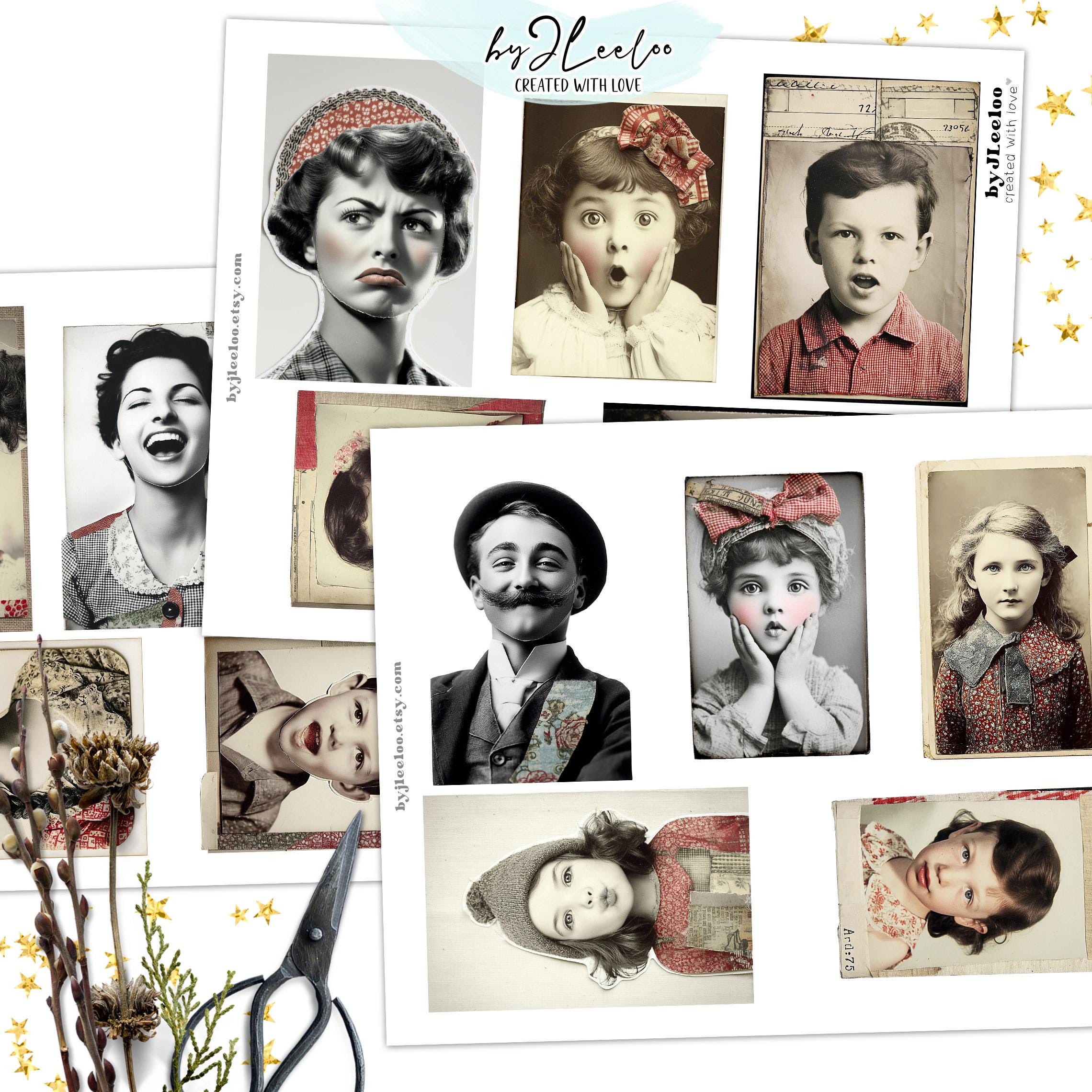 Sizes vary to keep things interesting, making these perfect for junk journals, collages, handmade cards, or any creative project that needs a little personality. These arenโt your typical vintage photos โ theyโre full of attitude, whimsy, and a hint of mischief.