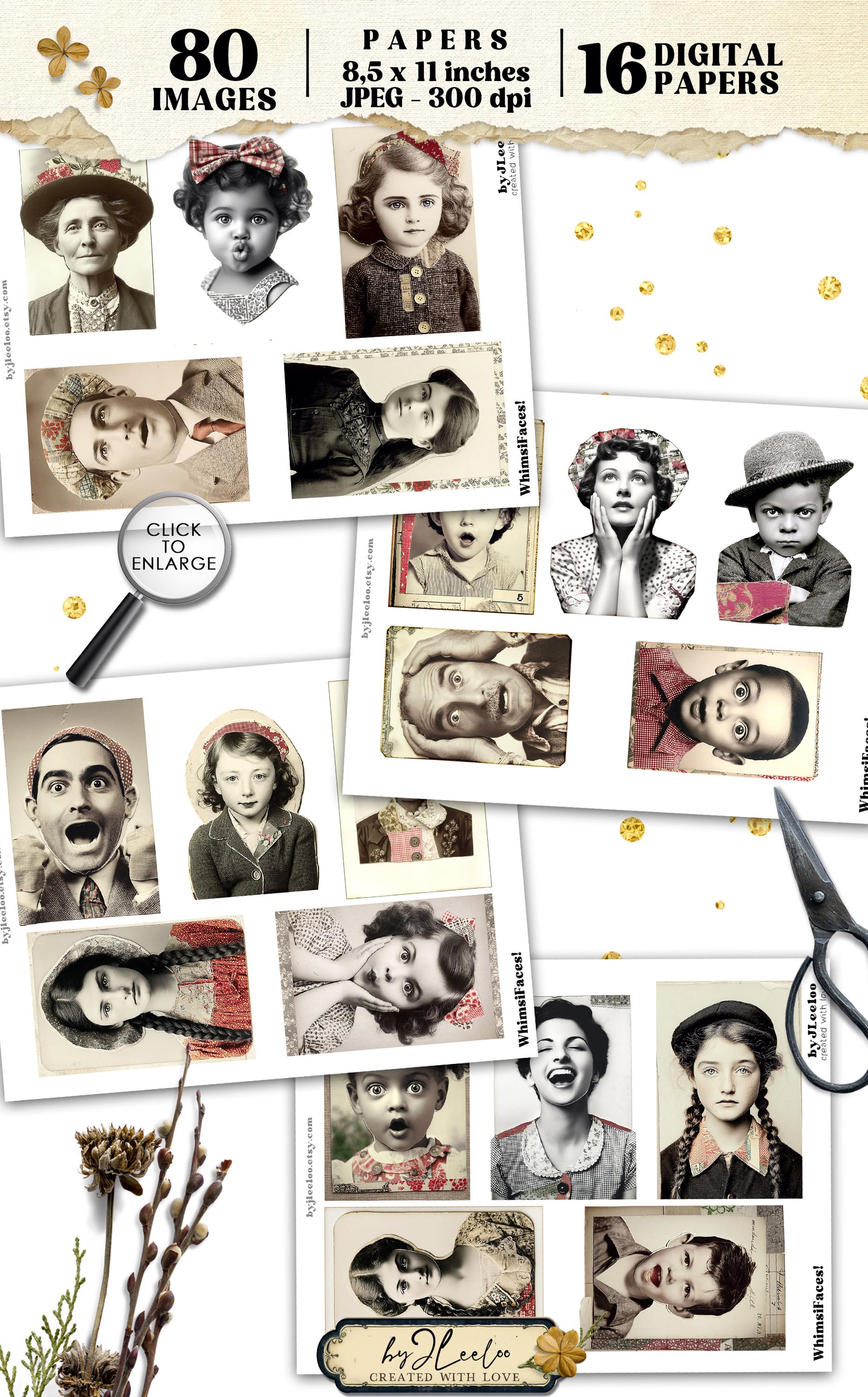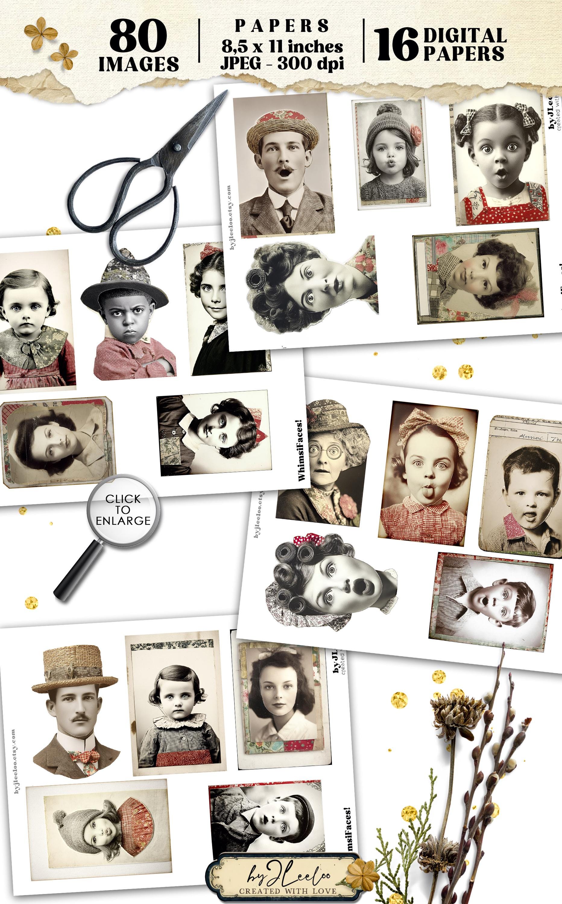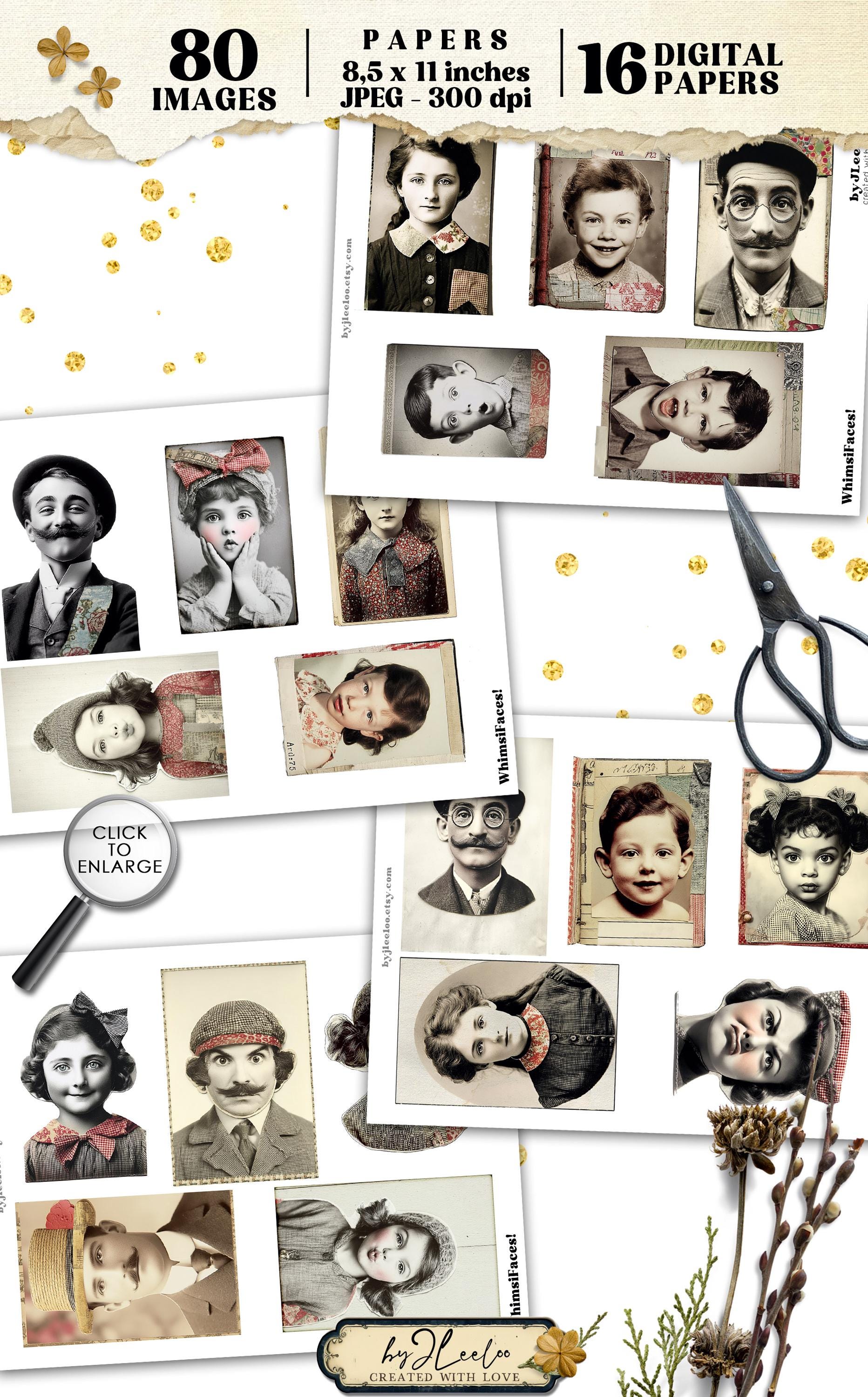 WHIMSIFACES โ 80 Vintage Portrait with Red Collage Accents, Quirky Ephemera for Junk Journals Scrapbooking and Mixed Media Printable | cp039