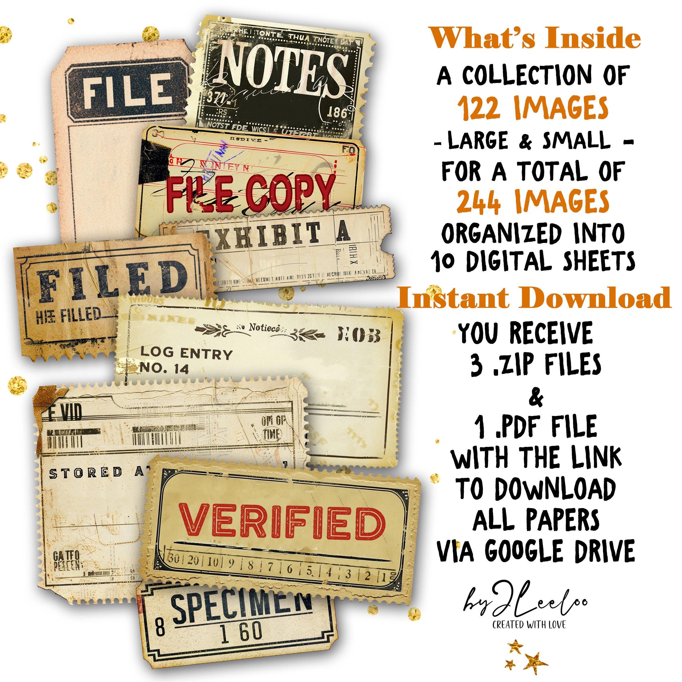 ⭐ Bring vintage office charm to your junk journals and scrapbooks! ✨ This Office & Documents collection includes 122 printable labels and tags in large and small sizes (244 total), designed for junk journaling, scrapbooking, and paper crafts. Organized into 10 digital sheets (8.5” x 11”), these high-quality printables are perfect for adding a touch of old-world office style to your creative projects. Download instantly and start crafting! ⭐