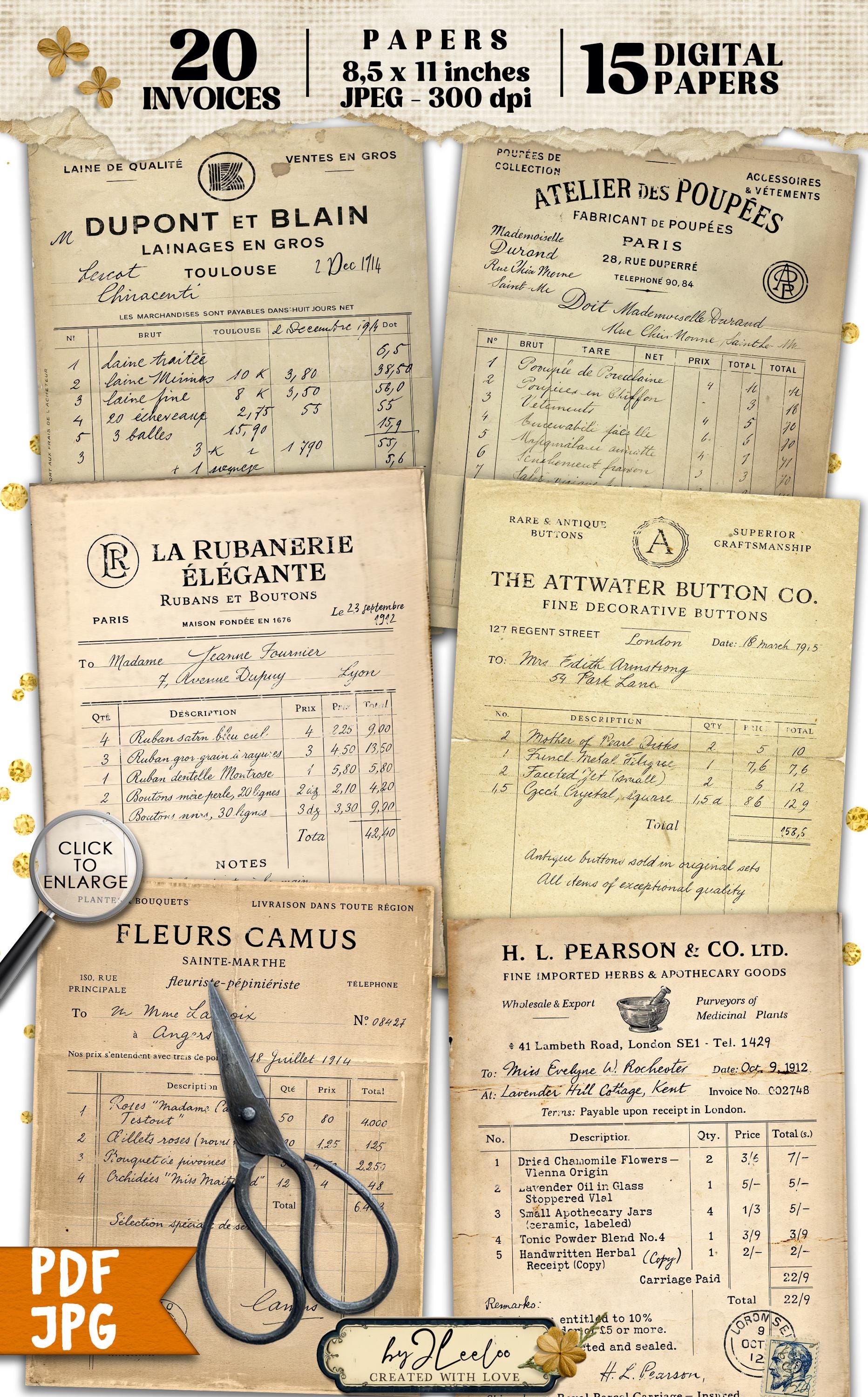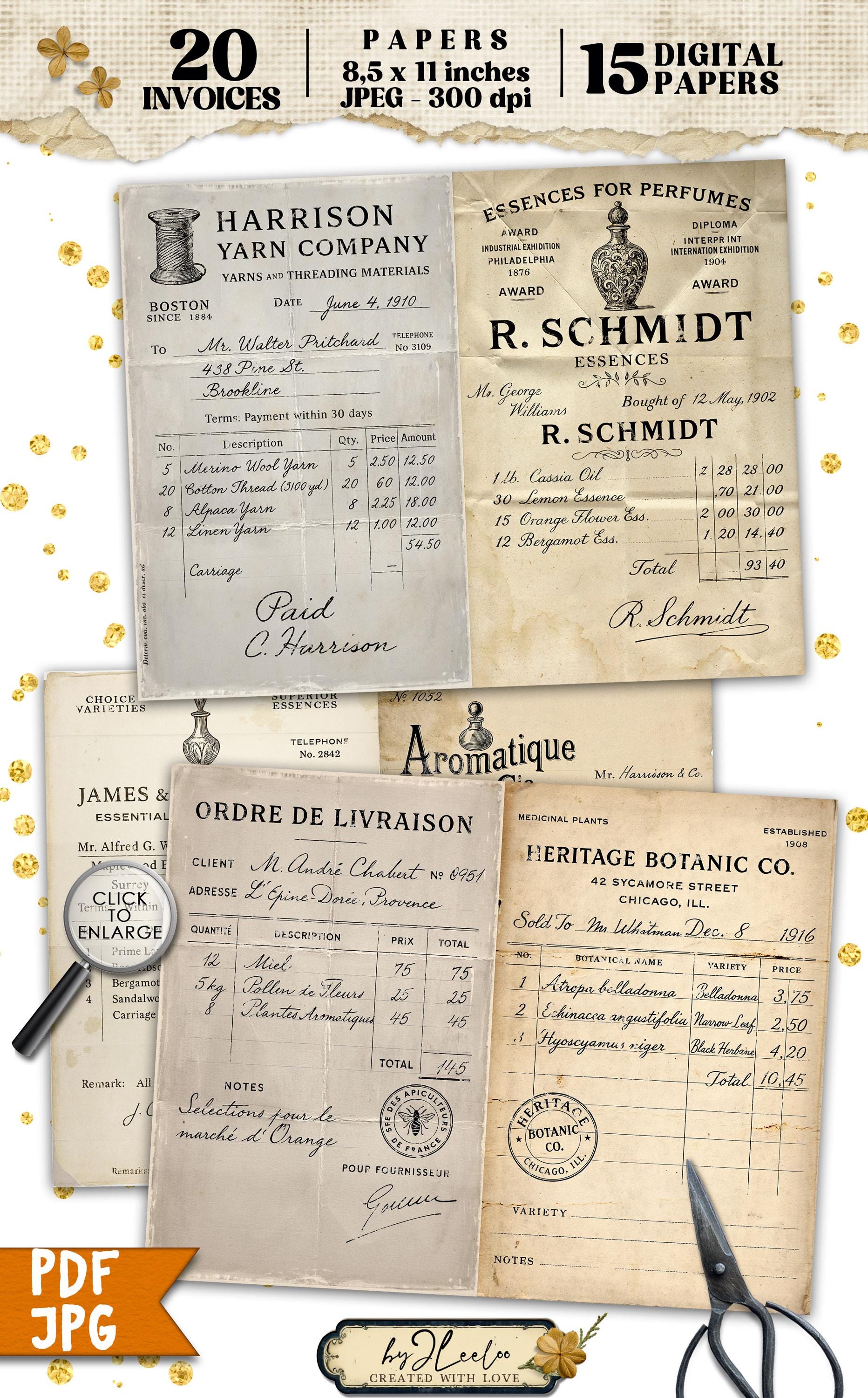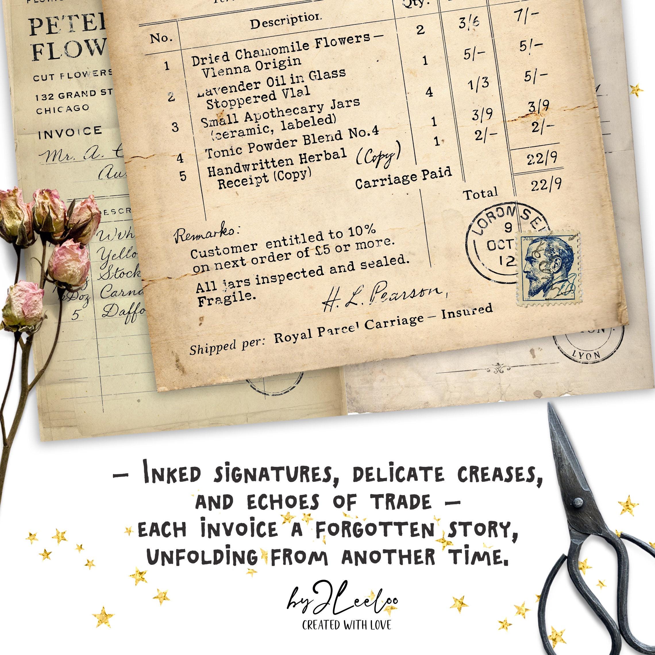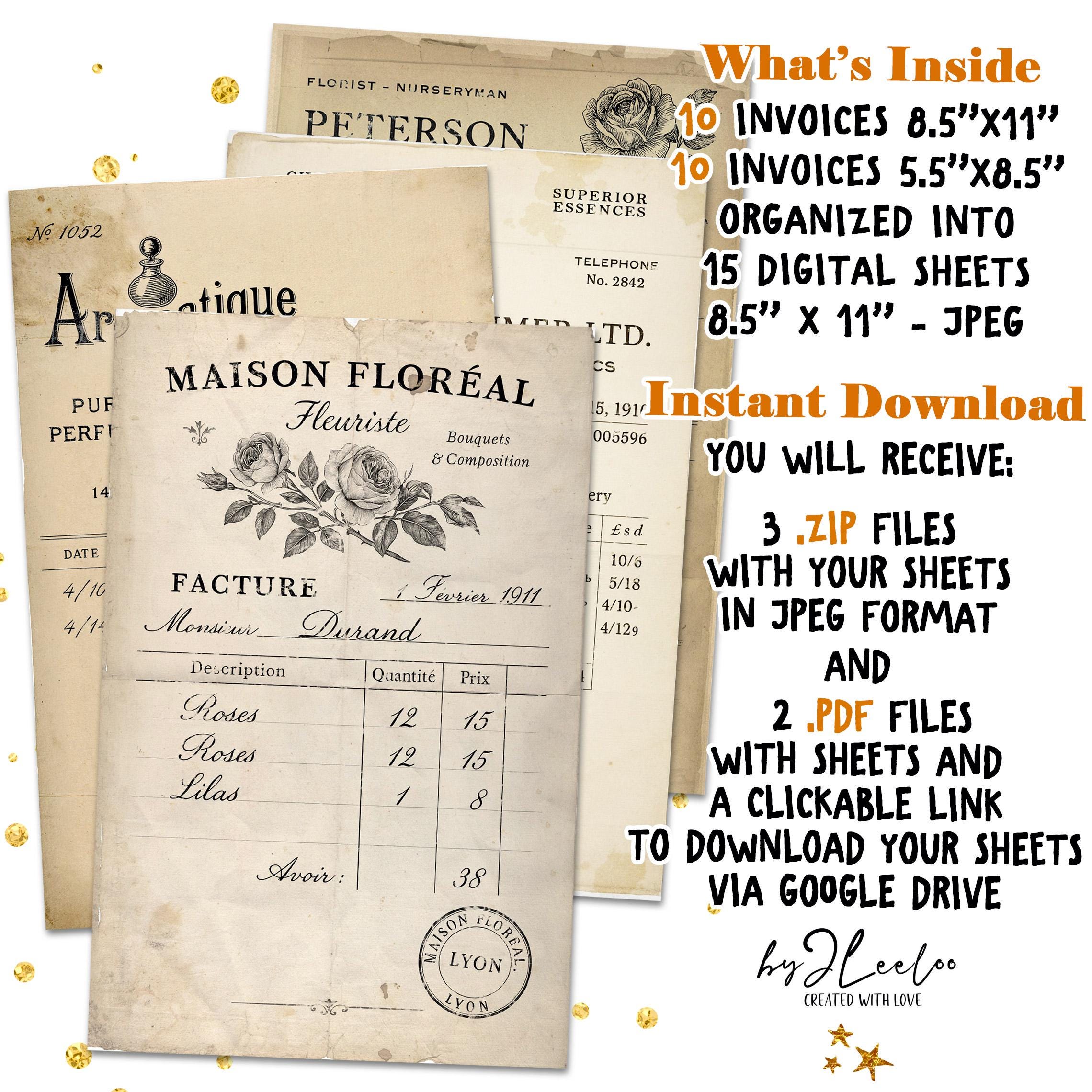 ► 20 printable vintage invoices with a beautiful aged effect, offered in two versatile sizes for your creative projects: