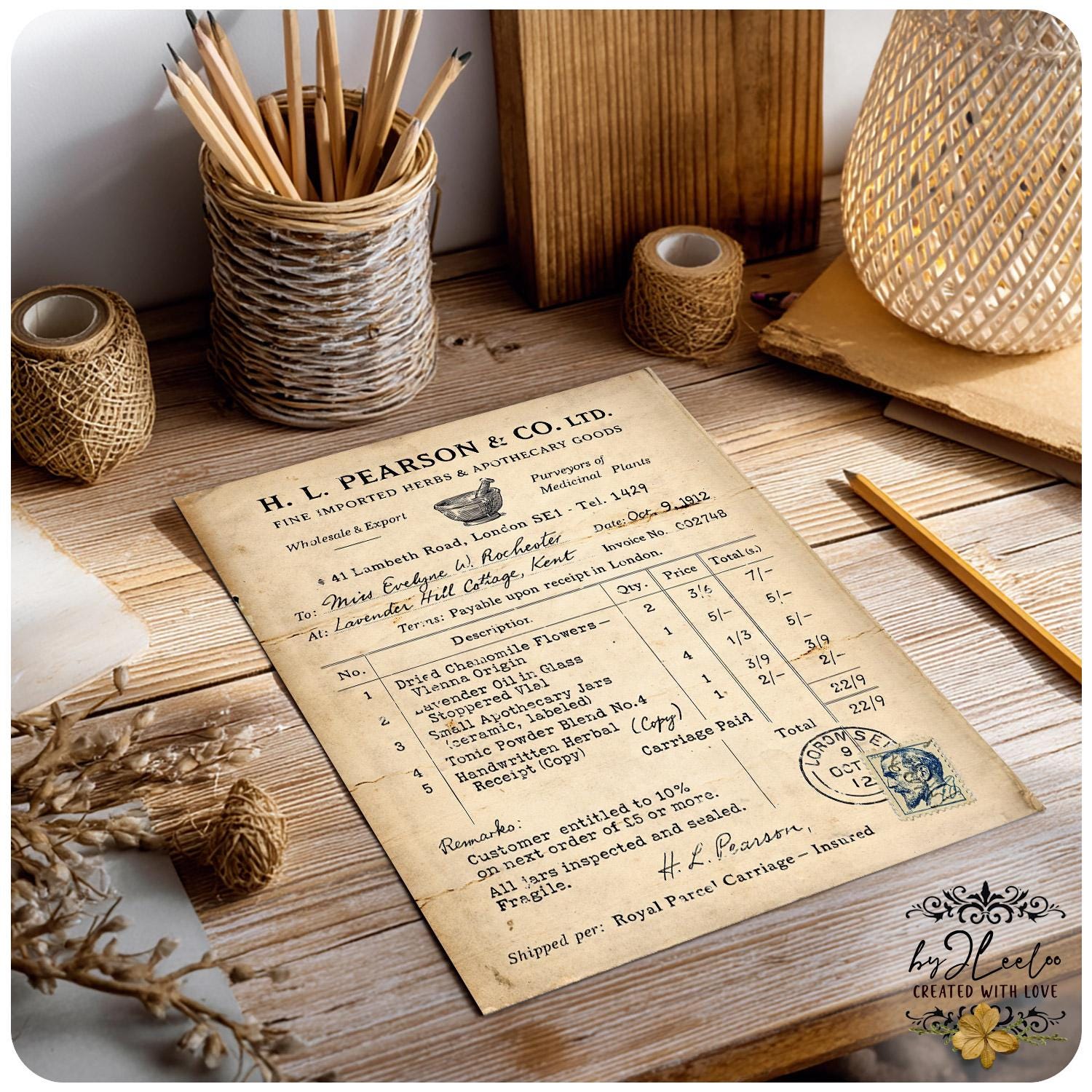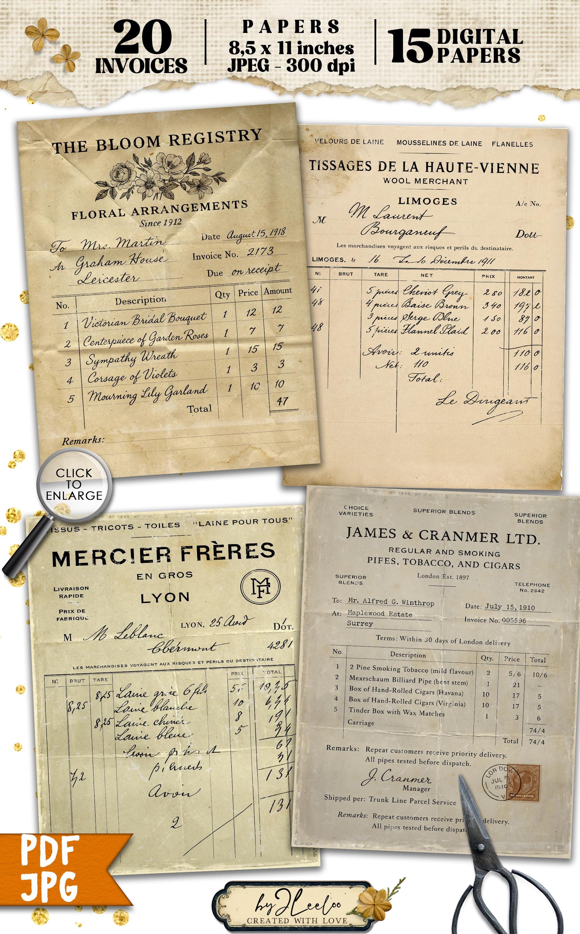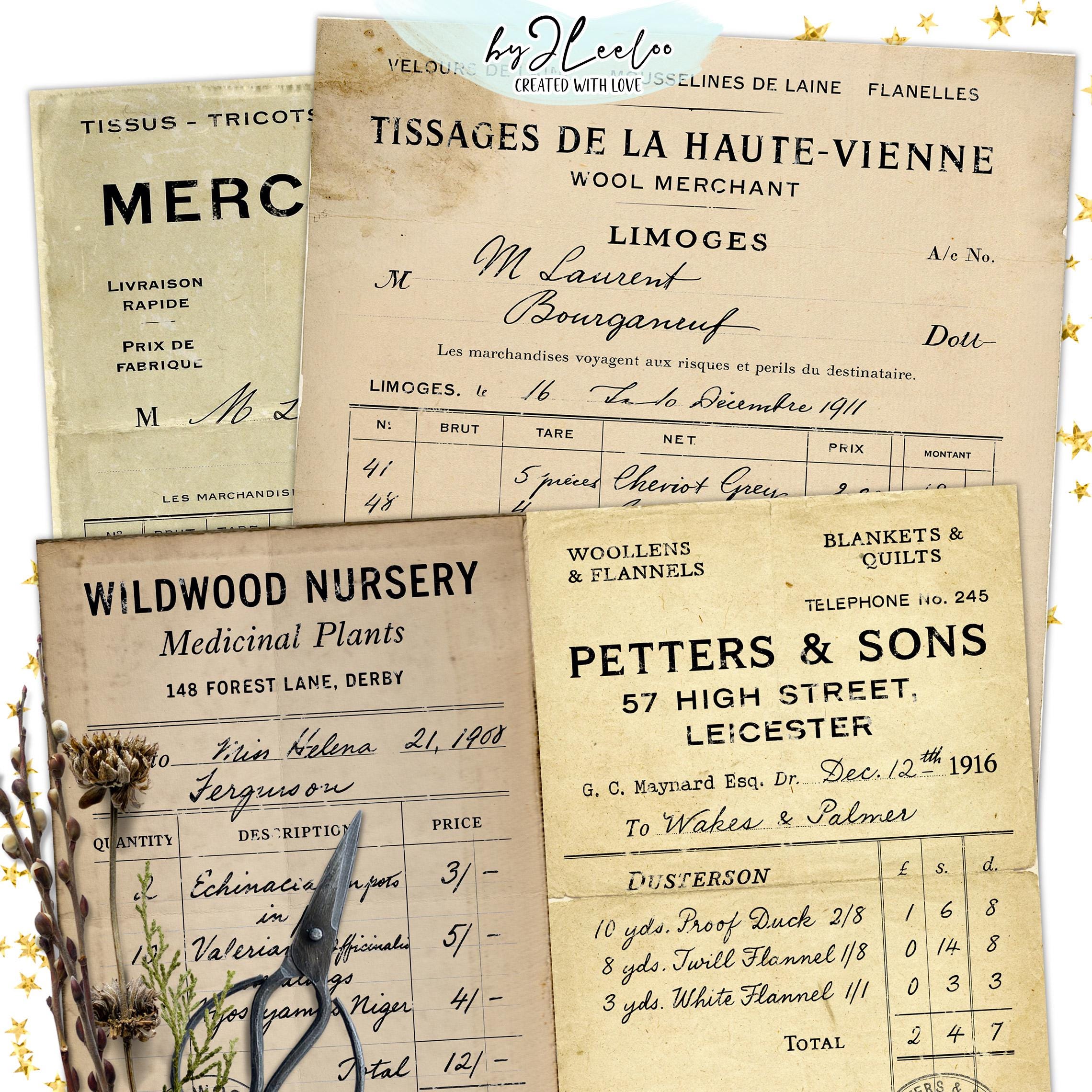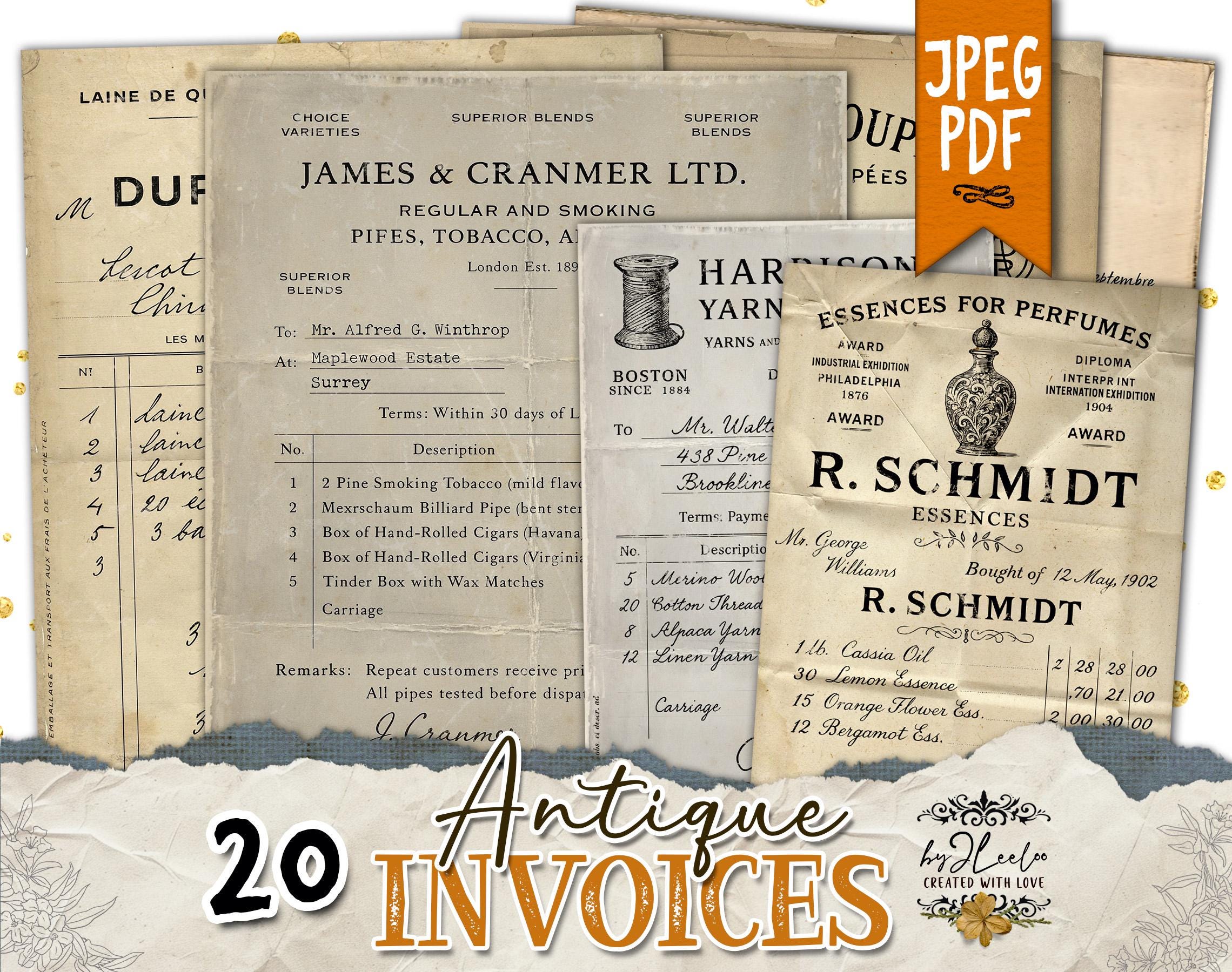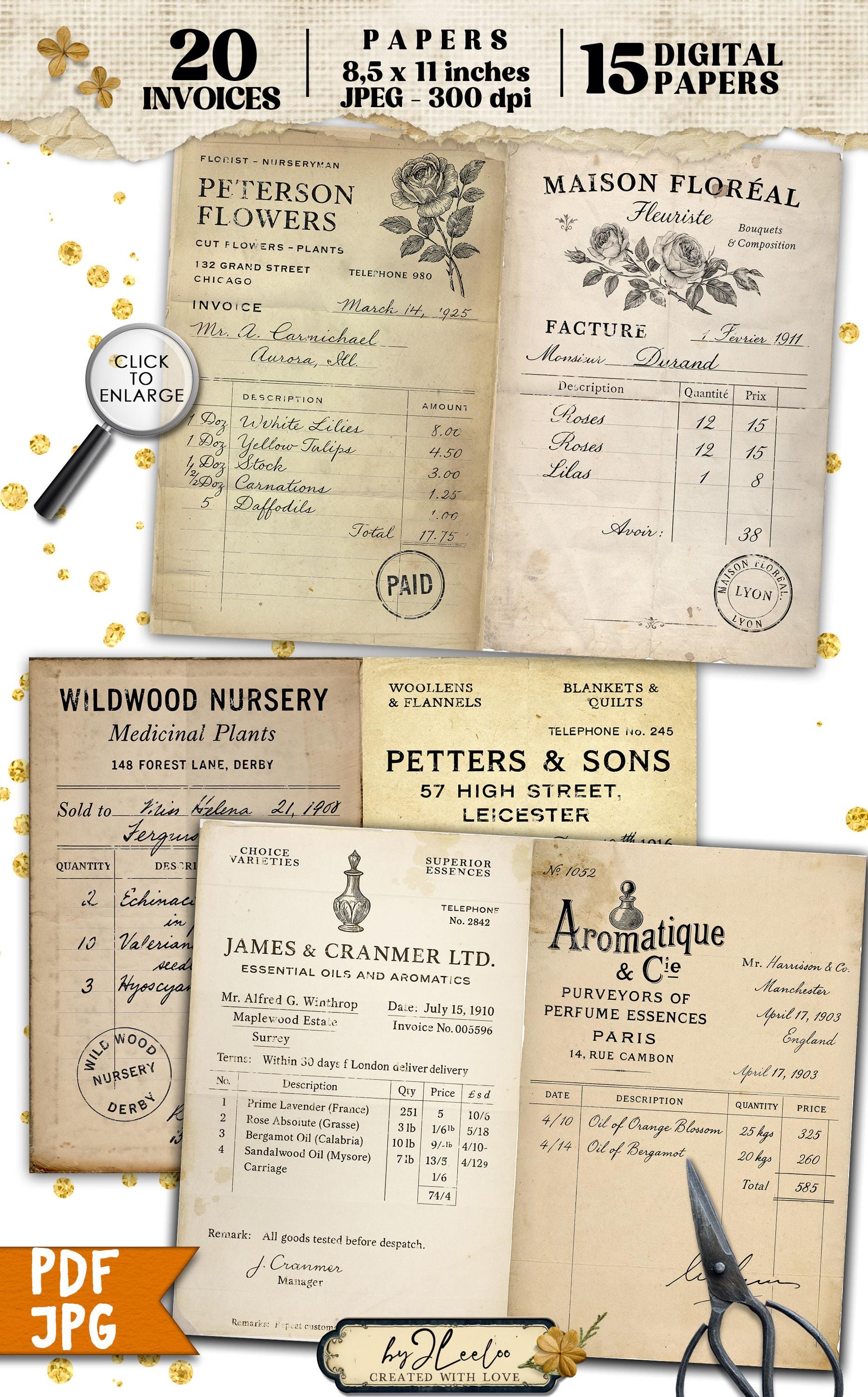 ► 20 printable vintage invoices with a beautiful aged effect, offered in two versatile sizes for your creative projects: