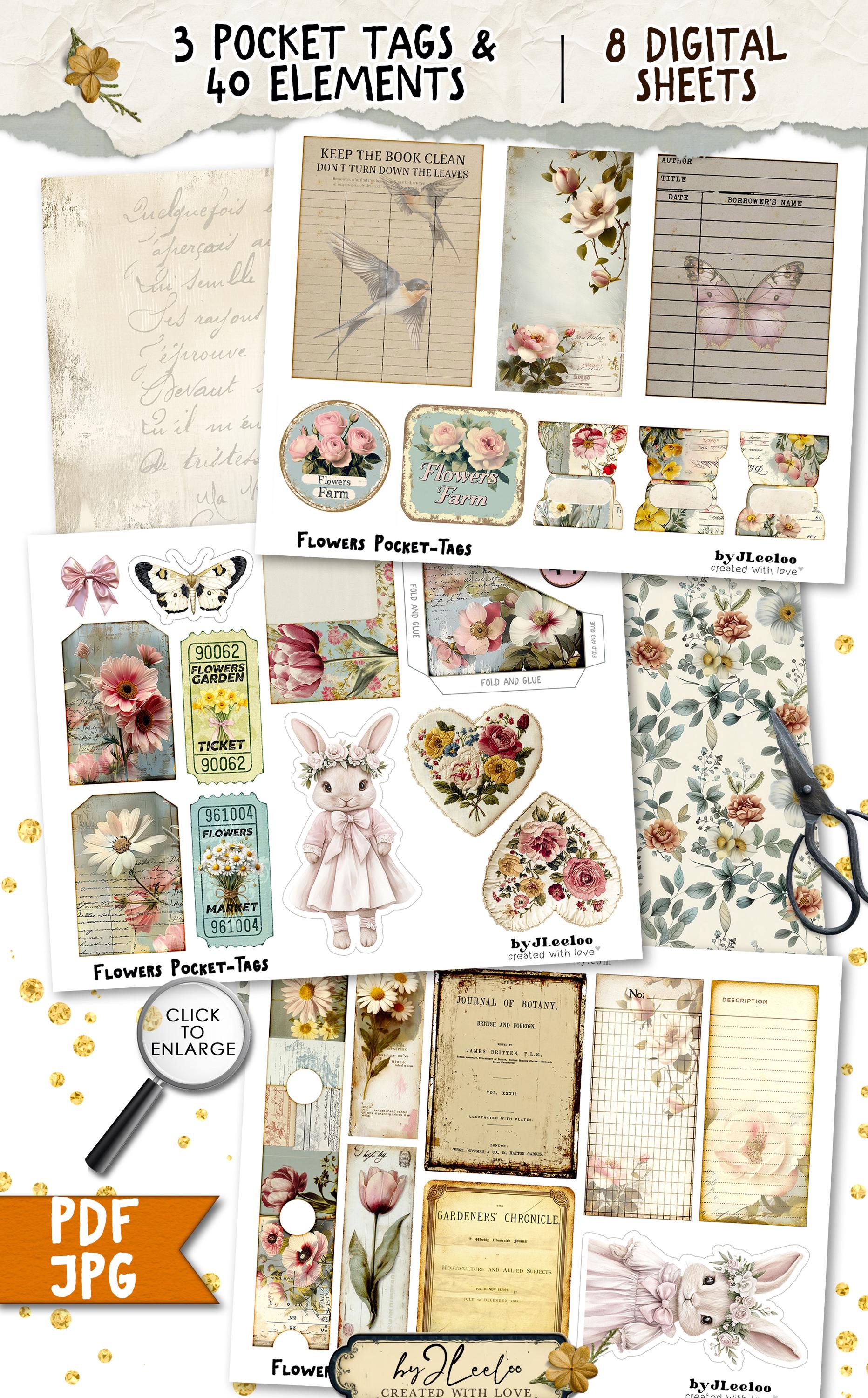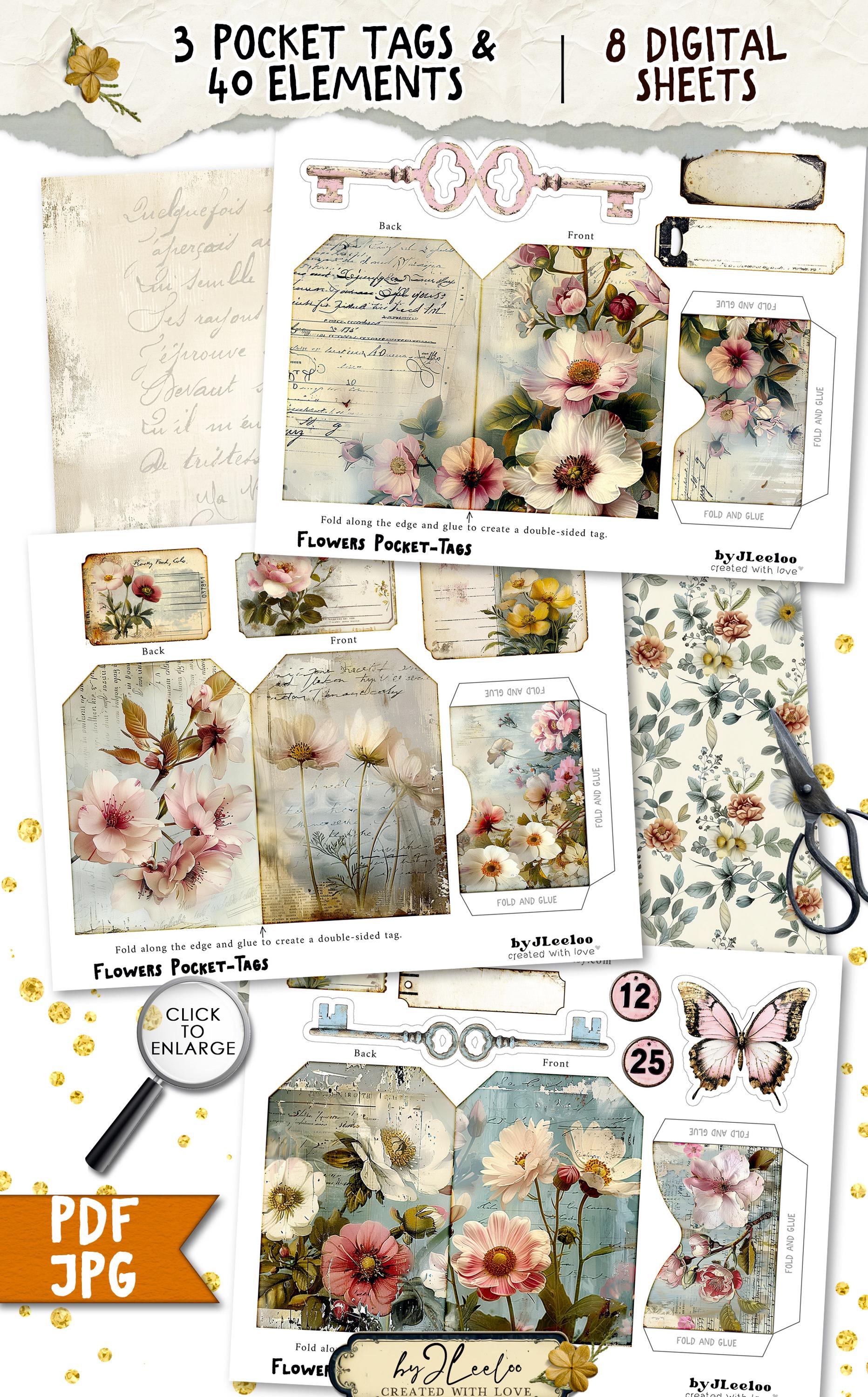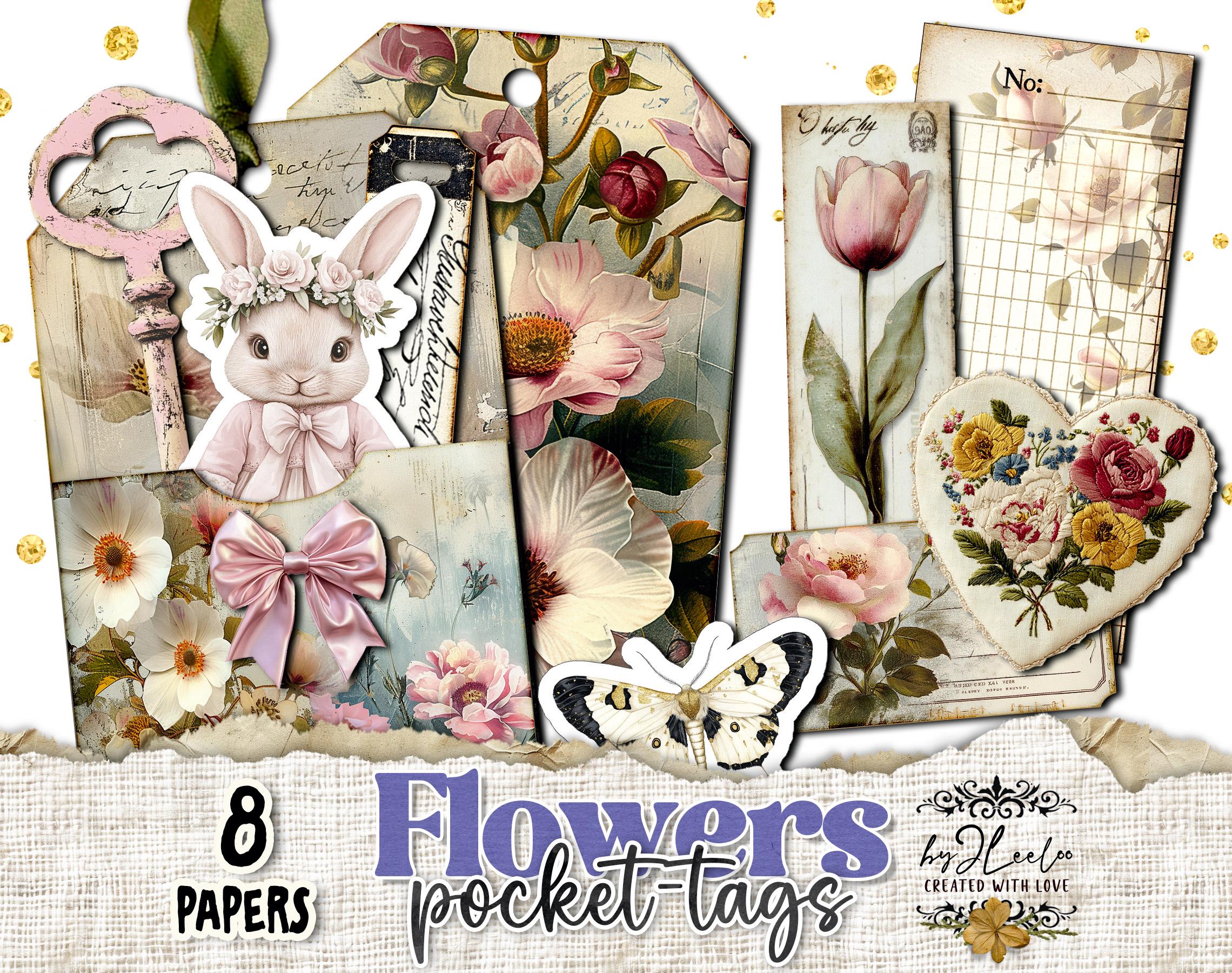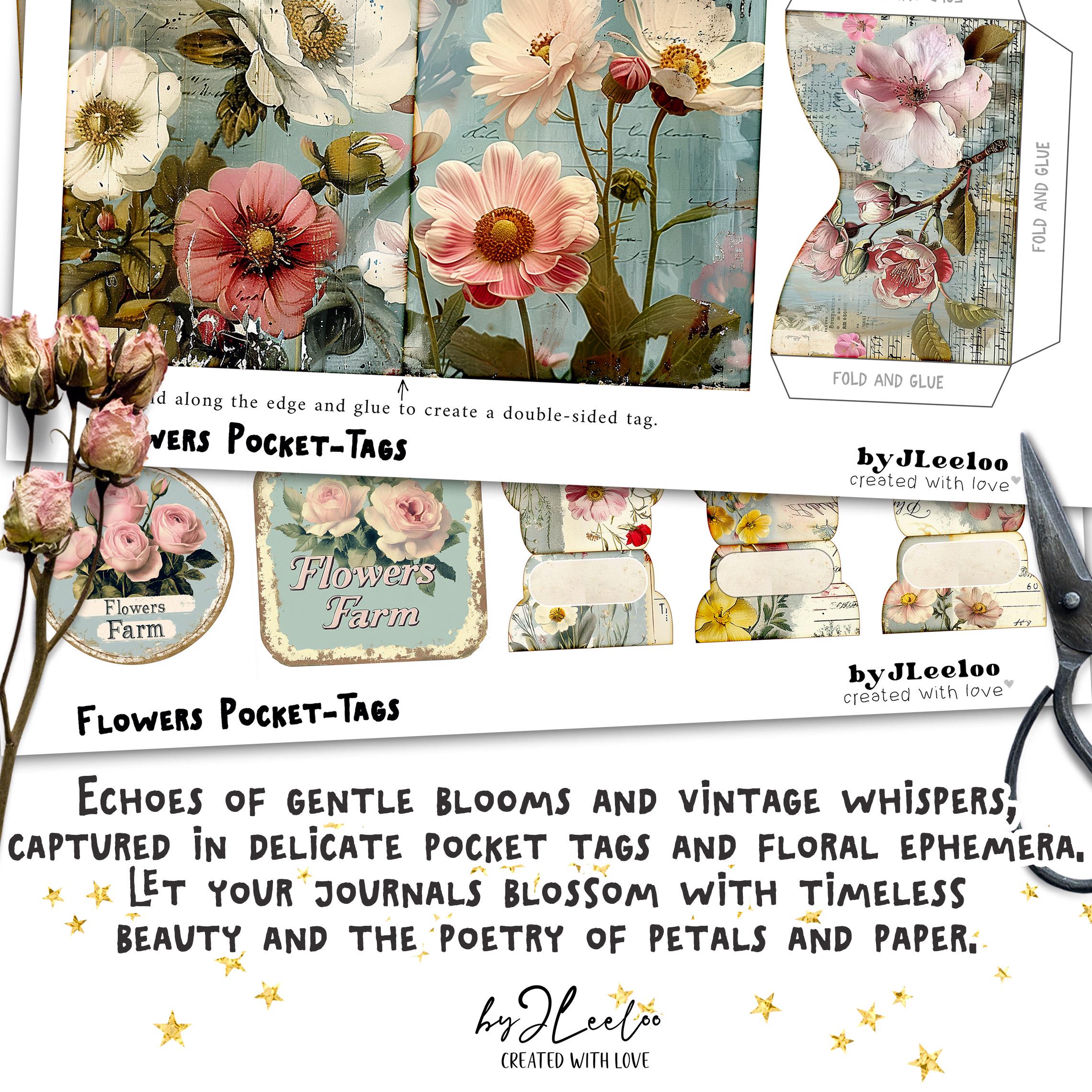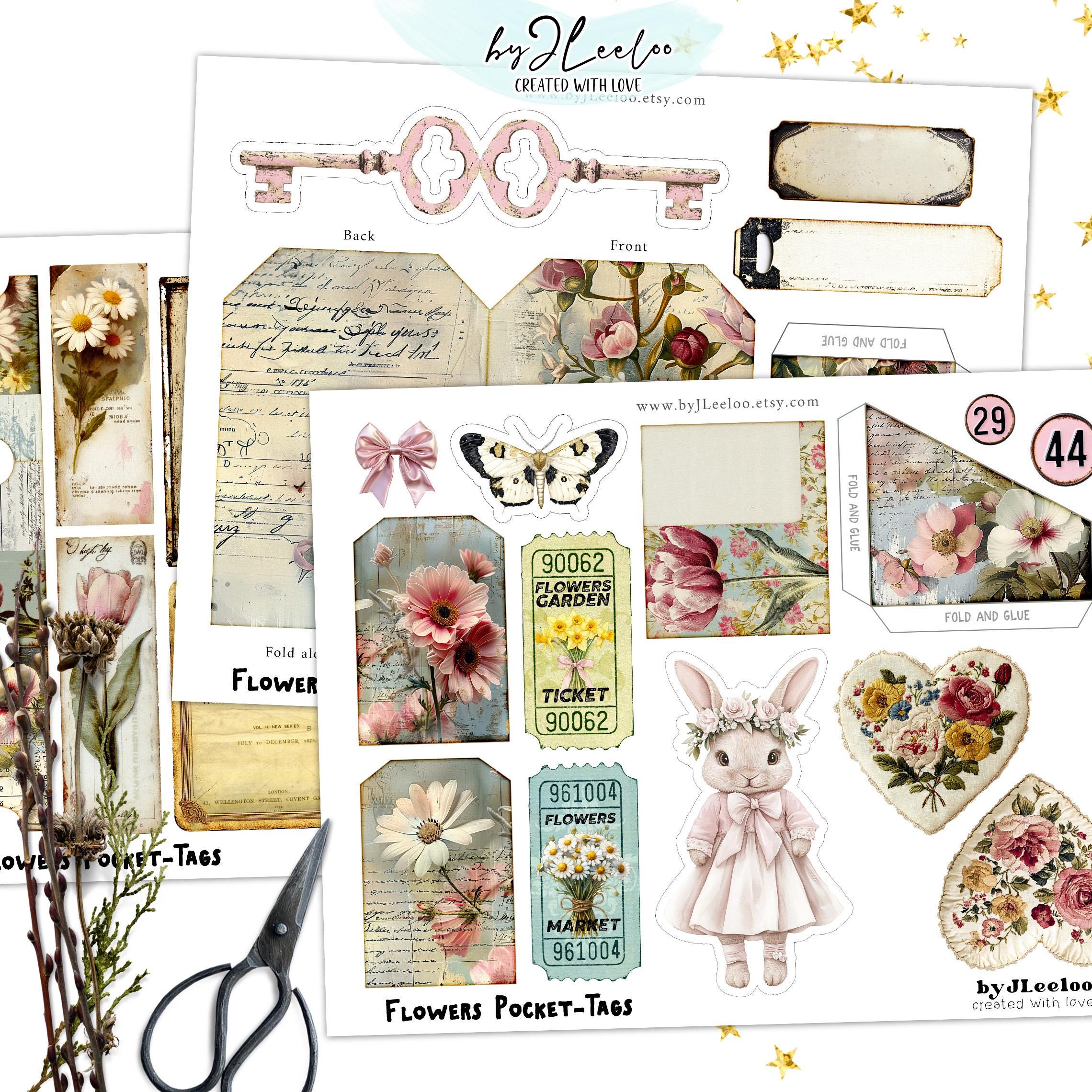 FLOWERS POCKET TAGS Kit with Backgrounds โ Vintage Floral Ephemera for Junk Journals and Scrapbooking | Printable Pocket Labels | tl323