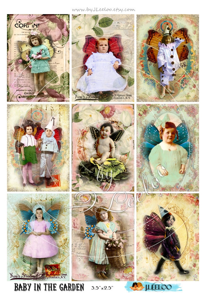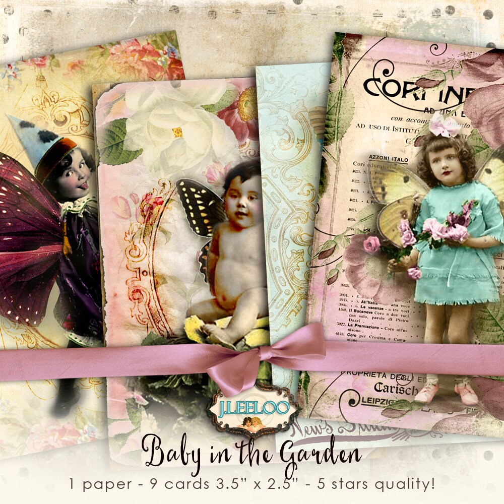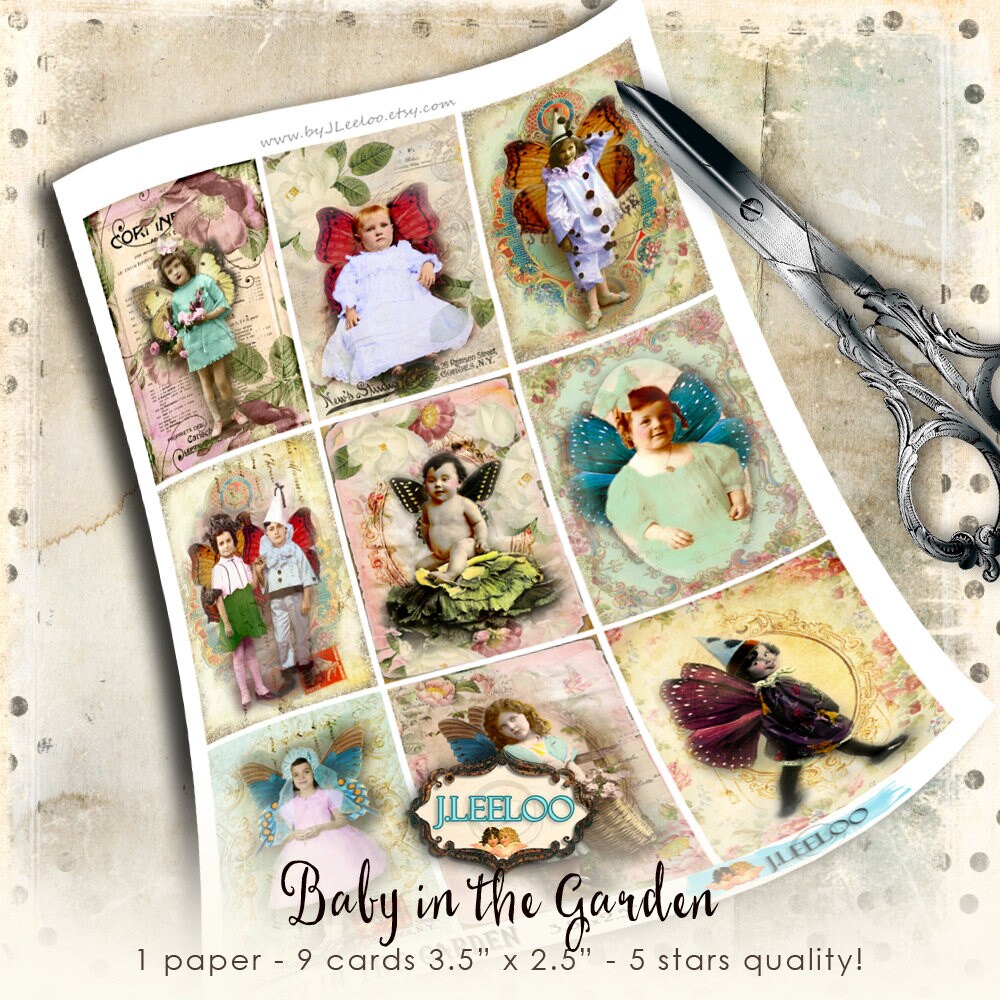 BABY in the GARDEN Digital collage sheet - Printable instant download paper for your artwork: scrapbook, diary art, hang tags, jewelry holders, invitations or announcements, greetings cards or backing cards.... for your creativity!