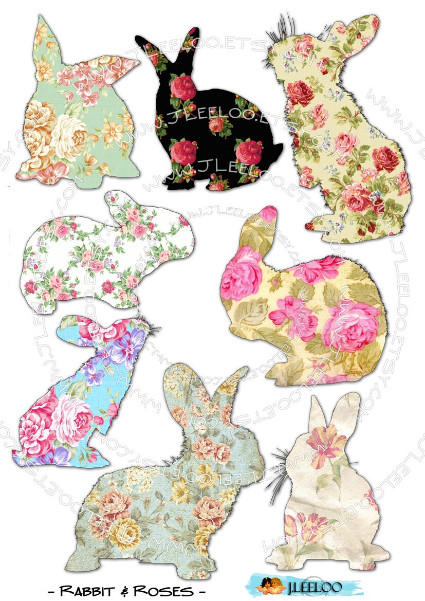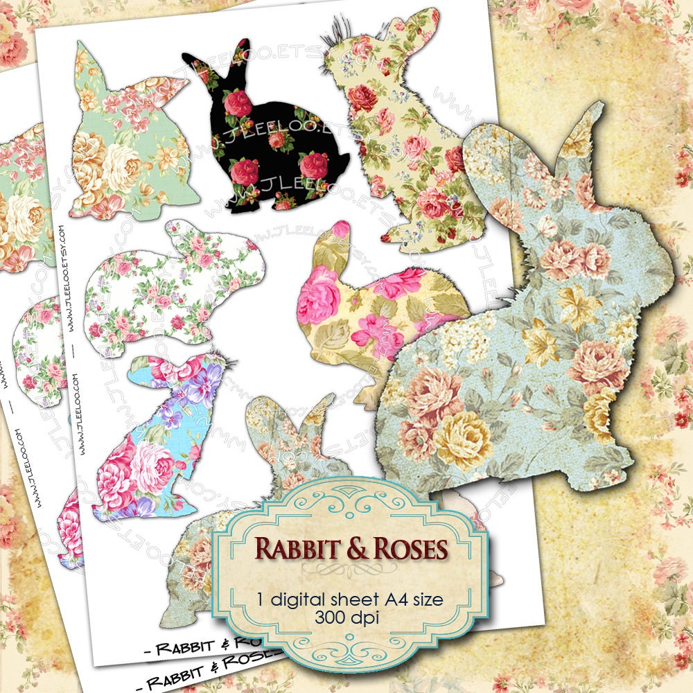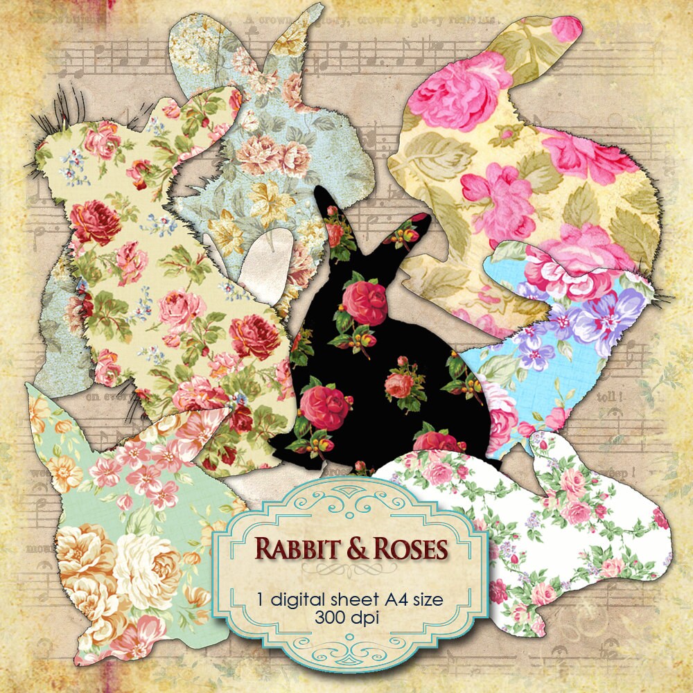 Rabbit and Roses - Digital images shabby chic for your crafting project - Download to print for scrapbooks, invitations, journaling, hang tags, card making, collages... a great supply for your artwork.
