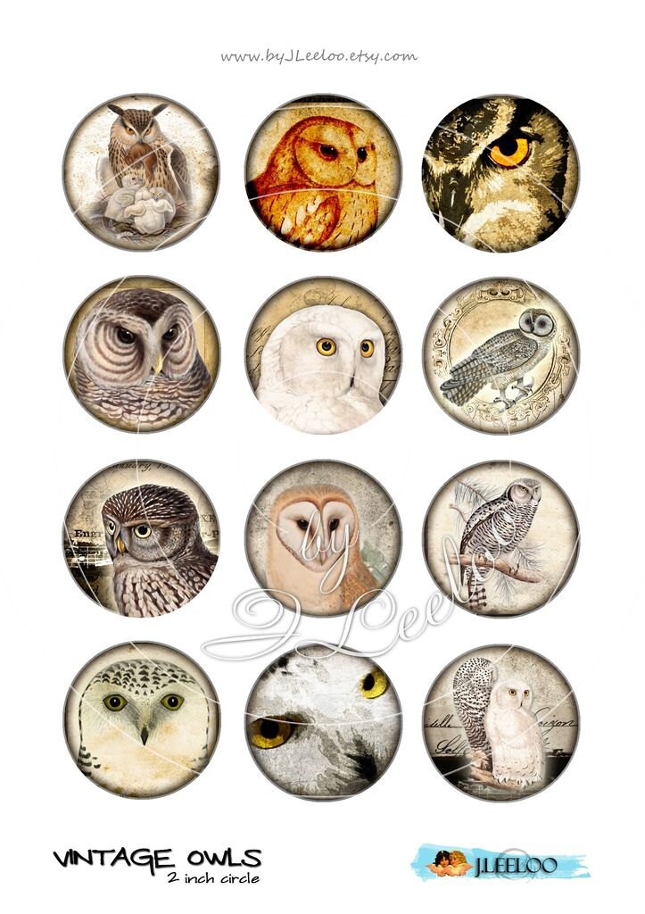 VINTAGE OWL Instant Download - Circle Hoot images digital collage sheets - Owl digital papers - Round images for mirror, tags, magnets, badges, jewelry