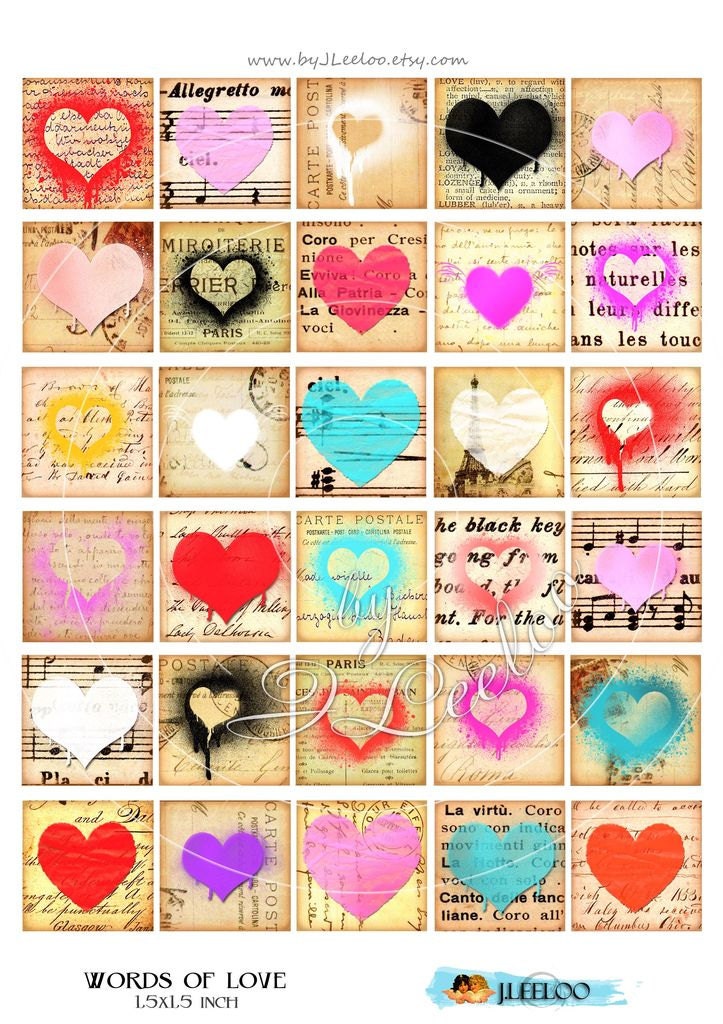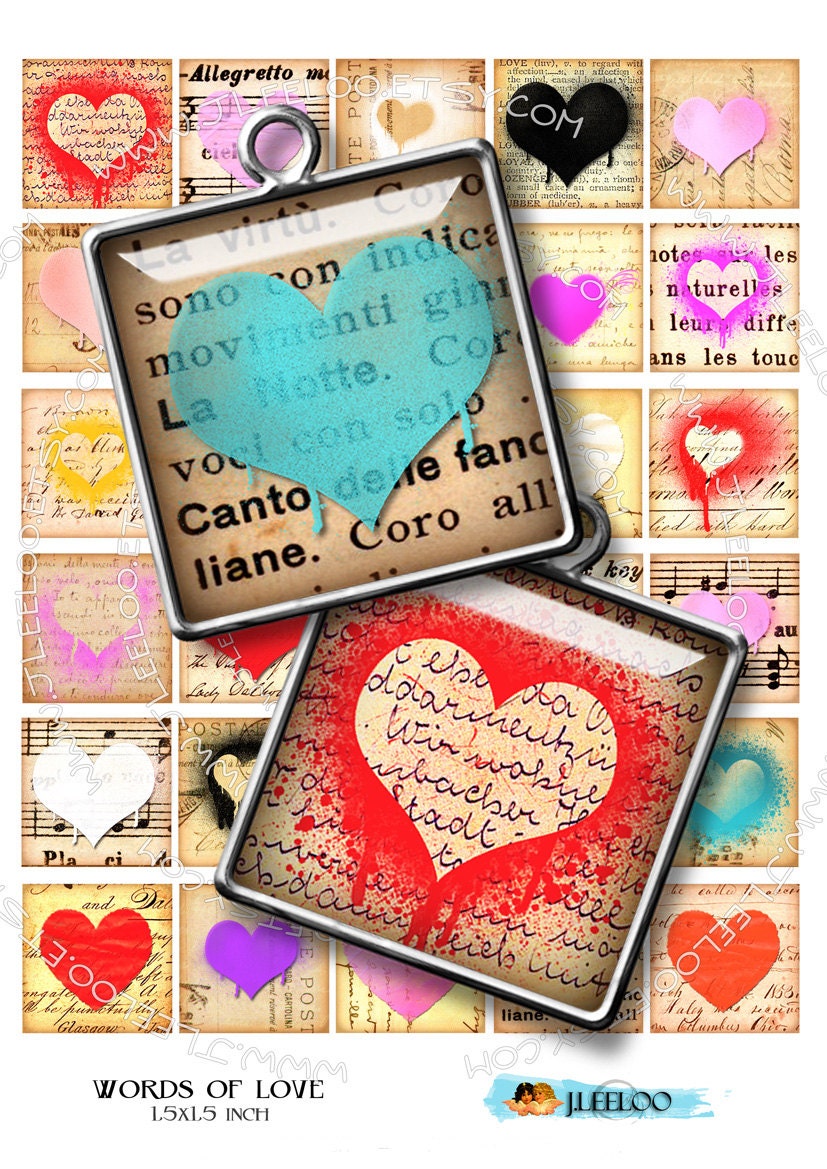 WORDS OF LOVE Digital collage sheets - Square images download to print for jewelry, resin pendants, glass cabochon, charms, magnets, stickers, scrap book, hang tags, a great supply for your craft project.