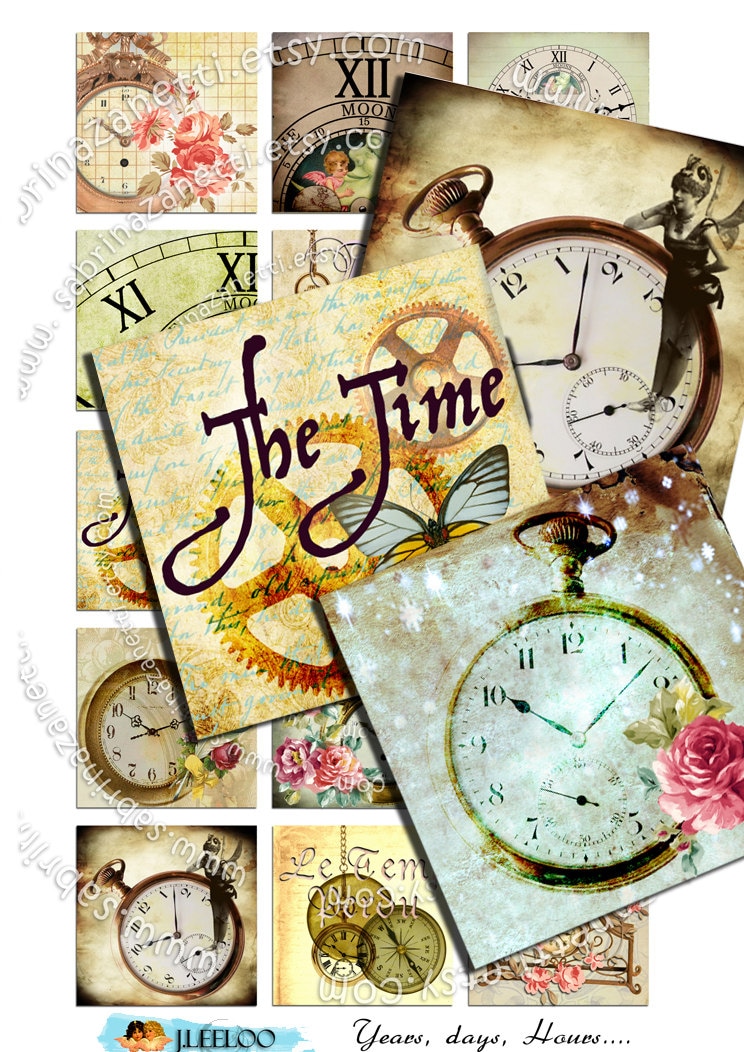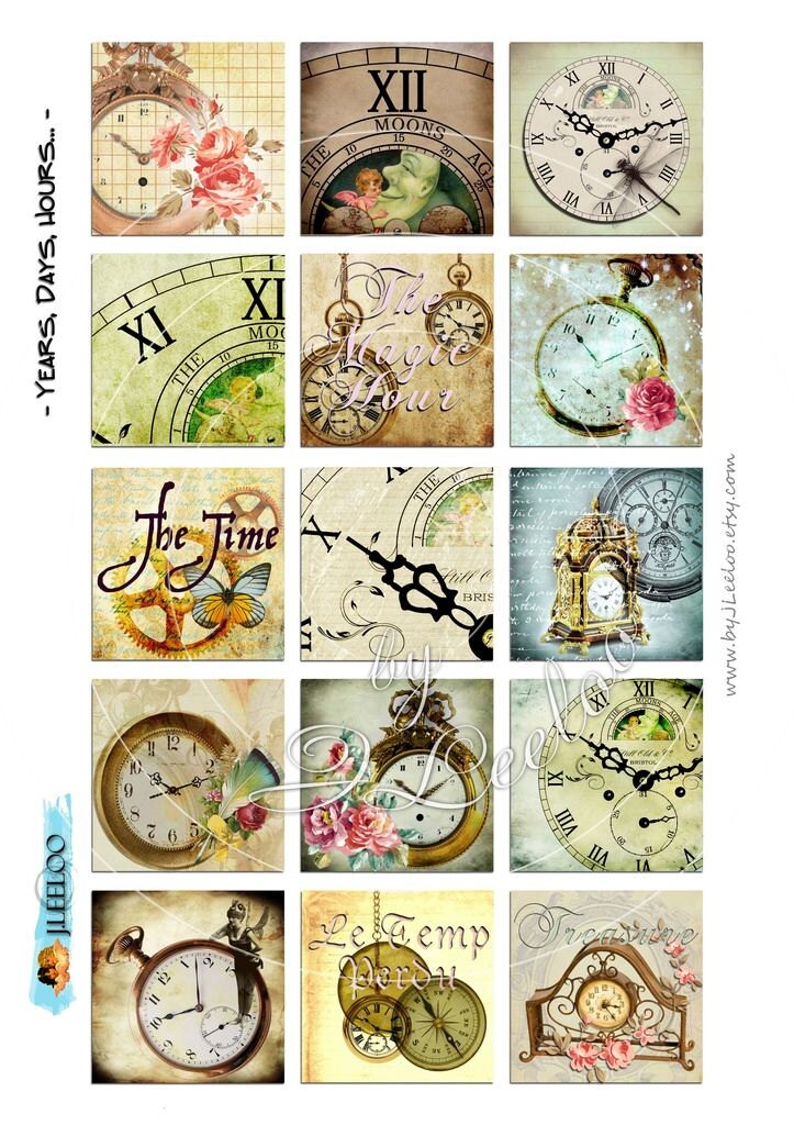 YEARS DAYS HOURS Digital collage sheets - Square images download to print for jewelry, resin pendants, glass cabochon, charms, magnets, stickers, scrap book, hang tags, a great supply for your craft project.
