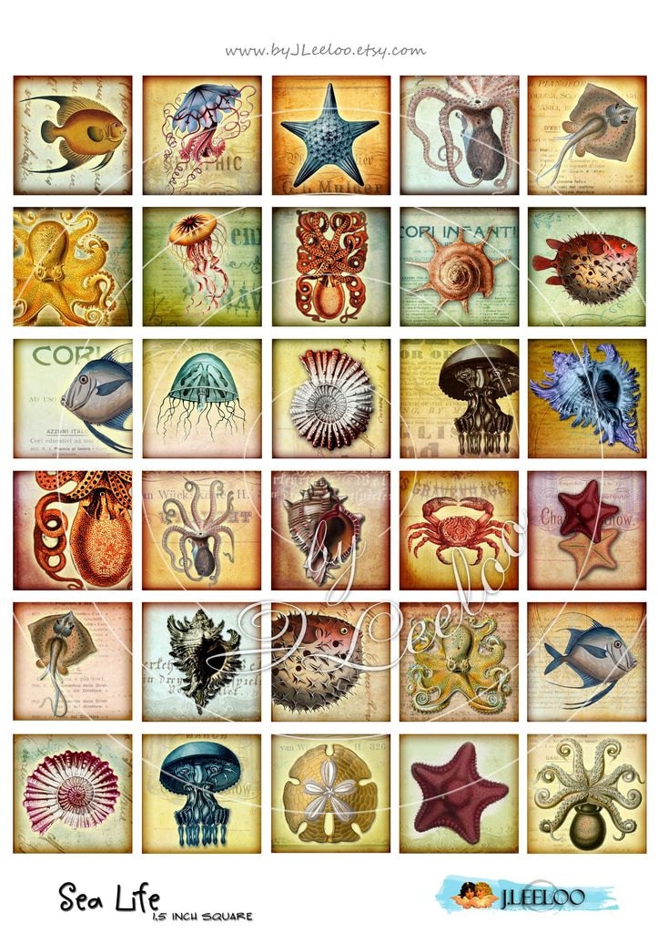 SEA LIFE Instant Download - Digital collage sheets - Square printable images for jewelry, glass cabochons, bottle caps, stickers, hang tags and all your artwork.