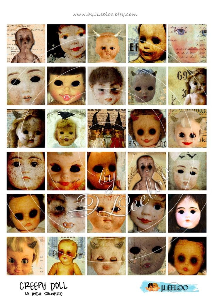 CREEPY DOLL Digital collage sheets - Square spooky scary images download to print for jewelry, resin pendants, glass cabochon, charms, magnets, stickers, scrap book, hang tags, a great supply for your craft project.