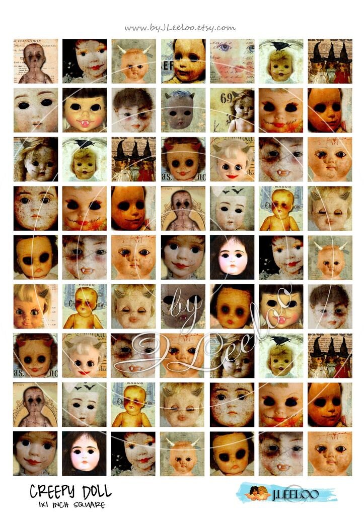 CREEPY DOLL Digital collage sheets - Square spooky scary images download to print for jewelry, resin pendants, glass cabochon, charms, magnets, stickers, scrap book, hang tags, a great supply for your craft project.