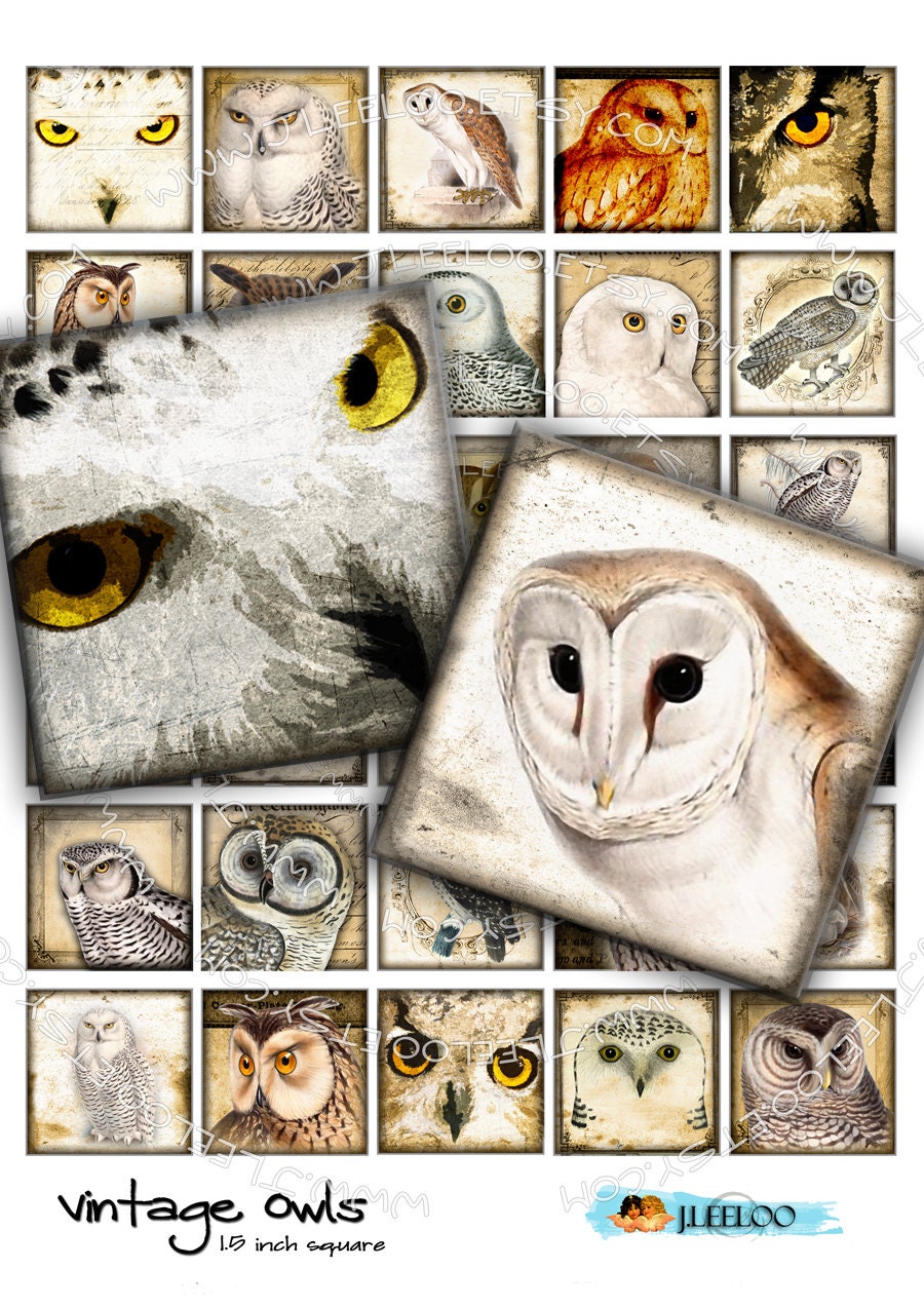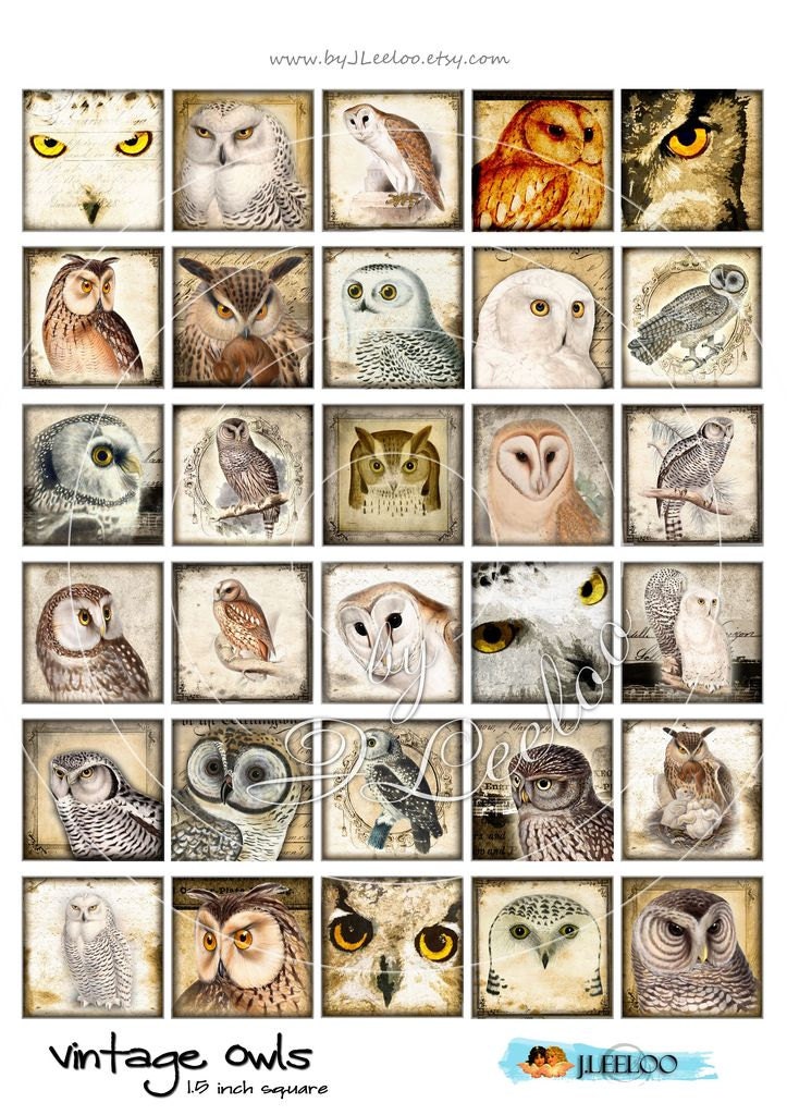 VINTAGE OWL Instant Download - Digital collage sheets - Square printable images for hang tags, resin pendants, charms, card making, button, magnets, stickers and all your craft project.