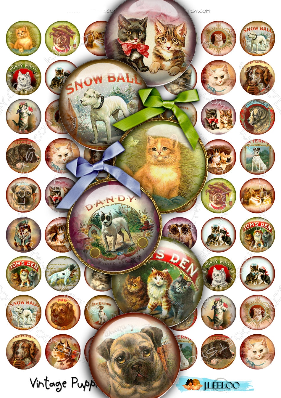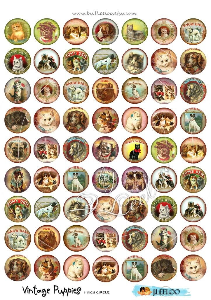 VINTAGE PUPPIES - Instant Download Digital collage sheets - Circle printable images for jewelry, glass cabochons, bottle caps, stickers, hang tags and all your artwork.