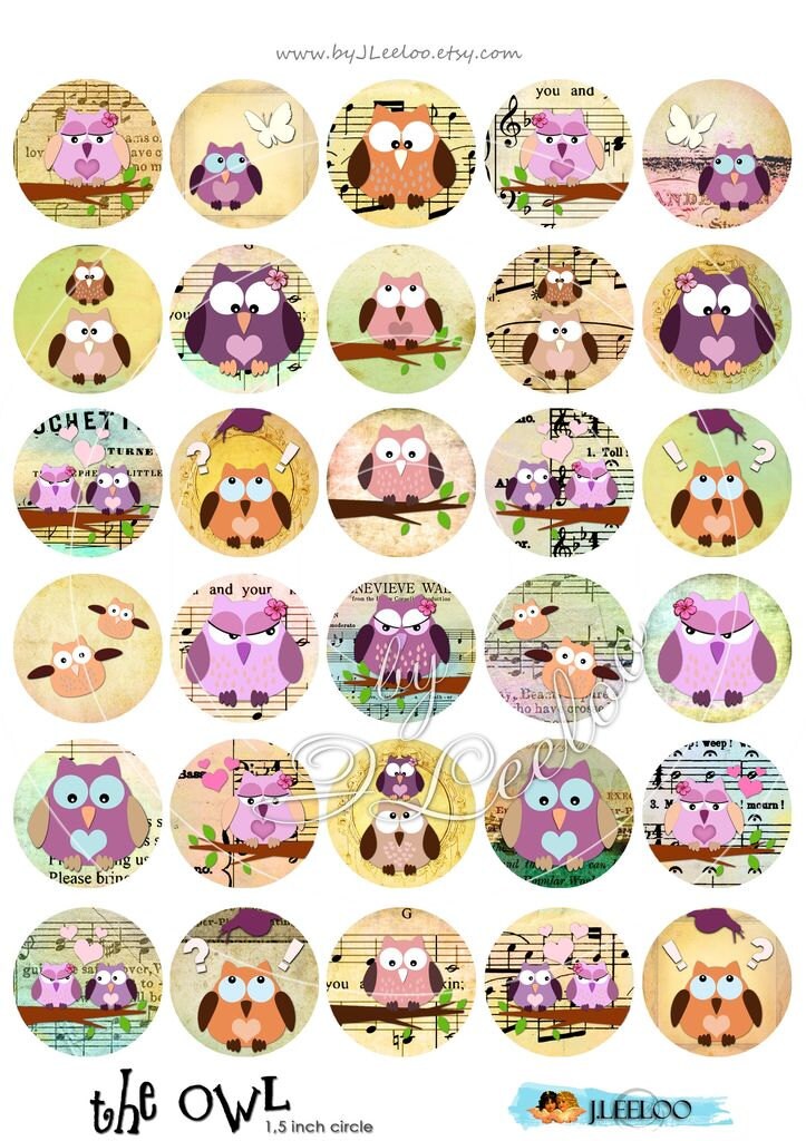 THE OWL - Instant Download Digital collage sheets - Circle clipart valentine printable images for jewelry, glass cabochons, bottle caps, stickers, hang tags and all your artwork.