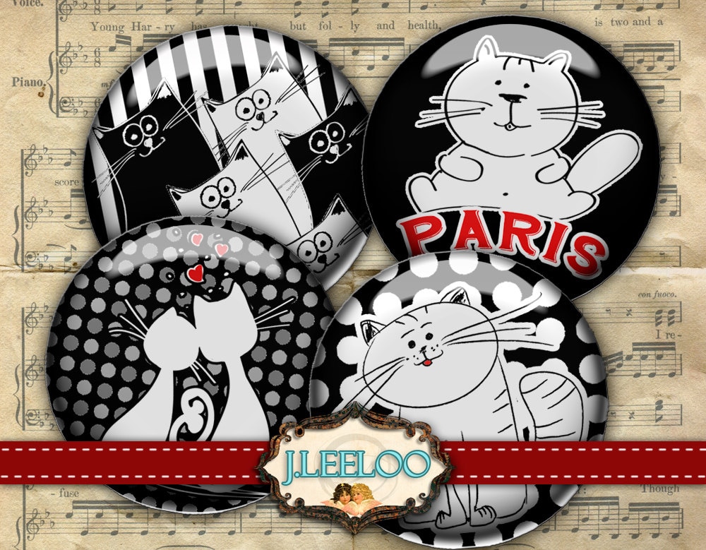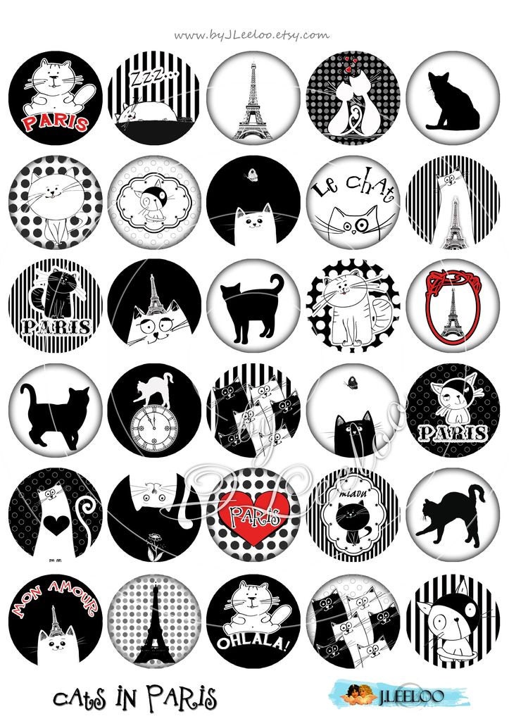 CATS IN PARIS Digital collage sheets - Circles images hand drawn instant download ready to print for thank you cards or hang tags, your jewelry making, resin pendants and button, for magnets, stickers, scrapbook and your others craft project.