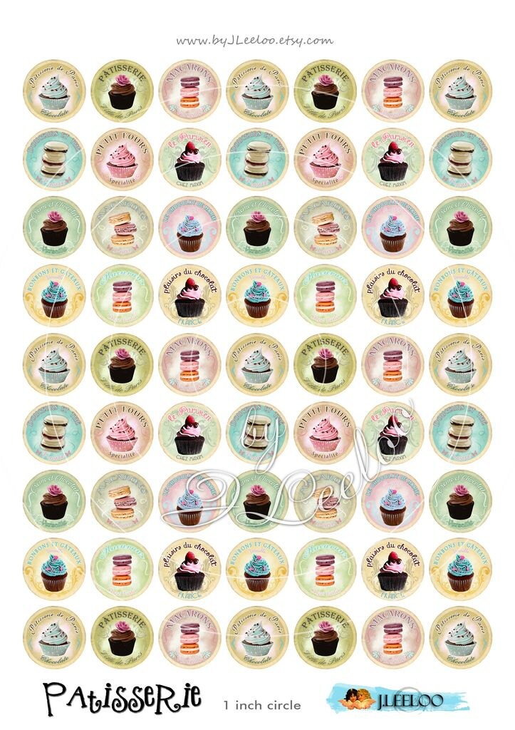 PATISSERIE Digital collage sheets - Circles images instant download ready to print for thank you cards or hang tags, your jewelry making, resin pendants, rings, earrings and button, for magnets, stickers, scrapbook and your others craft project.