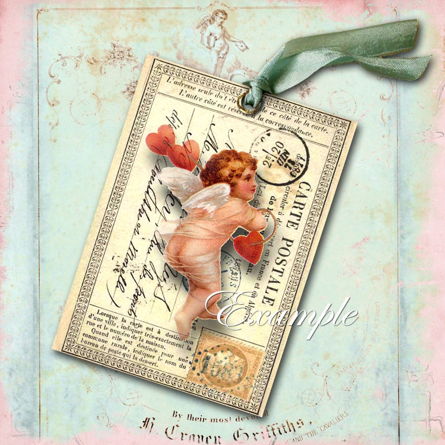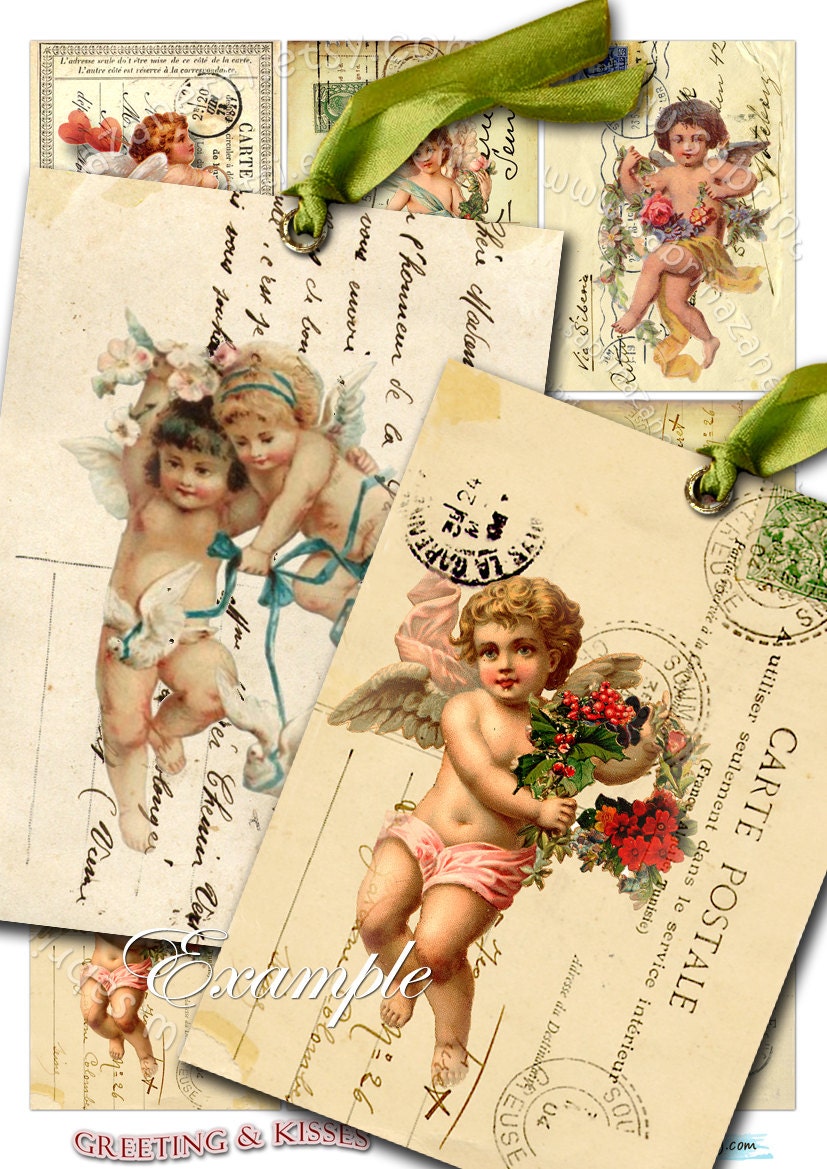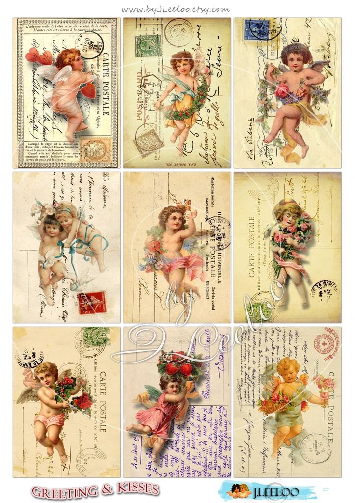 GREETING AND KISSES - Digital Download - Printable digital collage sheet - Paper postcard for your artwork: scrapbook, diary art, hang tags, jewelry holders, invitations or annuncements, greetings cards or backing cards.... for your creativity!