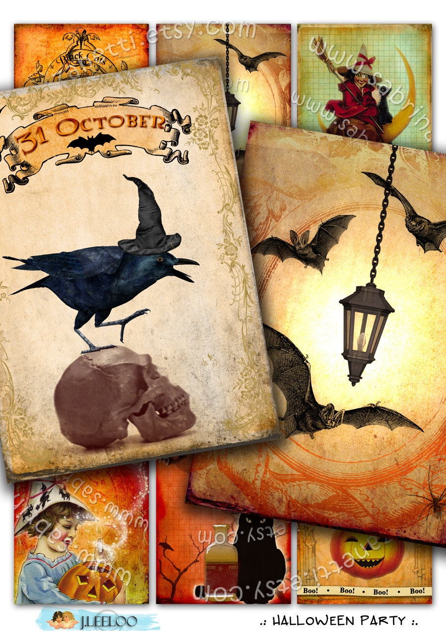 HALLOWEEN PARTY Digital collage sheet - Printable instant download paper for your artwork - scrapbook, diary art, hang tags, jewelry holders, invitations or annuncements, greetings cards or backing cards.... for your creativity!