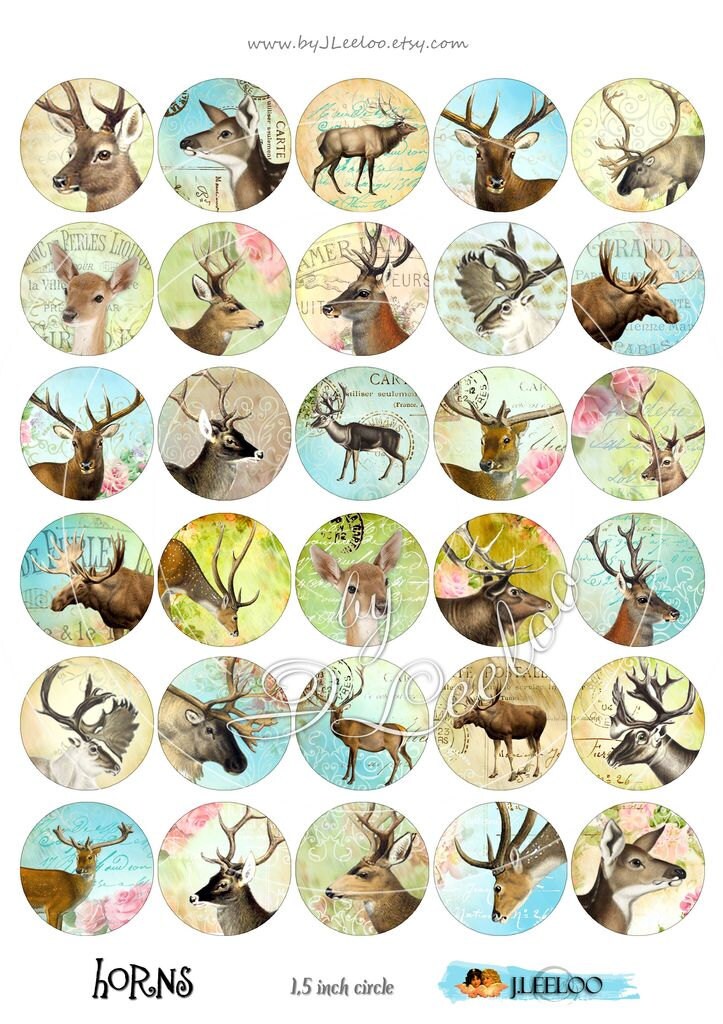 HORNS - Instant download printable - digital collage sheets - circle images for your crafting project - glass cabochons, jewelry, resin pendants, hang tags, rings, earrings and all your need for your art.