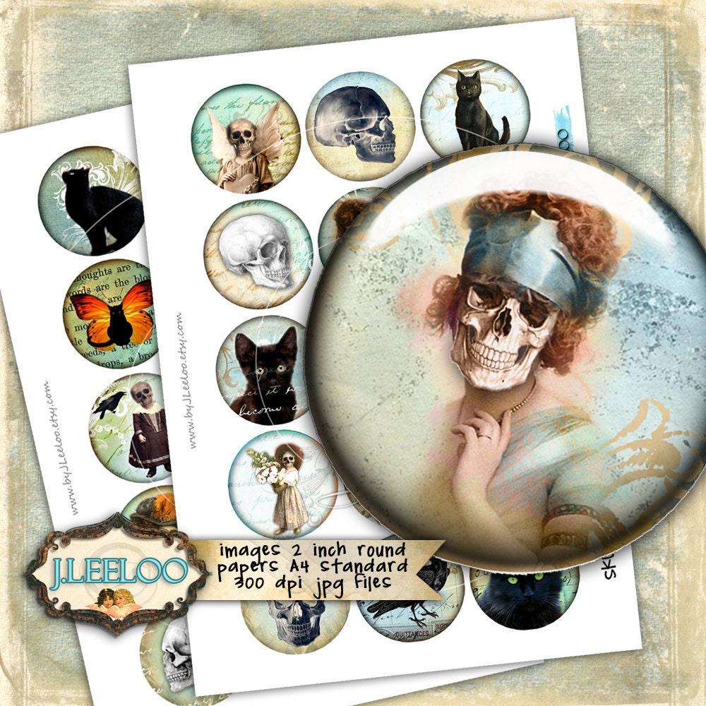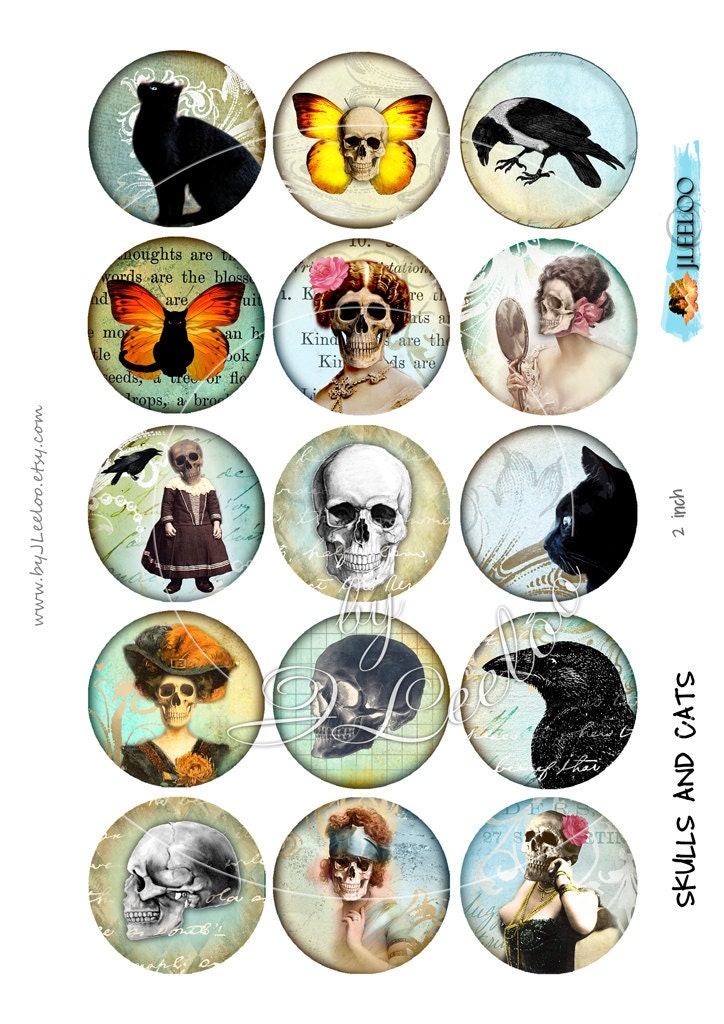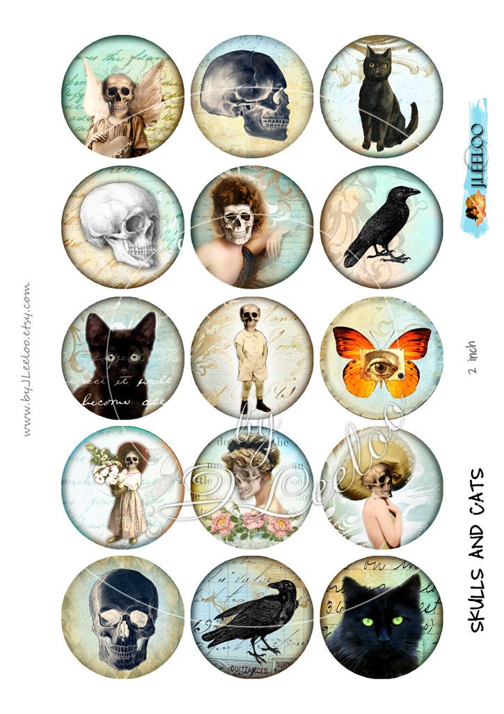 SKULLS AND CATS - Instant Download Digital collage sheets printable - Digital paper circle digital images 2 inch for pendants, jewelry and your craft and artwork.