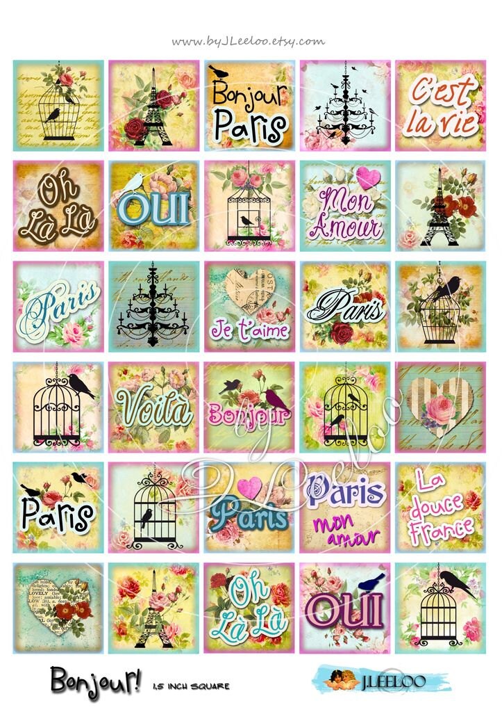 BONJOUR - Instant Download Digital collage sheets - Square france eiffel bird cage printable images for jewelry, glass cabochons, bottle caps, stickers, hang tags and all your artwork.