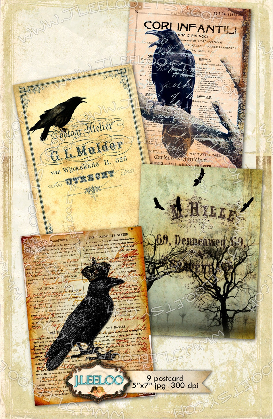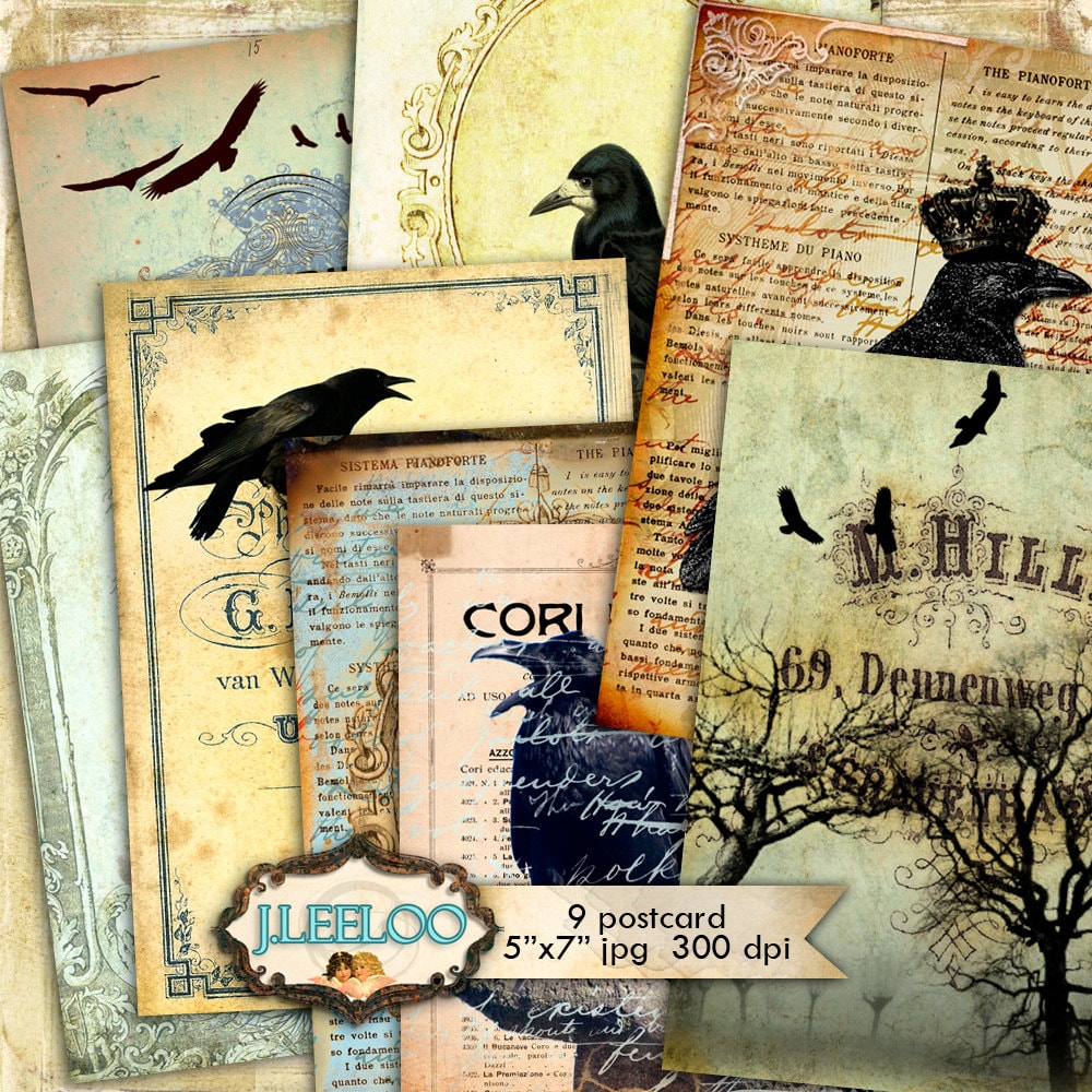RAVEN POSTCARD Digital collage sheet - Ghotic dark steampunk digital papers: images for your diary, artwork, postcards, hang tags, invitations, greeting cards, annuncements, scrapbook, backing cards.... all for your crafting project!