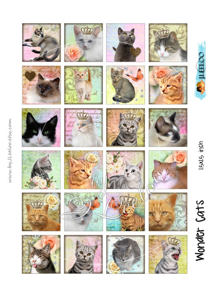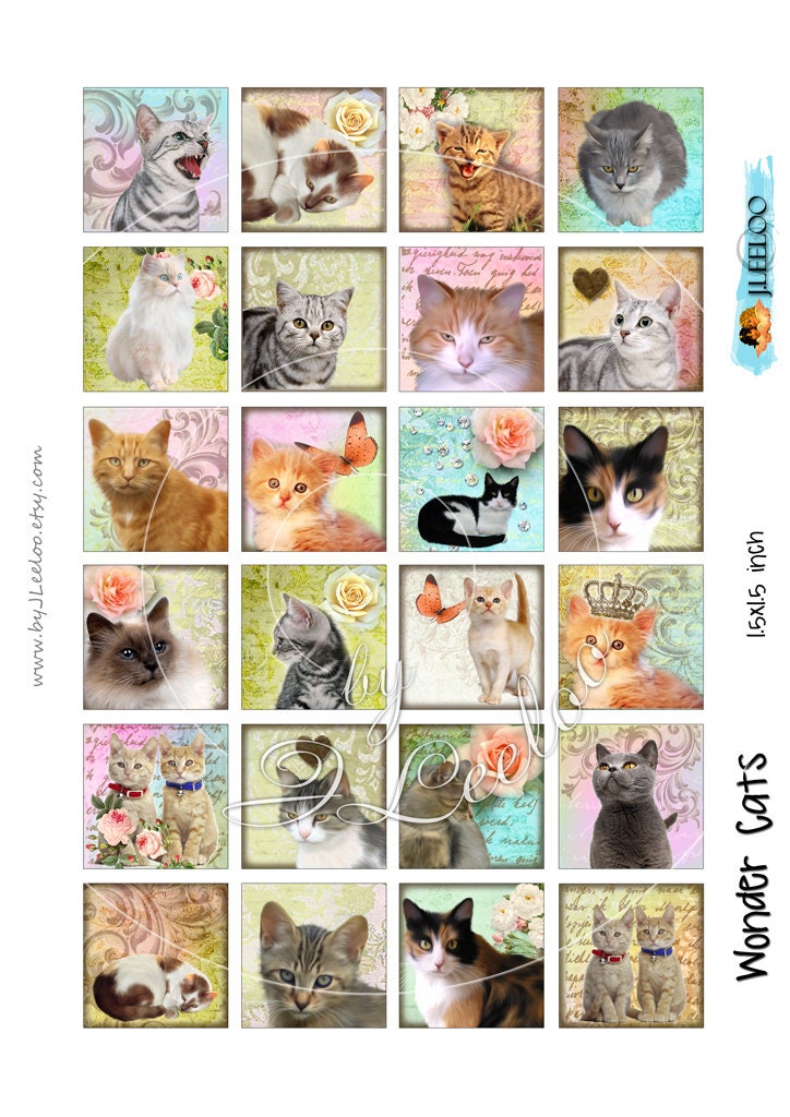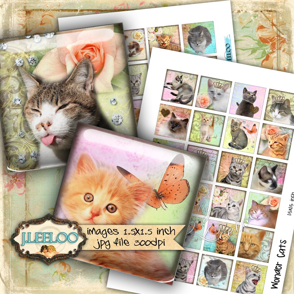 WONDER CATS Digital collage sheets - Square images download to print for jewelry, resin pendants, glass cabochon, charms, magnets, stickers, scrap book, hang tags, a great supply for your craft project.