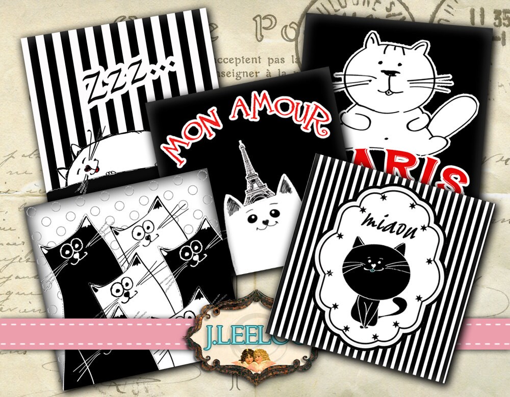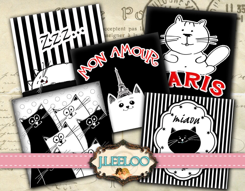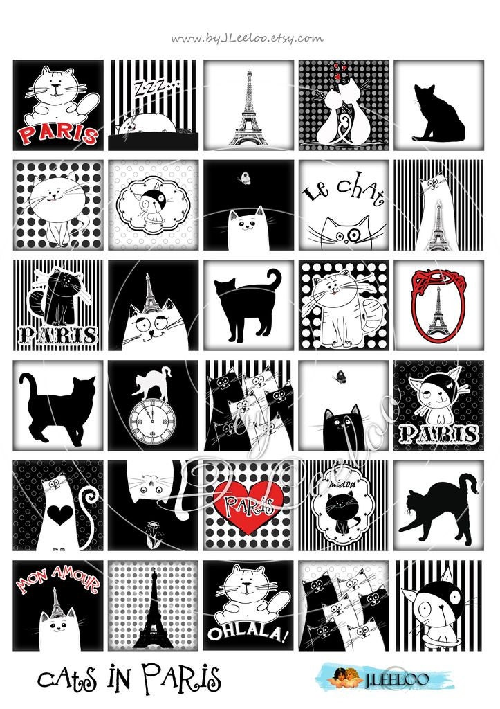 CATS IN PARIS Digital collage sheets - Square images hand drawn instant download ready to print for thank you cards or hang tags, your jewelry making, resin pendants and button, for magnets, stickers, scrapbook and your others craft project.