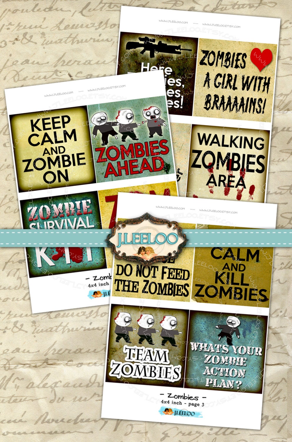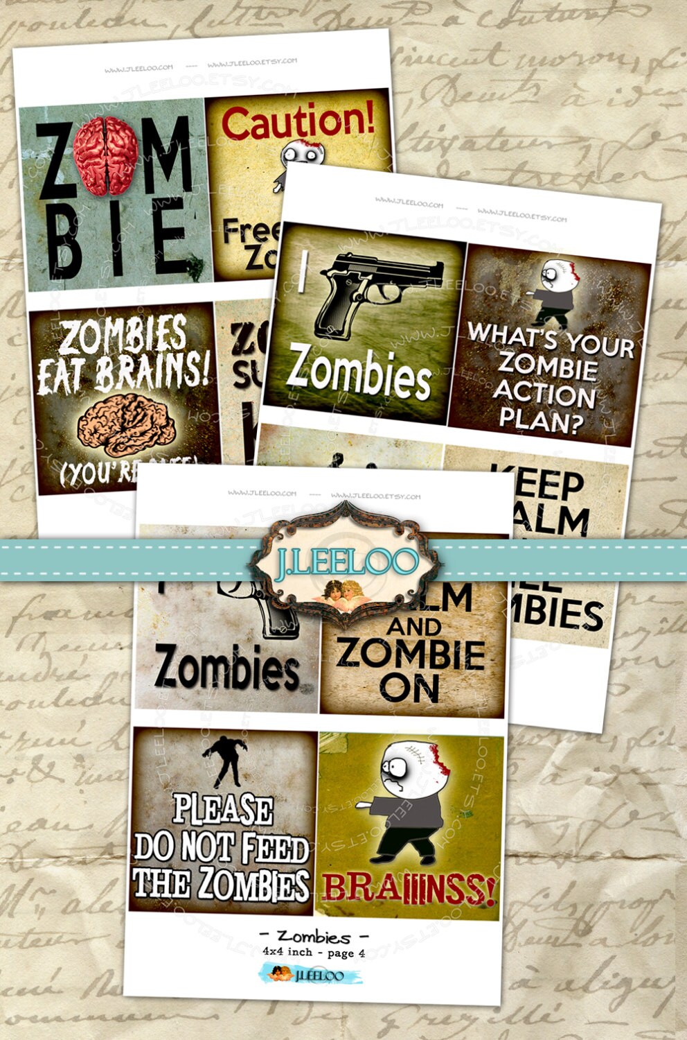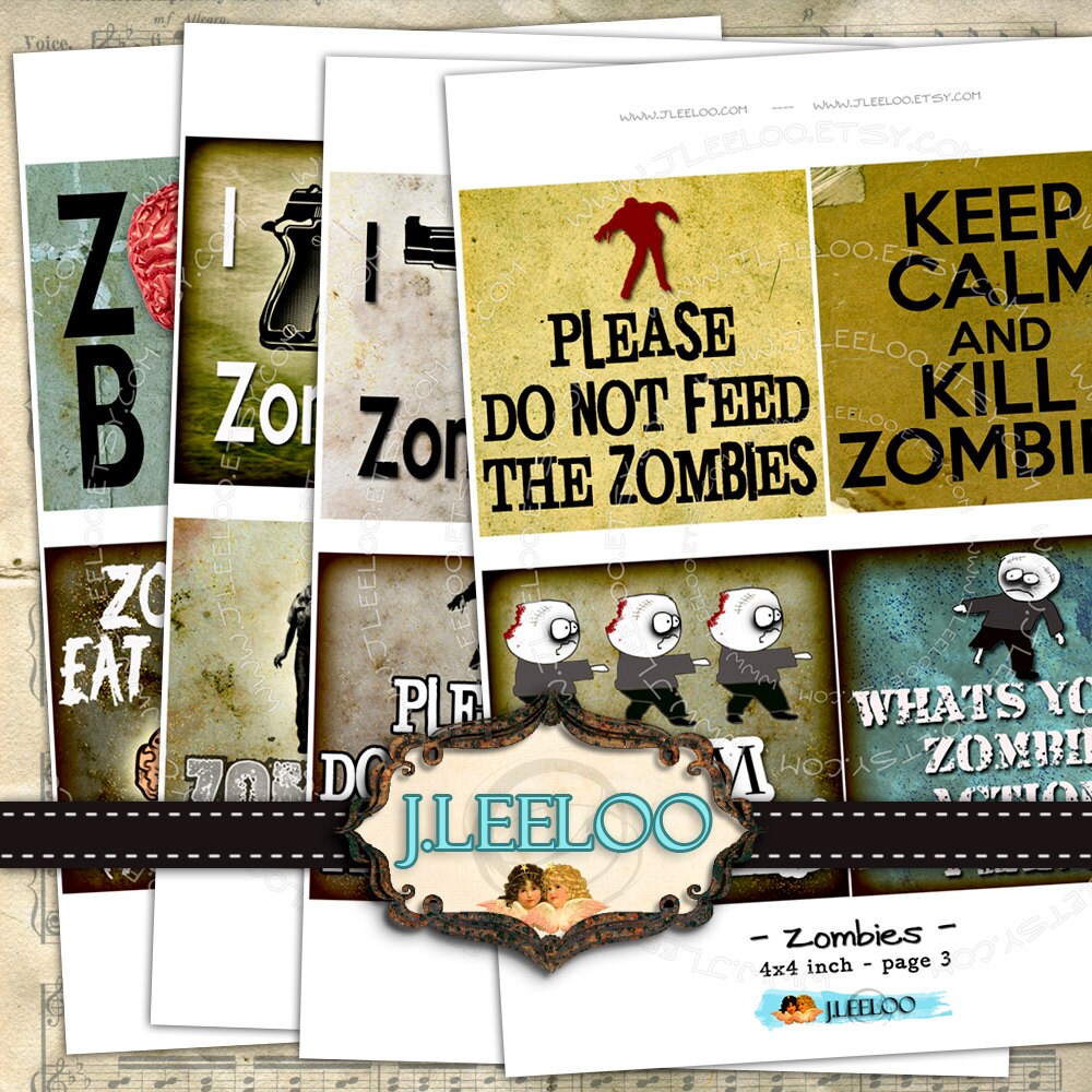 ZOMBIE Instant Download - Digital collage sheets - Square printable images for coaster, jewelry holder, hang tags, glass cabochons, bottle caps, stickers and all your artwork.