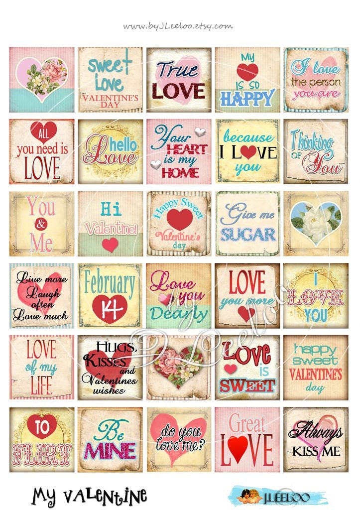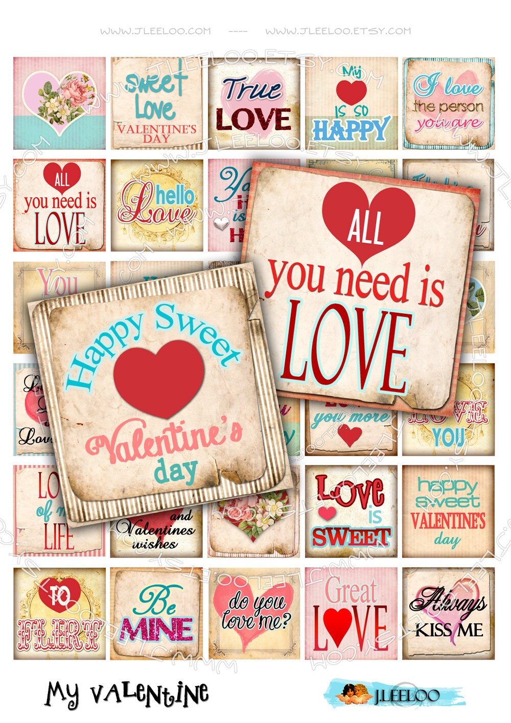 VALENTINE DAY Instant Download - Digital collage sheets - Square printable images for jewelry, glass cabochons, paper goods, cards, bottle caps, stickers, hang tags and all your artwork.