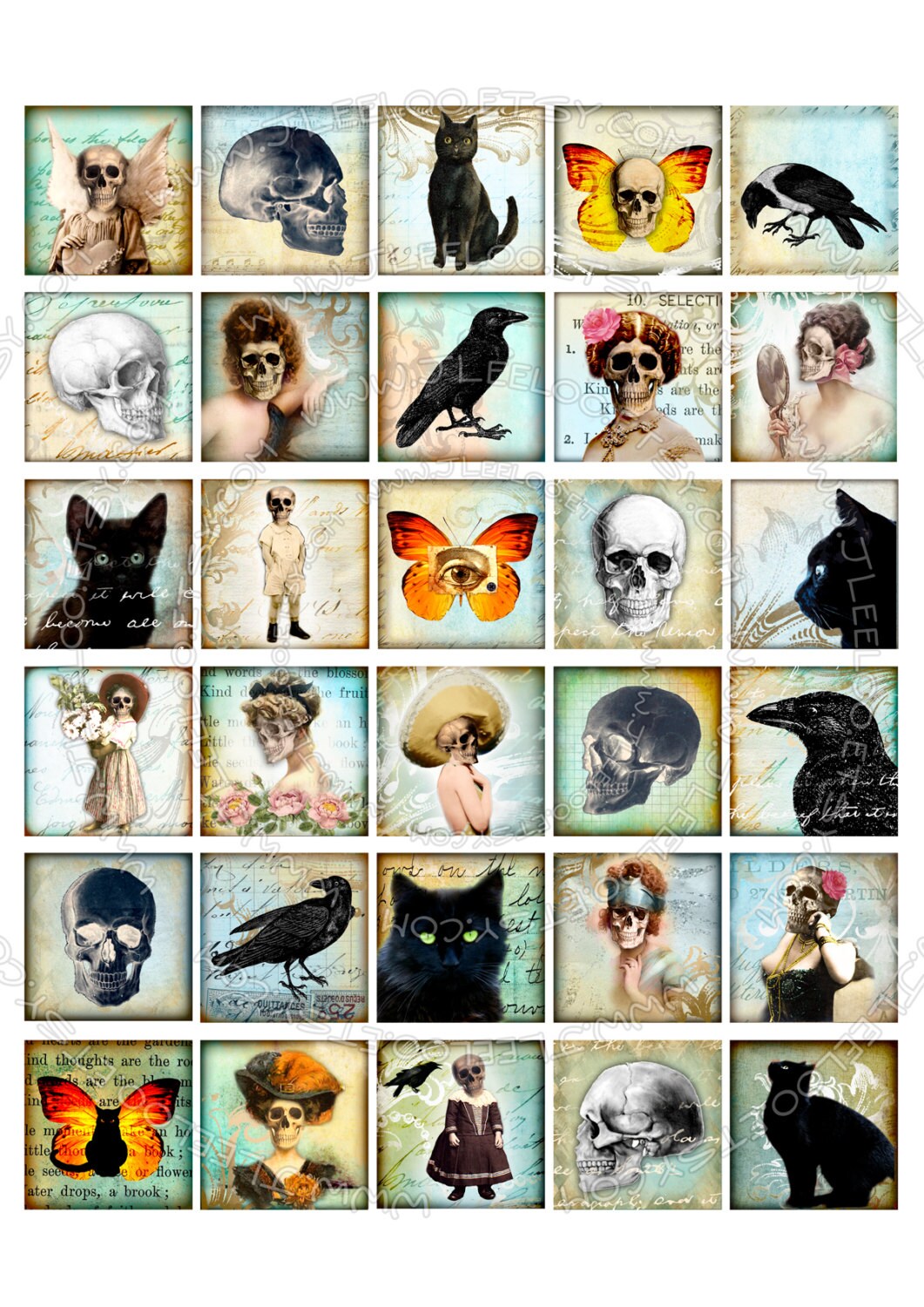 SKULLS AND CATS Instant Download - Digital collage sheets - Squares printable images for coaster, jewelry holder, hang tags, stickers and all your craft project.
