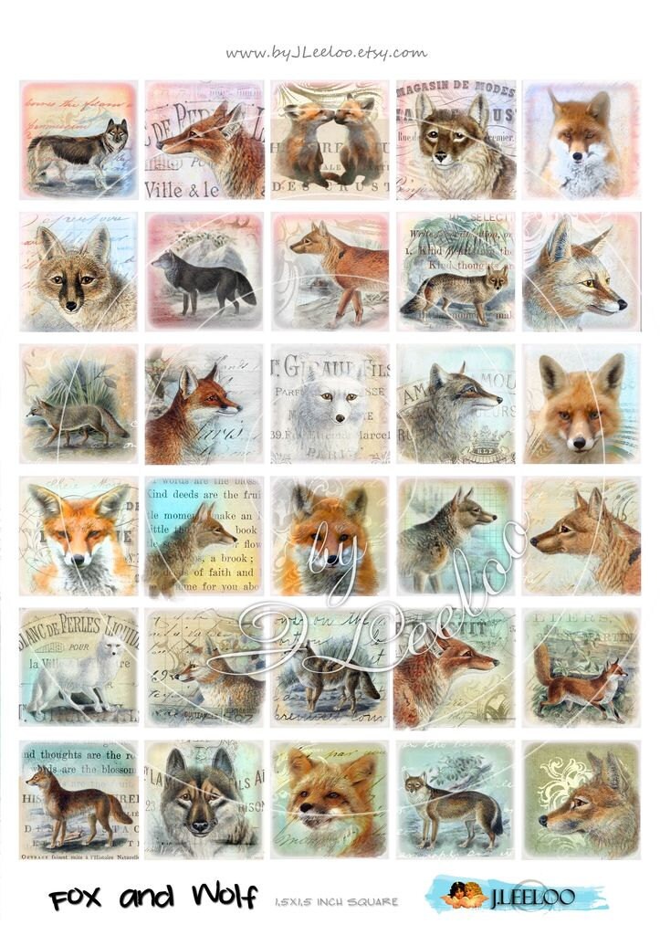 FOX AND WOLF - Instant download printable - digital collage sheets - square images for your crafting project - magnets, glass cabochons, jewelry, resin pendants, hang tags, rings, earrings and all your need for your art.