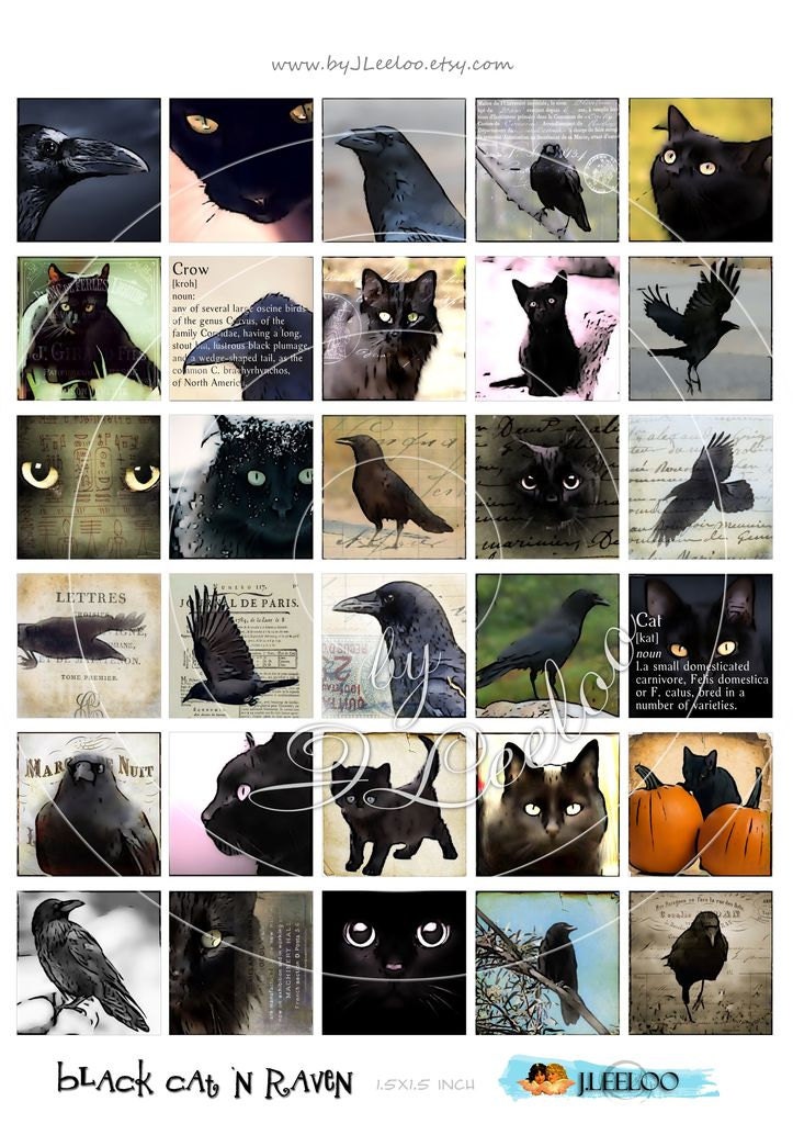 BLACK CAT AND RAVEN Instant Download - Digital collage sheets - square printable images for resin pendants, charms, card making, button, magnets, stickers and all your craft project.