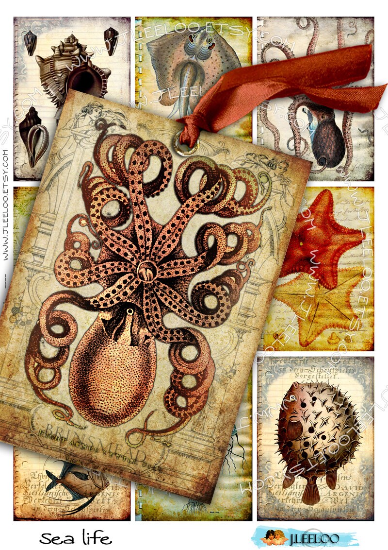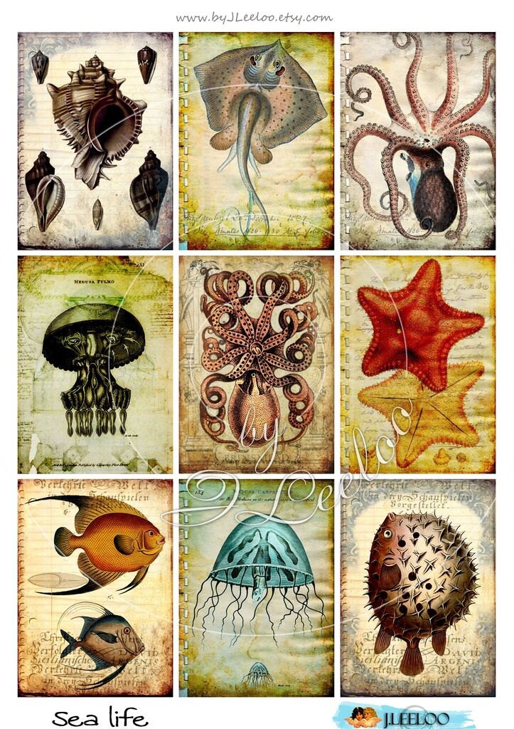 SEA LIFE Digital collage sheet - Instant download printable for your artwork - scrapbook, diary art, hang tags, jewelry holders, invitations or annuncements, greetings cards or backing cards.... for your creativity!