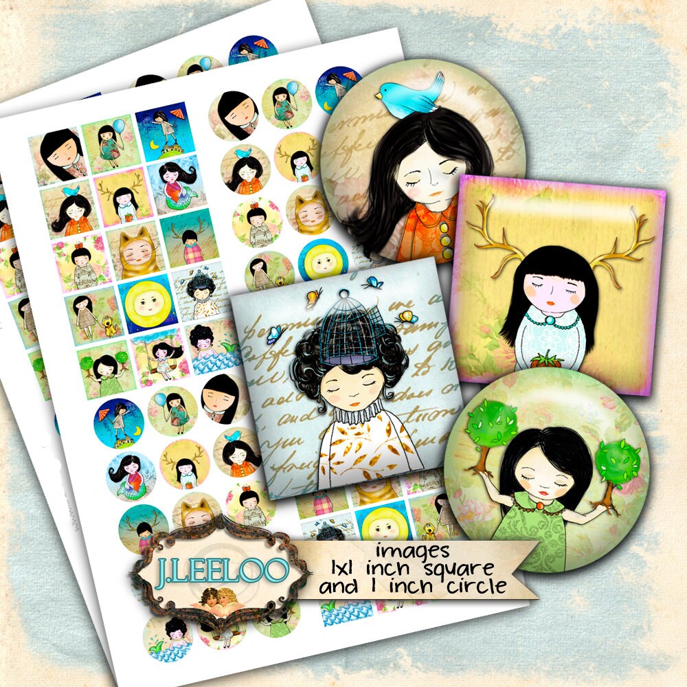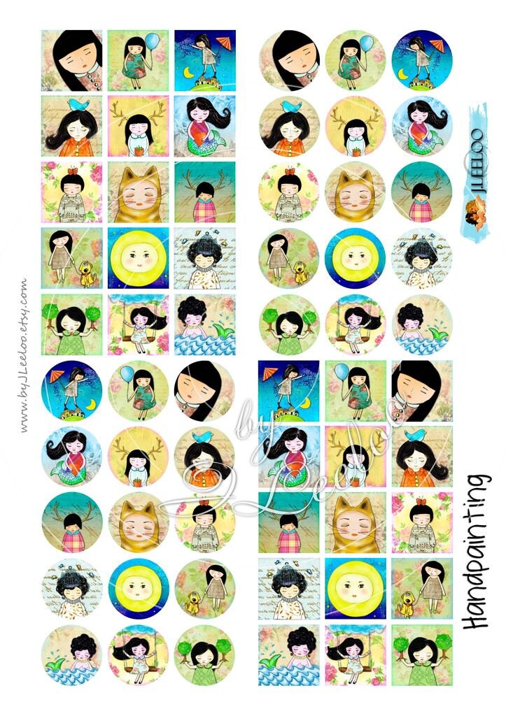 HANDPAINTING Instant Download - Digital collage sheets printable - Digital paper hand-drawing - Circle and square digital images 1 inch for pendants, jewelry and your craft and artwork.