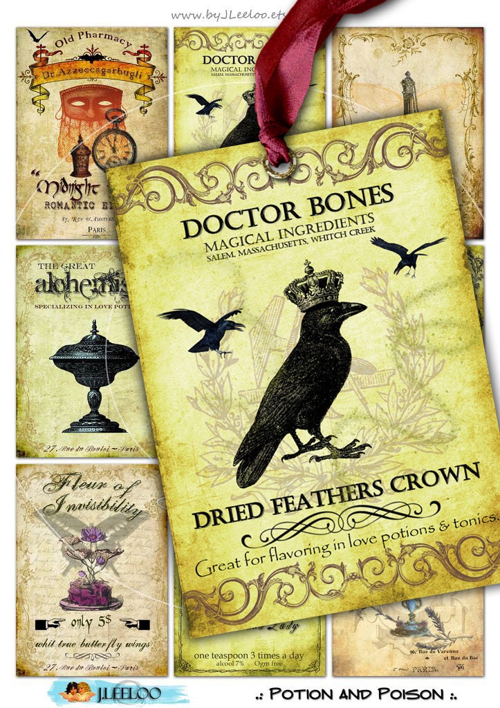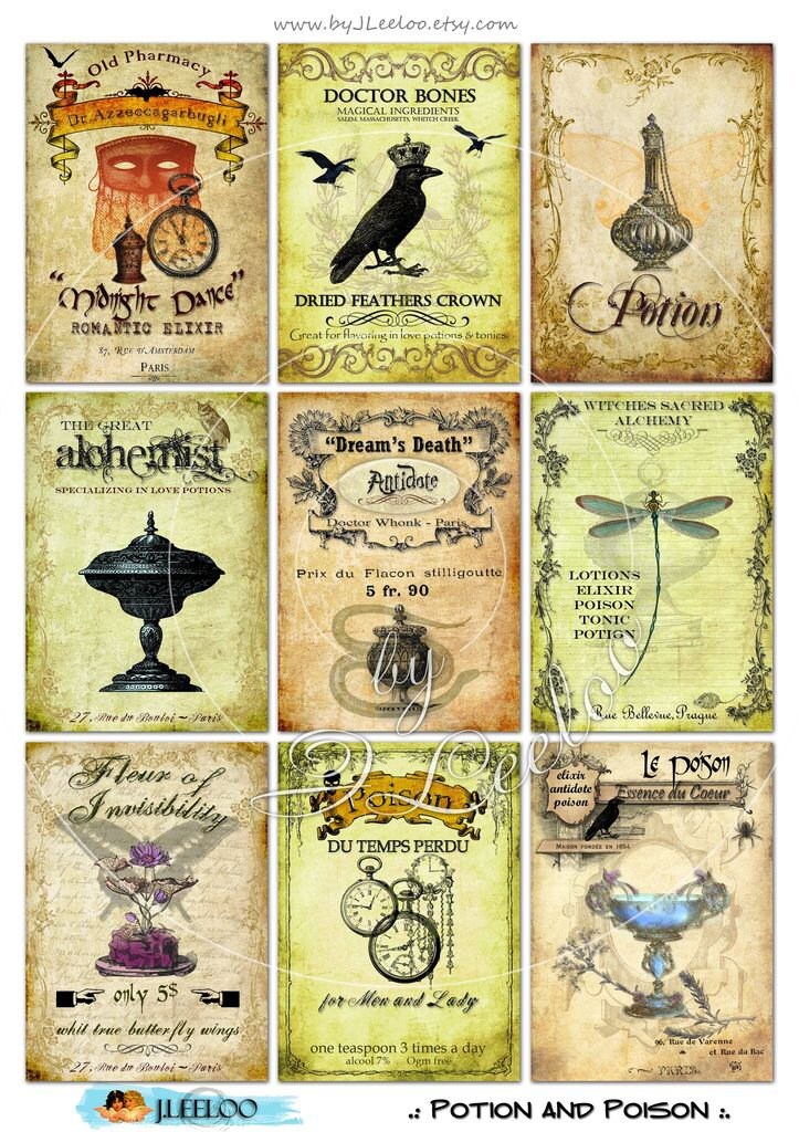 POTIONN AND POISON Digital collage sheet - Printable instant download paper for your artwork - scrapbook, diary art, hang tags, jewelry holders, invitations or annuncements, greetings cards or backing cards.... for your creativity!