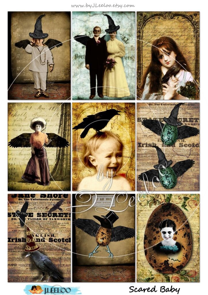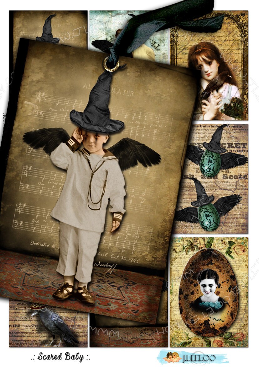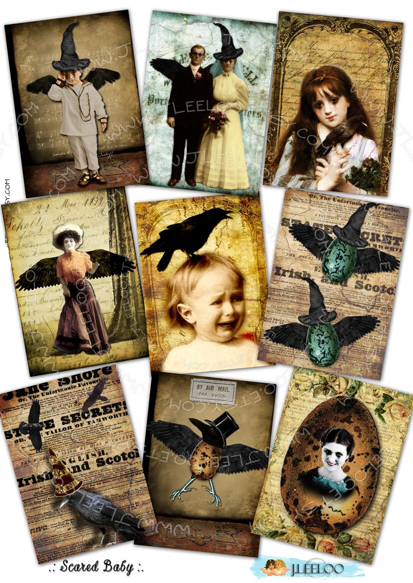 SCARED BABY - Printable digital collage sheet - Ghotic aceo size for your artwork: atc cards, scrapbook, diary art, hang tags, jewelry holders, invitations or annuncements, greetings cards or backing cards.... for your creativity!