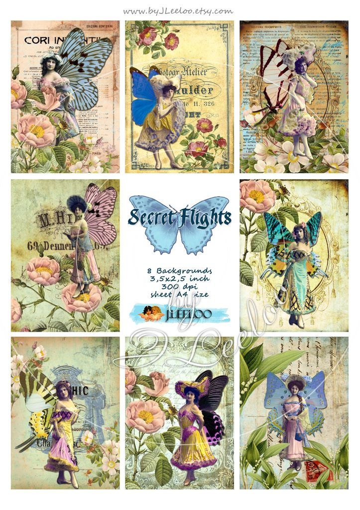SECRET FLIGHTS - Printable digital collage sheet - For your artwork: aceo or atc cards, scrapbook, diary art, hang tags, jewelry holders, invitations or annuncements, greetings cards or backing cards.... for your creativity!