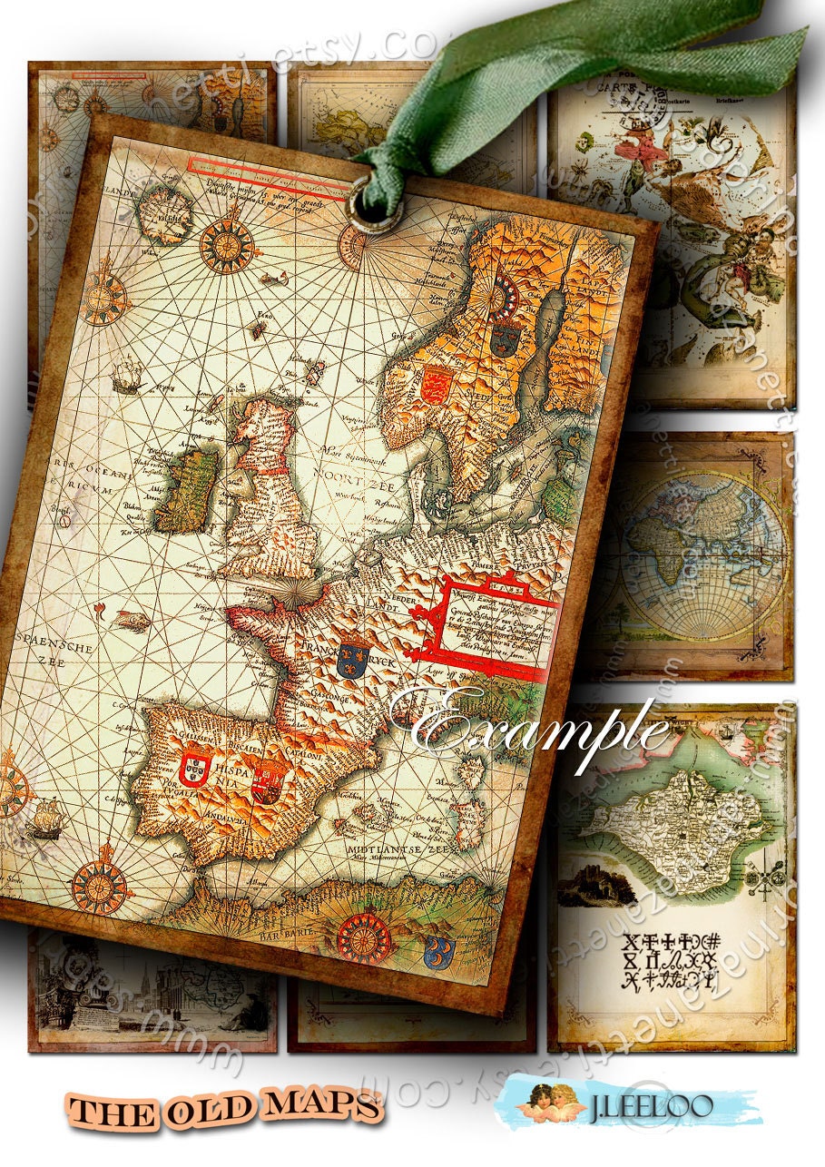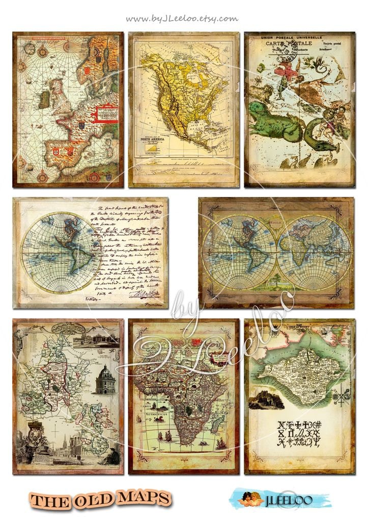 THE OLD MAPS - Printable digital collage sheet - Handwriting old book papers for your artwork: aceo or atc cards, scrapbook, diary art, hang tags, jewelry holders, invitations or annuncements, greetings cards or backing cards.... for your creativity!