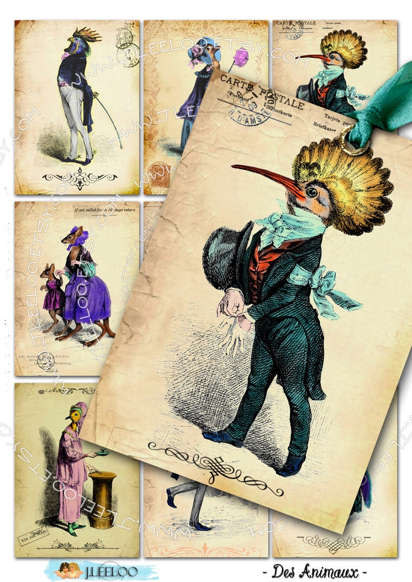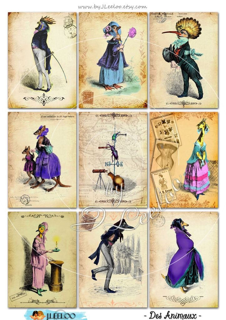 DES ANIMAUX Digital Download - Printable digital collage sheet - Anthropomorphic recolored for your artwork: scrapbook, diary art, hang tags, jewelry holders, invitations or annuncements, greetings cards or backing cards.... for your creativity!