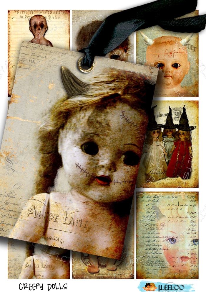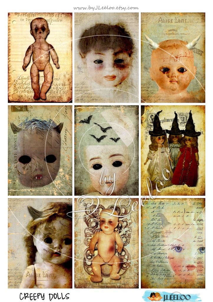 CREEPY DOLLS - Printable digital collage sheet - Ghotic aceo size for your artwork: atc cards, scrapbook, diary art, hang tags, jewelry holders, invitations or annuncements, greetings cards or backing cards.... for your creativity!