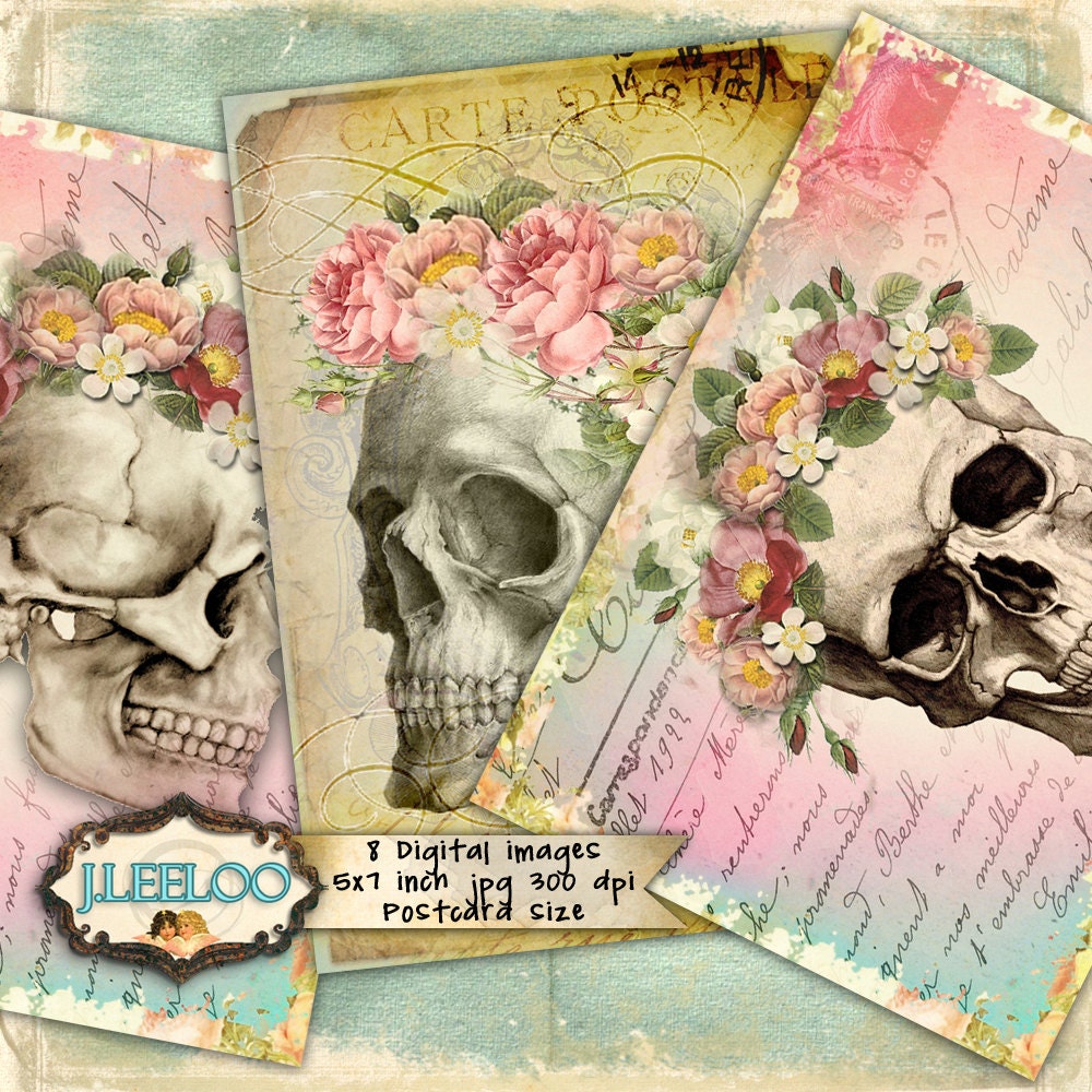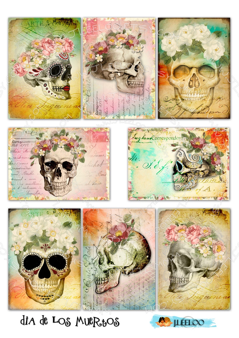 DIA DE LOS MUERTOS Digital collage sheet - Halloween postcards printable instant download paper for your artwork - scrapbook, diary art, hang tags, jewelry holders, invitations or annuncements, greetings cards or backing cards.... for your creativity!