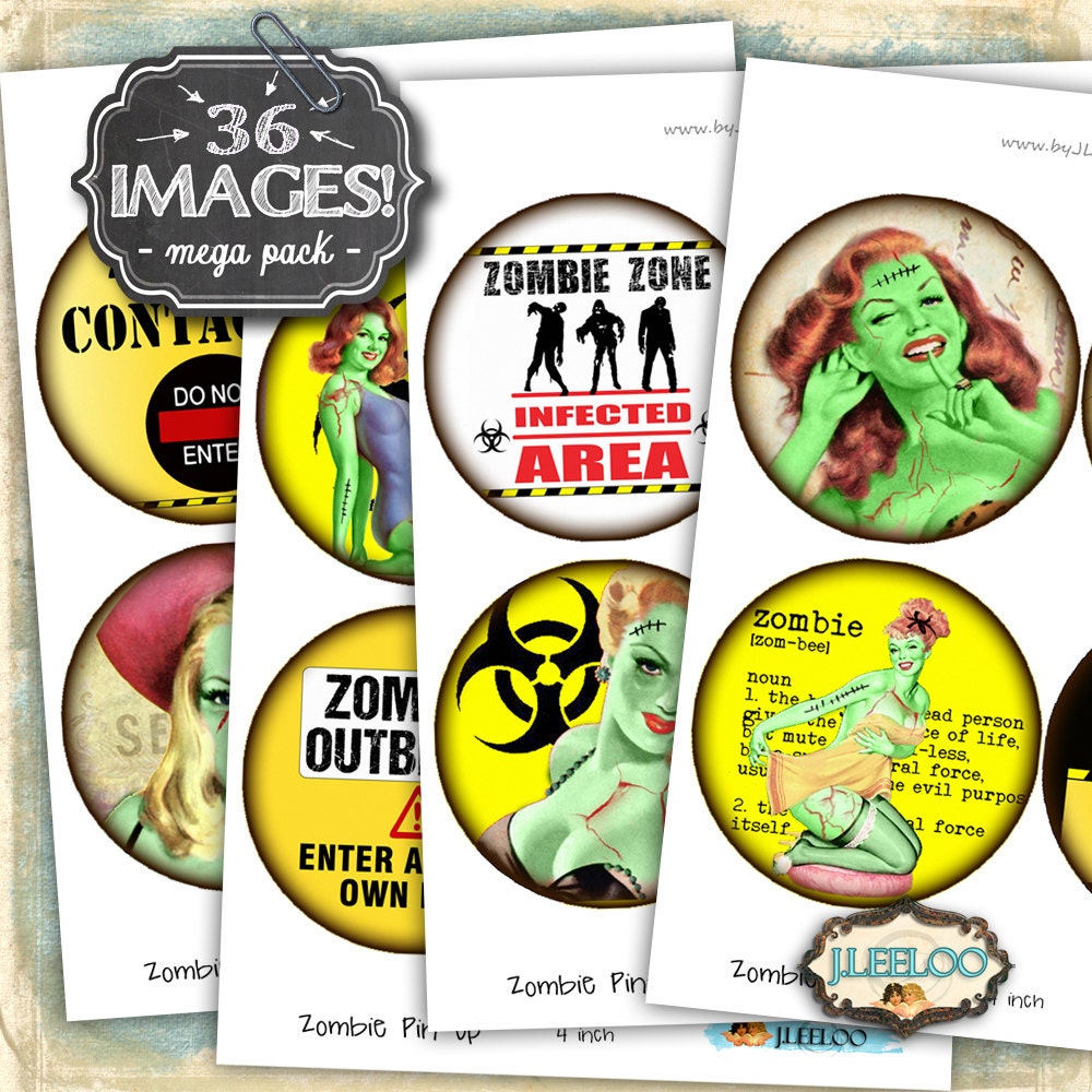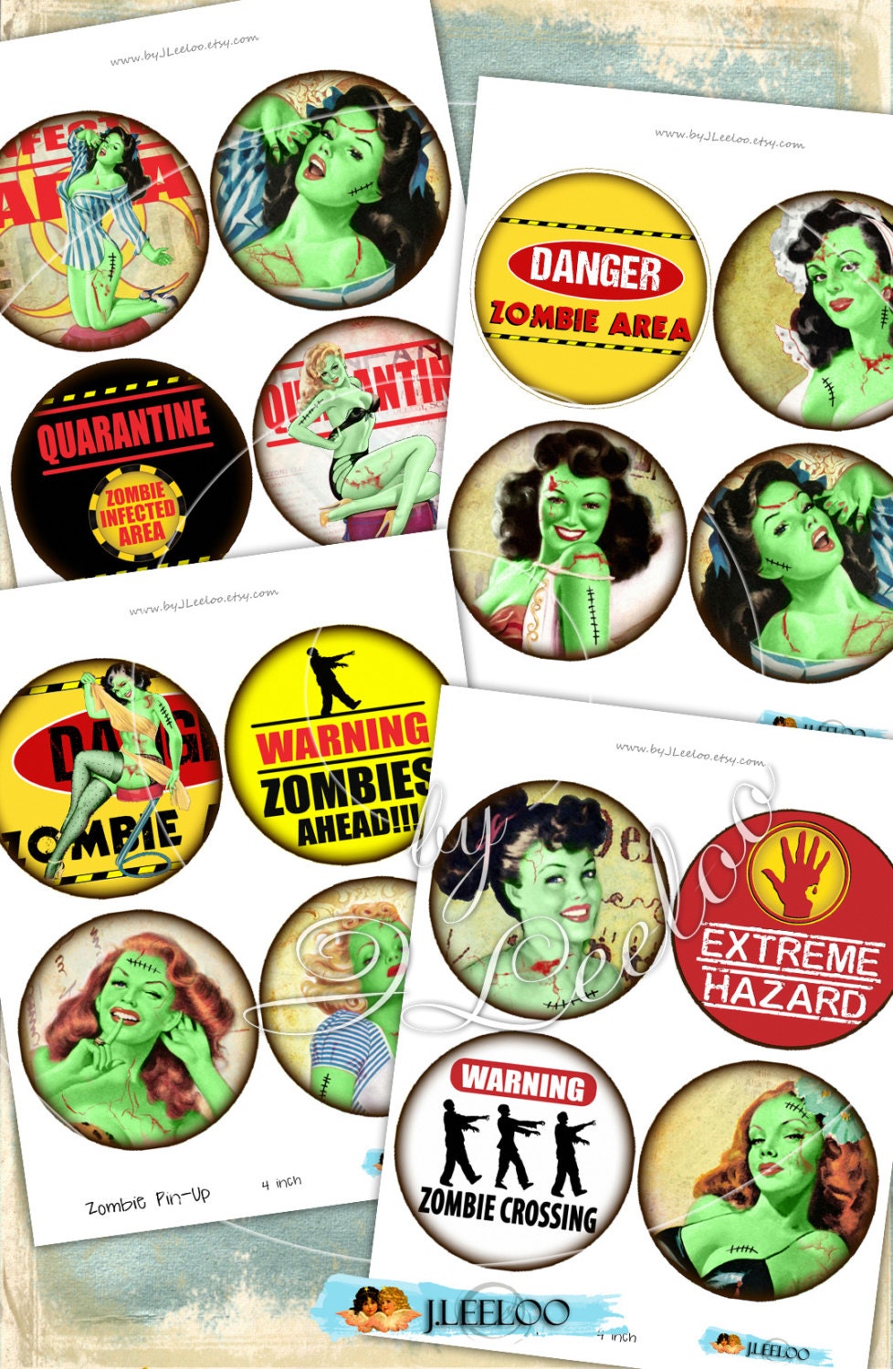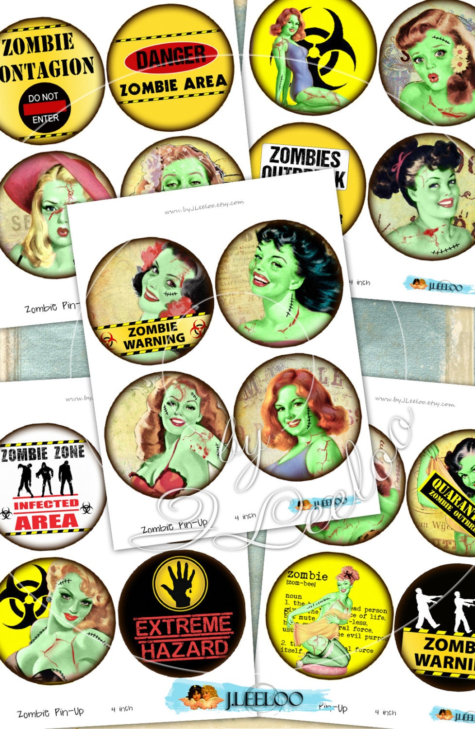 ZOMBIE PIN UP Instant Download - Digital collage sheets - circles printable images for coaster, jewelry holder, hang tags, glass cabochons, bottle caps, stickers and all your artwork.