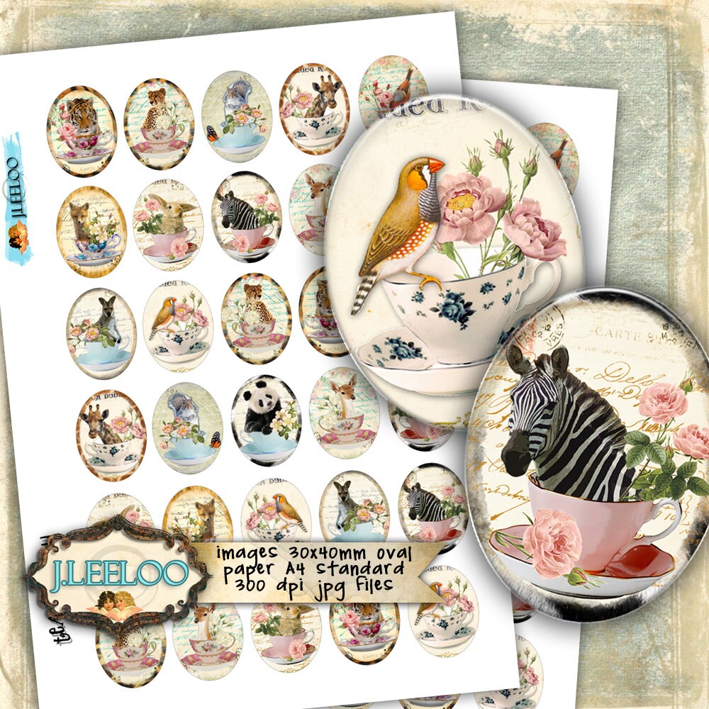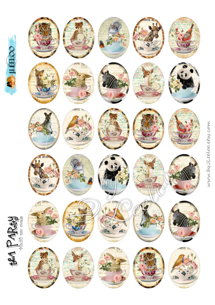 Digital collage TEACUP ovals for pendant jewelry with wild animal cabochon charms instant download printable ov136